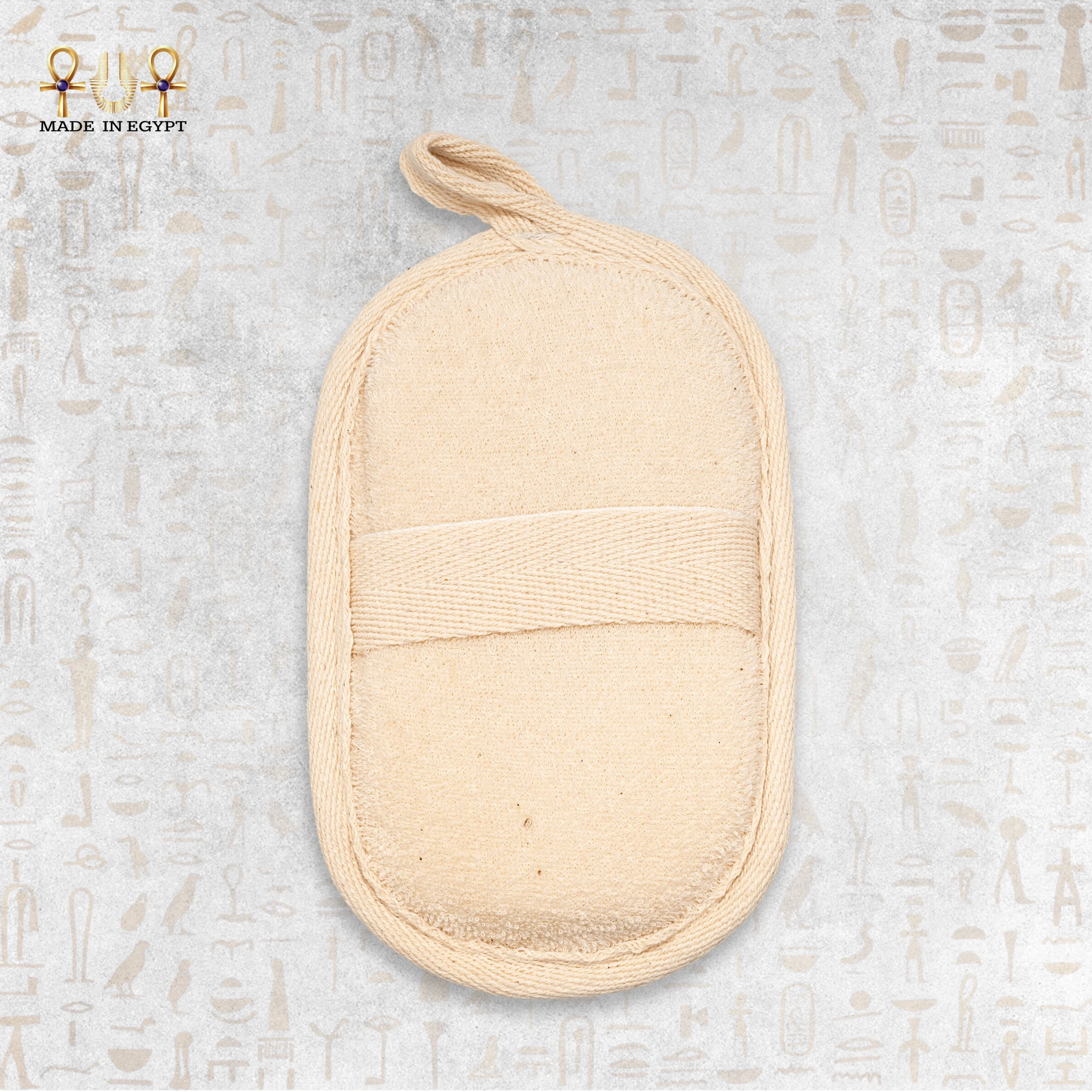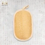 من الجهة الخلفية، الليفة مصنوعة من بشكير قطني ناعم عالي الجودة، لتوفير راحة أثناء الاستخدام وتثبيت اليد أثناء الحركة. التصميم البيضاوي مناسب لجميع مناطق الجسم مثل الرقبة، الكتفين، الظهر، والذراعين، ويوفر قدرة تحكم ممتازة أثناء الاستعمال. الإطار الخارجي مصنوع من شريط قطني متين يحافظ على شكل المنتج وجودته حتى مع الاستخدام اليومي.
