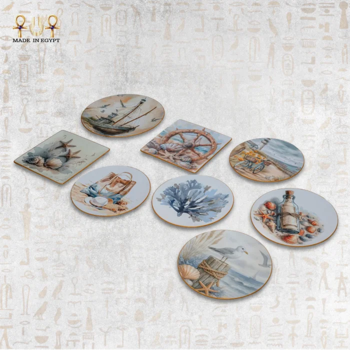 تتضمن التصاميم لوحة السفينة المبحرة بين طيور النورس، وزجاجة الرسائل القديمة بين الأصداف، بالإضافة إلى لوحة الشعاب البحرية بدرجات الأزرق الهادئة. كما تحتوي القطع الأخرى على القواقع ونجوم البحر، ما يضيف لمسة واقعية وحيوية.