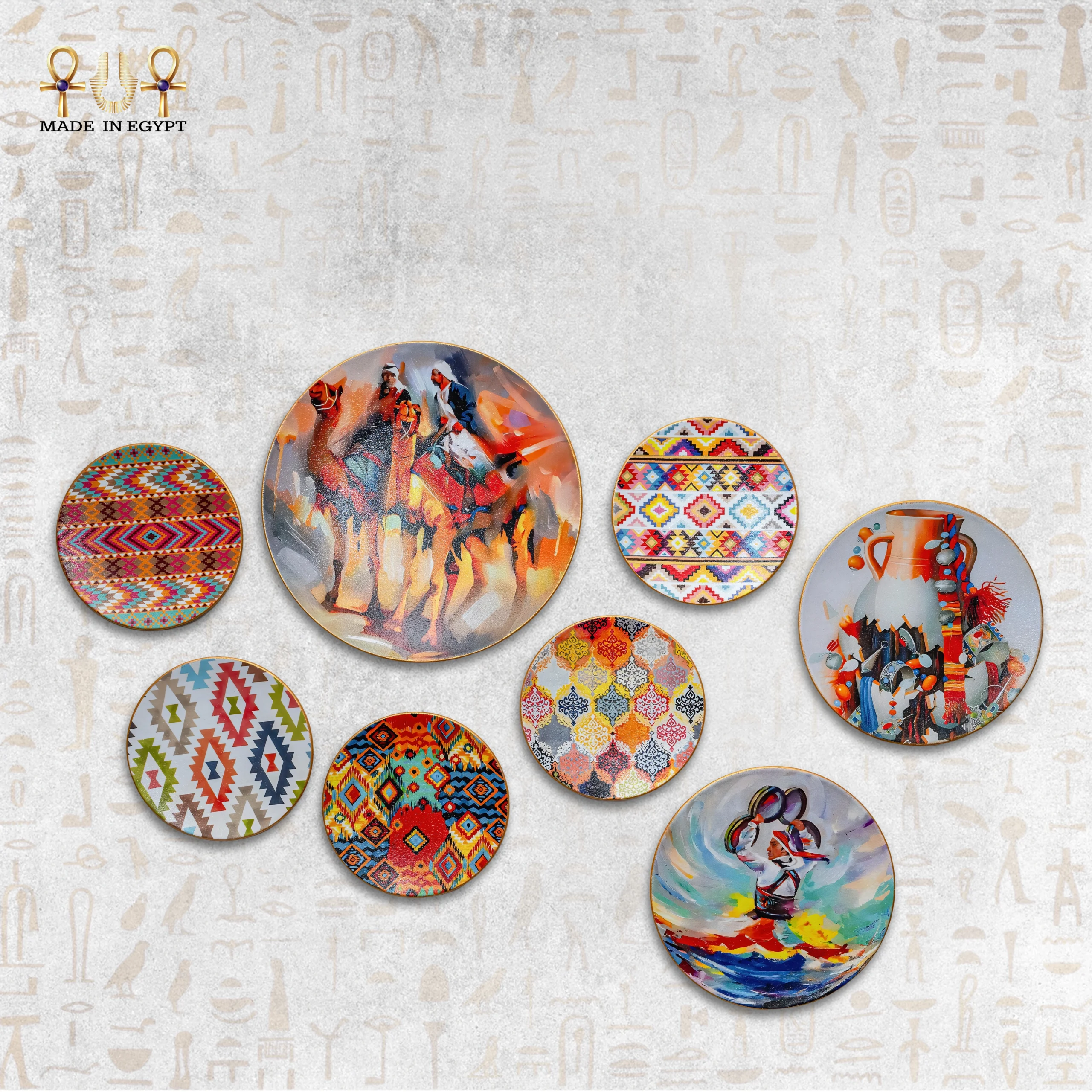 تصميمات مستوحاة من تراث البادية وألوانها المبهجة، تجمع بين مشاهد الجِمال والزخارف القبلية في لوحات مليانة حركة وحياة. قطع فنية تضيف حرارة وروح للمكان بأسلوب شرقي أصيل.