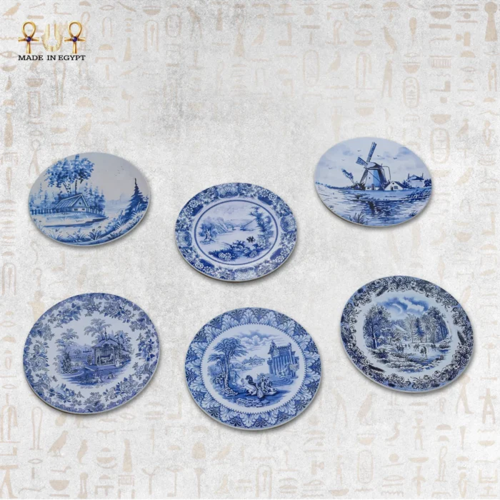 تُنفّذ المجموعة بتقنية ديكوباج احترافية على أطباق عالية الجودة لضمان ثبات الألوان ووضوح التفاصيل. كما تأتي الحواف بخط ذهبي بسيط يضيف لمسة فاخرة دون أن يغيّر من الطابع التقليدي للتصميمات. علاوة على ذلك، يمكن تعليق المجموعة على الحائط بشكل مرتب أو توزيعها كقطع منفصلة حسب مساحة المكان.
