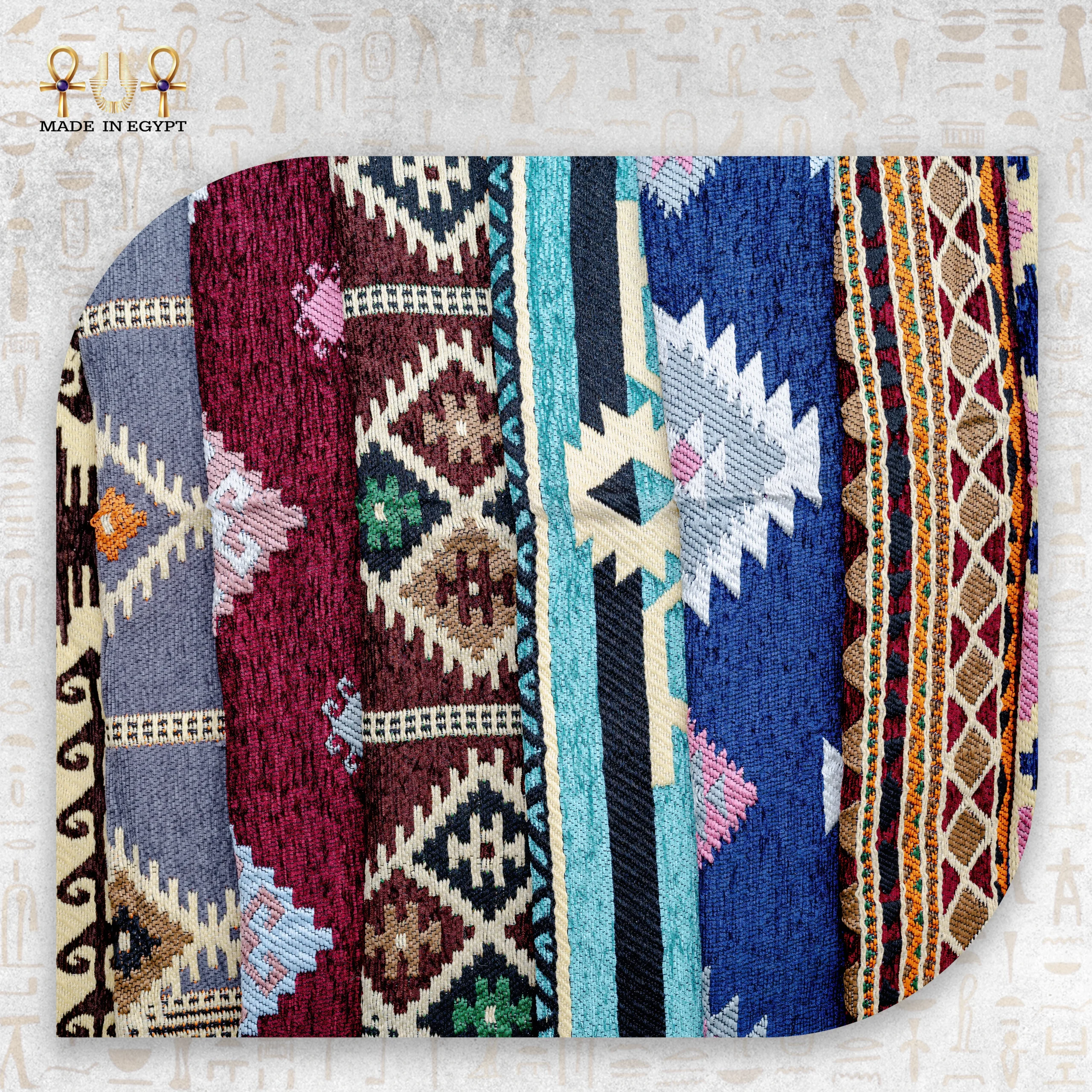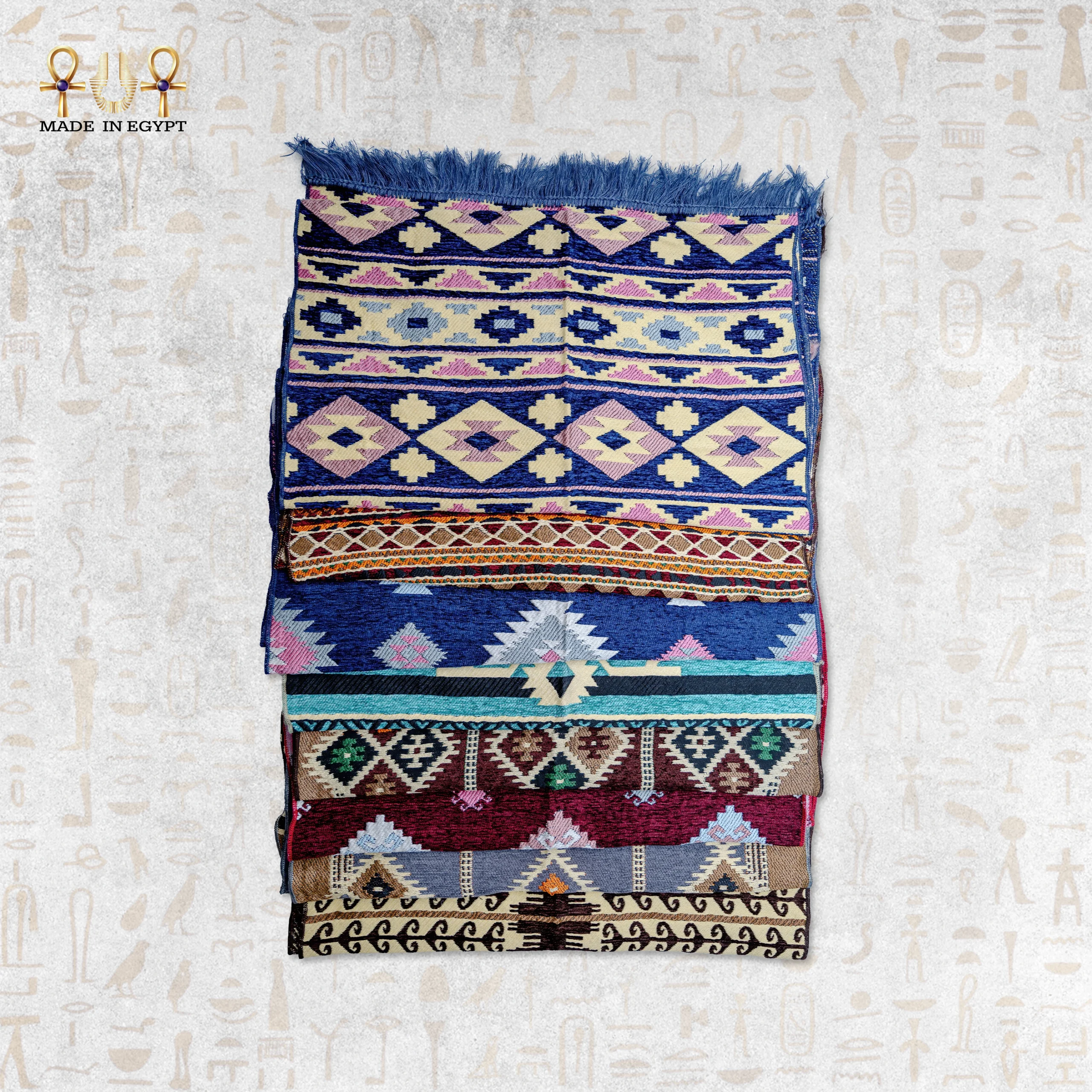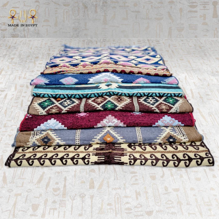 مجموعة كليم التراث – قطع يدوية الصنع – تمثل تحفة فنية حقيقية تعكس الحرفية المصرية الأصيلة وجمال التراث الشعبي. صُنعت هذه الكليمات بعناية فائقة على أيدي أمهر الحرفيين المصريين باستخدام خيوط الشانيل الفاخرة، لتجمع بين المتانة والنعومة في آن واحد. كل قطعة من هذه المجموعة هي لوحة فنية مستقلة تحمل رموزًا وزخارف هندسية مستوحاة من التراث المصري القديم، مع توازن دقيق بين الألوان الغنية والتفاصيل الدقيقة.