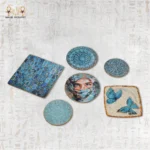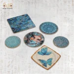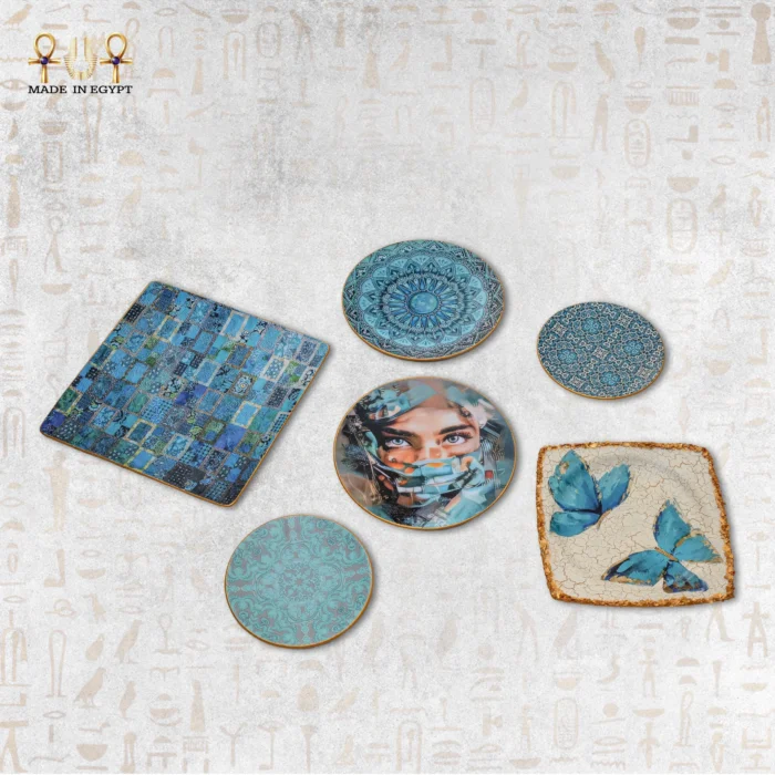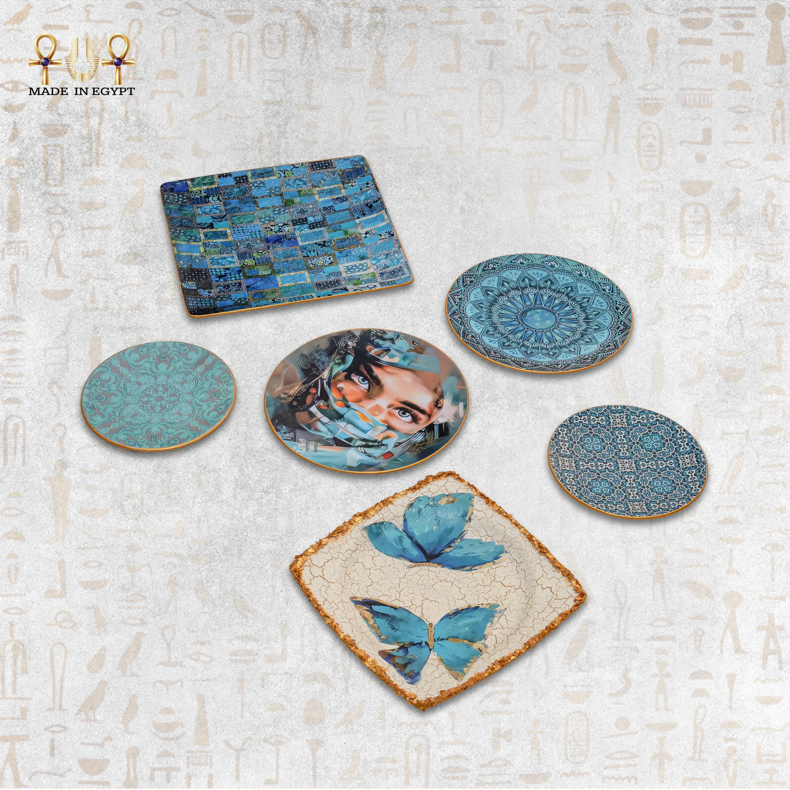 بالإضافة إلى ذلك، تحتوي المجموعة على لوحات مزخرفة بزخارف هندسية ونقوش دقيقة مستوحاة من الفنون الشرقية، مما يكمل الطابع الفني العام. كما تضيف لوحة الفراشات إحساسًا بالرقة والحركة، ما يعزز توازن المجموعة ويمنحها روحًا متجددة. علاوة على ذلك، تناغم الألوان بين الأزرق والذهبي الخفيف والبيج يخلق جمالية متناسقة تناسب غرف المعيشة، غرف النوم، المكاتب، أو أي زاوية تحتاج إلى لمسة فنية مميزة.