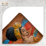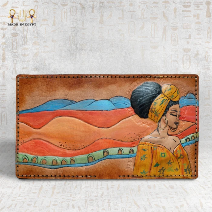 محفظة رمال النوبة مصنوعة يدويًا من جلد طبيعي مصري ومرسومة يدويًا بألوان نابضة مستوحاة من جمال النوبة، تجمع بين الفن والتراث في تصميم فريد يحمل مشهدًا طبيعيًا بديعًا وامرأة نوبية أنيقة.