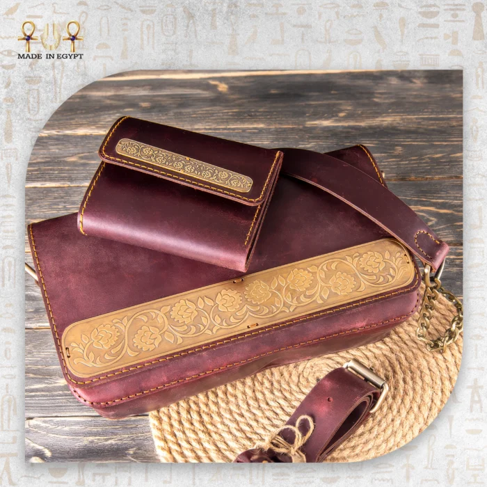 محفظة جلد طبيعي فاخرة بلون المارون، مزينة بزخرفة نحاسية مستوحاة من الفن الإسلامي.