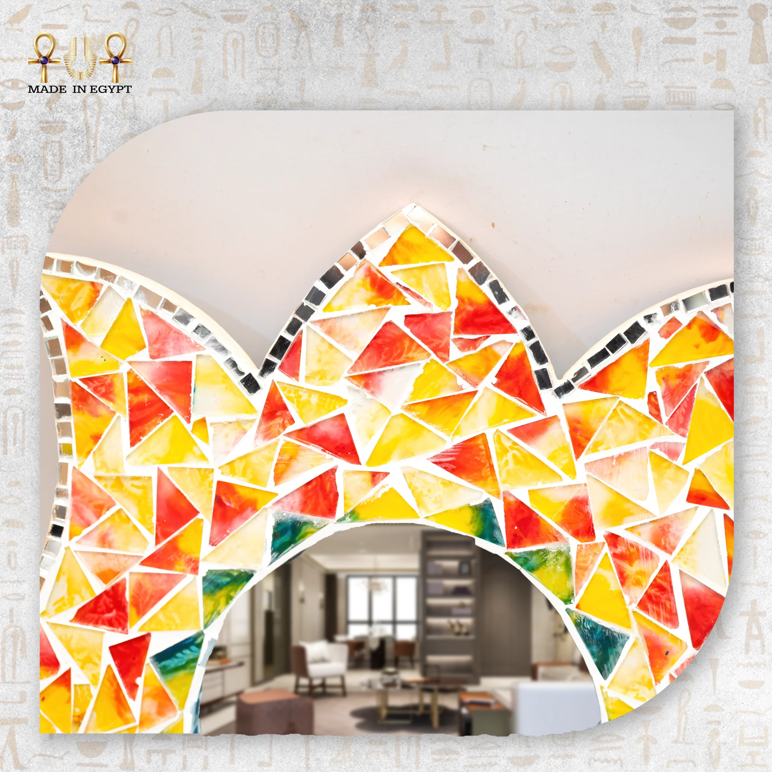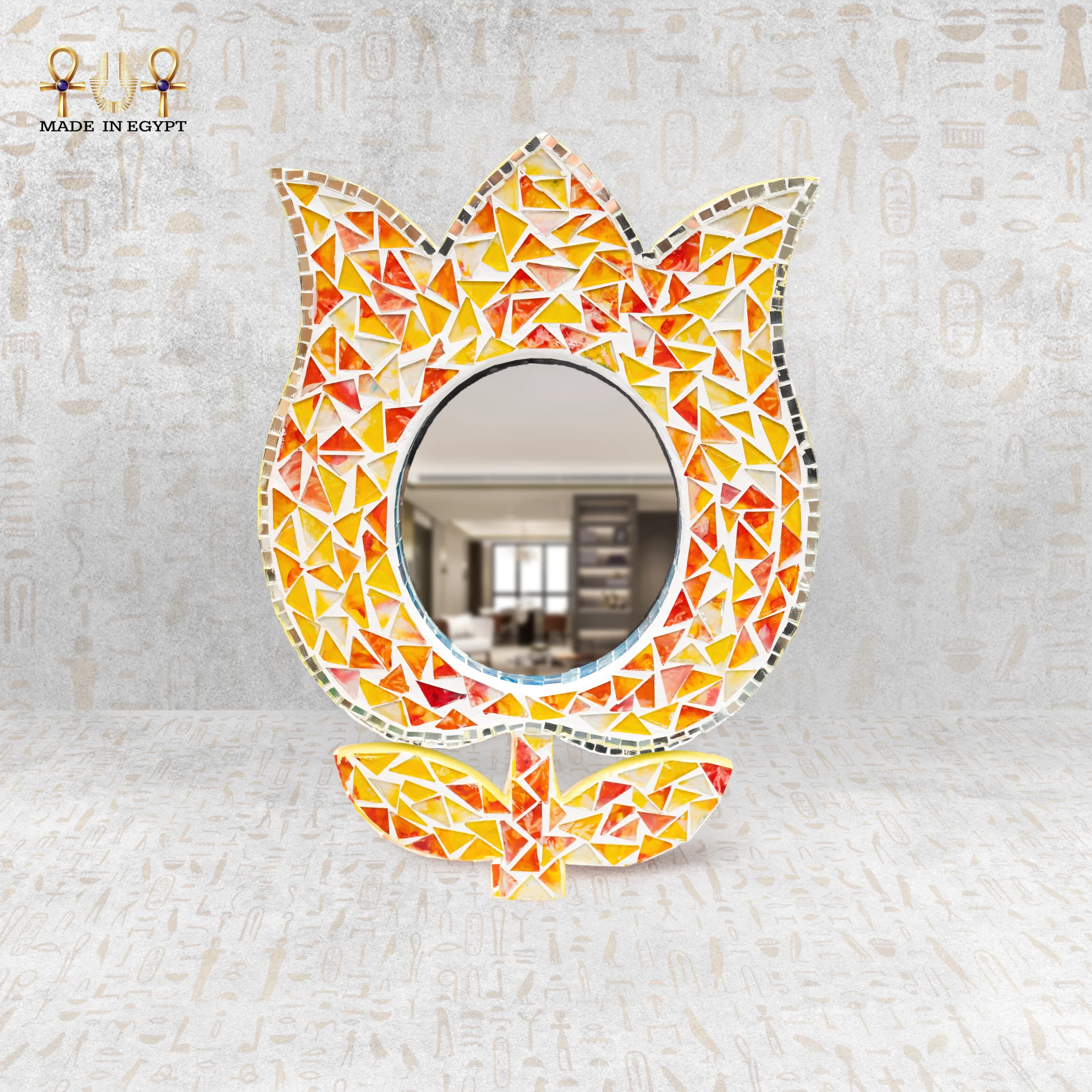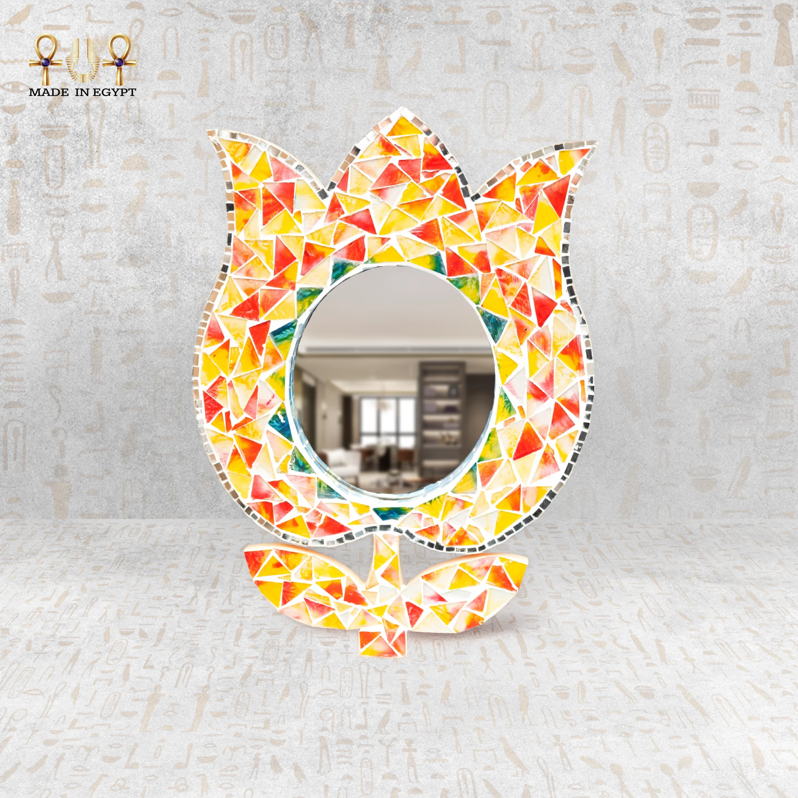 تُعد مرآة البتلات قطعة فنية مميزة مستوحاة من جمال الزهور الطبيعية وتفاصيلها الرقيقة، حيث يجسد تصميمها شكل البتلات المتفتحة التي تضيف إحساسًا بالحيوية والنعومة إلى أي مساحة. يتميز الإطار بزخارف فسيفساء مصنوعة من زجاج ملون يدويًا، حيث تتدرج الألوان بين الأحمر والأصفر مع لمسات من الأخضر، مما يمنح المرآة طابعًا دافئًا يعكس جمال الطبيعة وروحها.