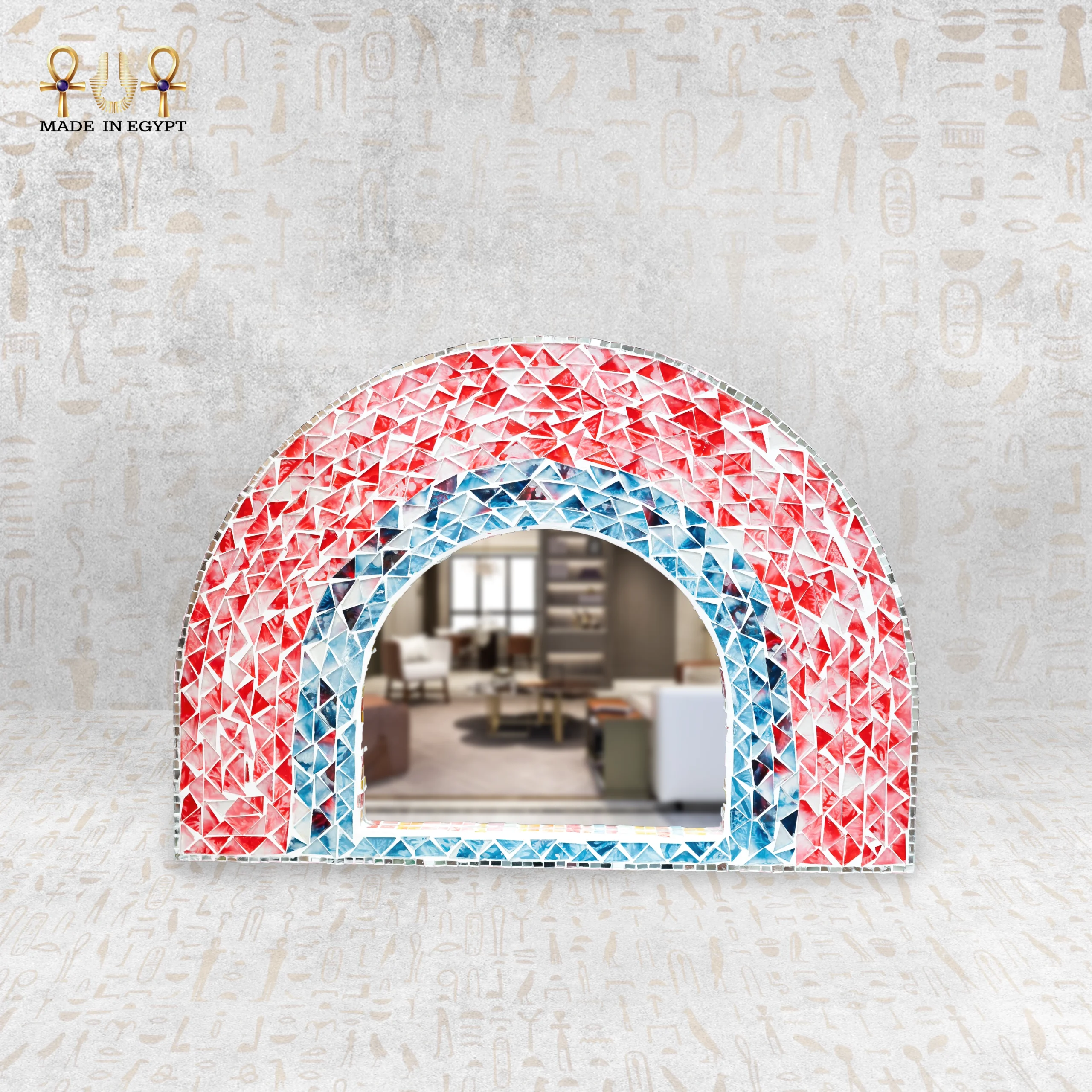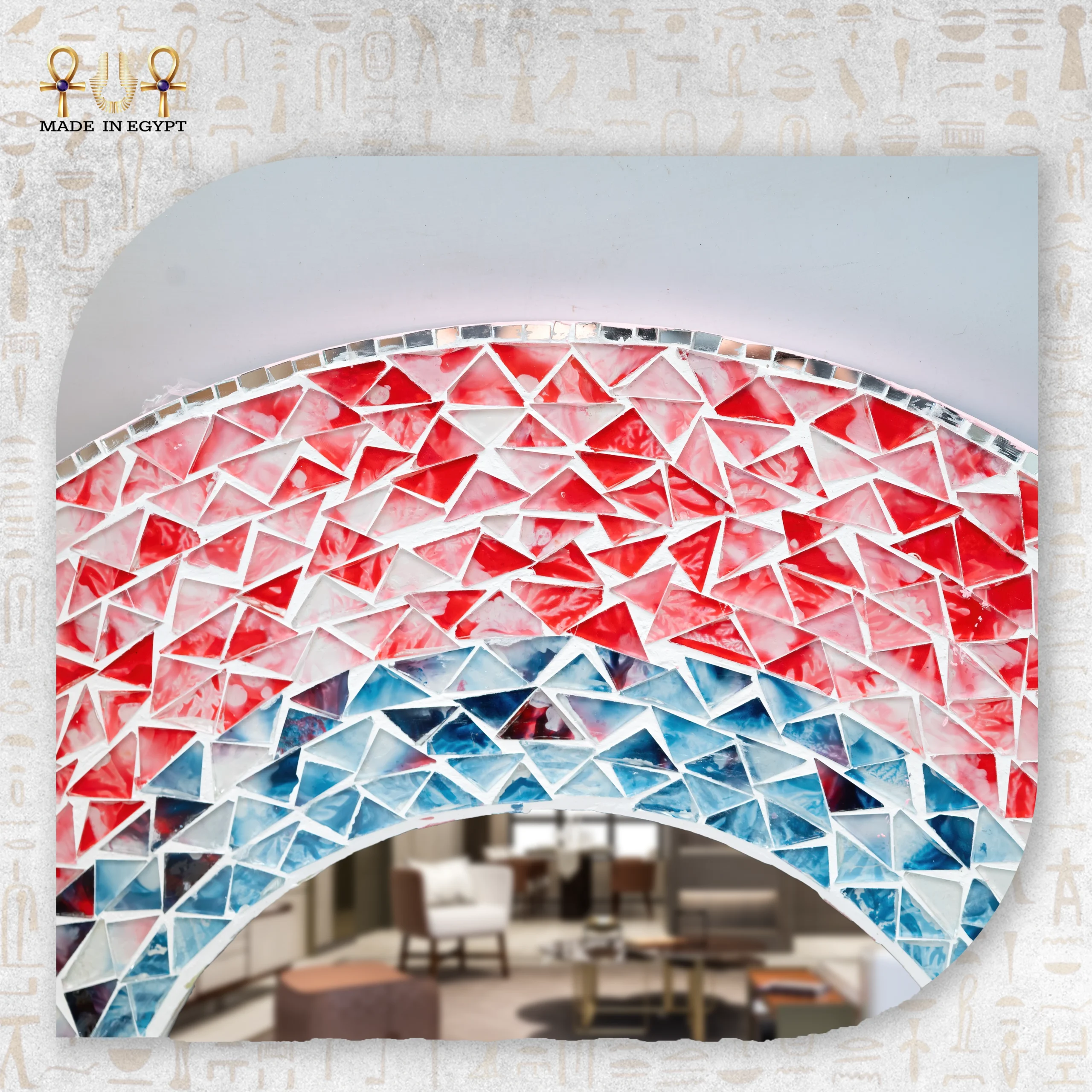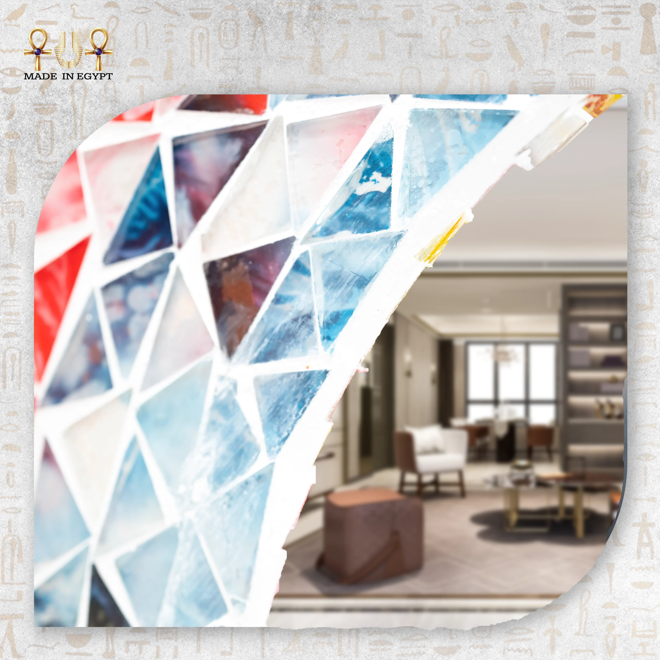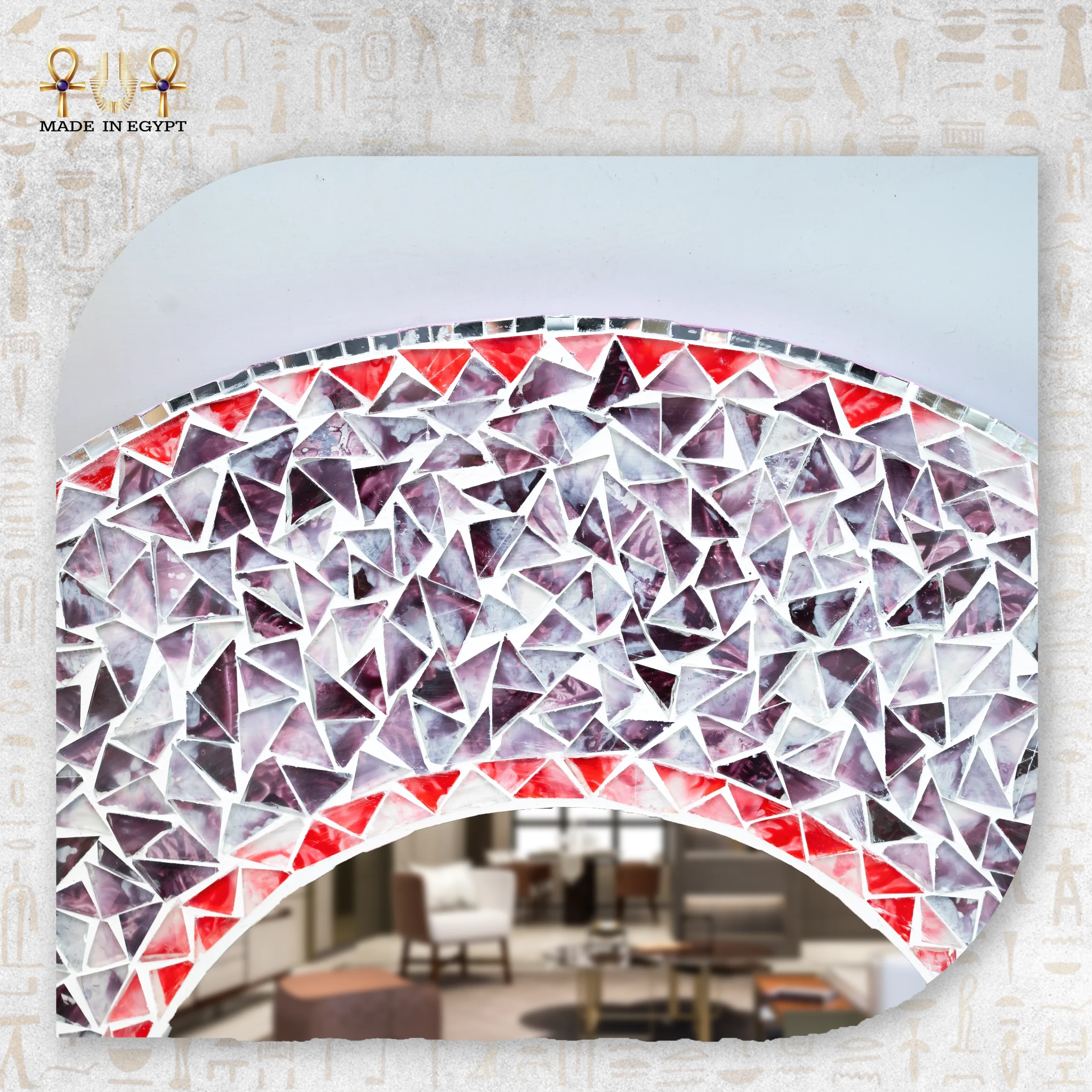 يحتوي الإطار على زخارف فسيفساء دقيقة مصنوعة من الزجاج الملون يدويًا. يوزع الحرفيون القطع بعناية لإبراز التصميم بشكل متناسق وجذاب. كما تتناغم درجات الأبيض والرمادي مع لمسات خفيفة من الأحمر، مما يمنح القطعة مظهرًا راقيًا. لذلك، تعكس المرآة الضوء بشكل ناعم وتضيف إحساسًا بالهدوء والأناقة.