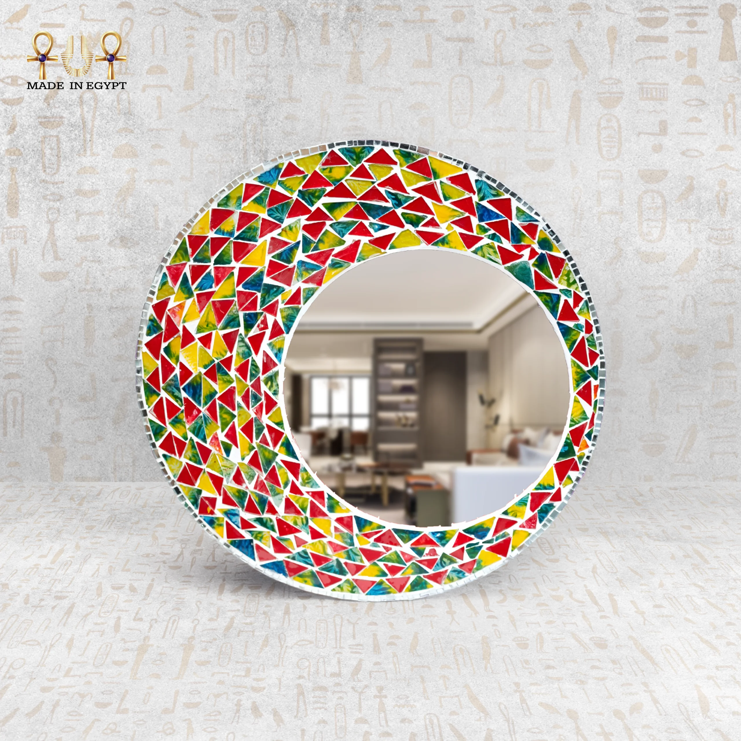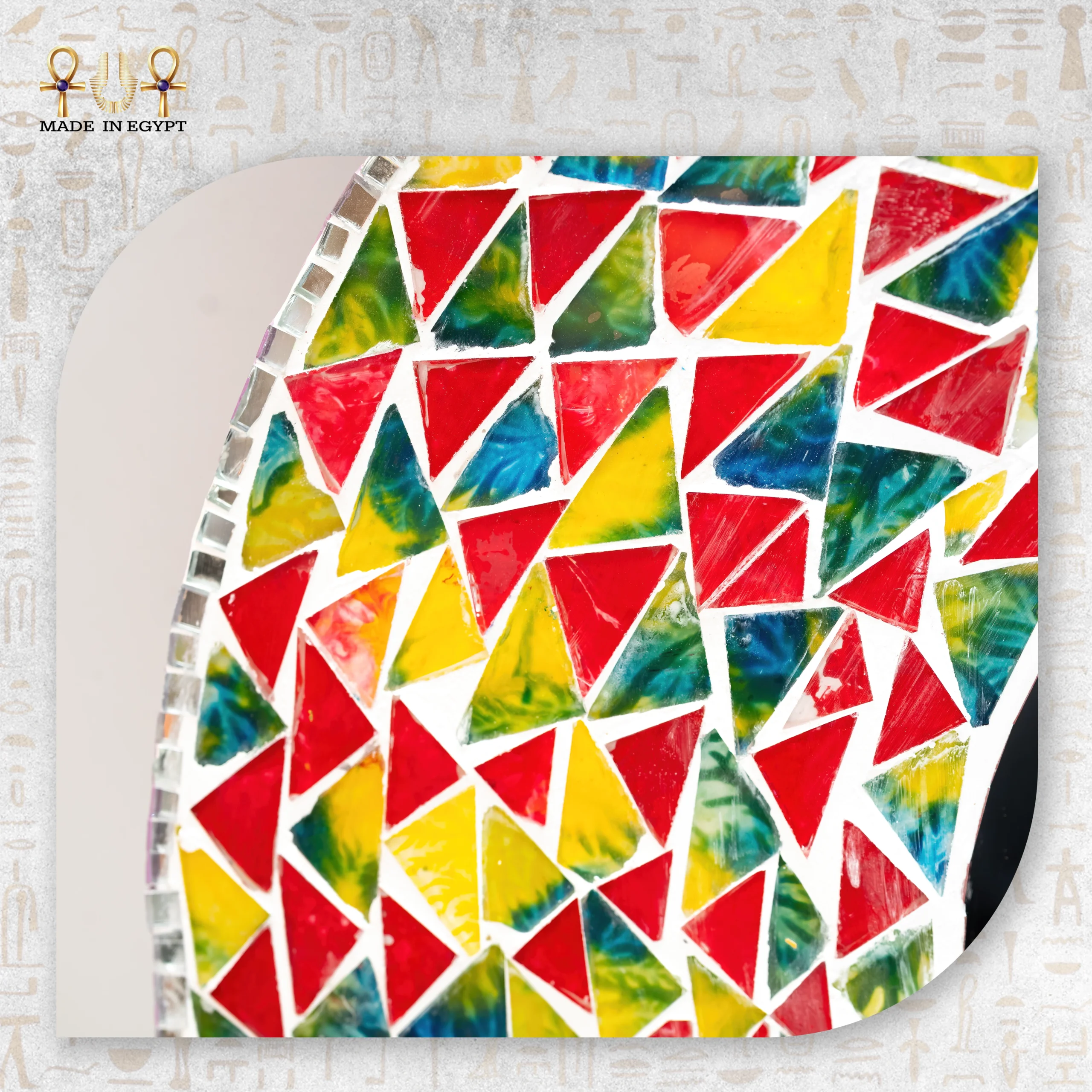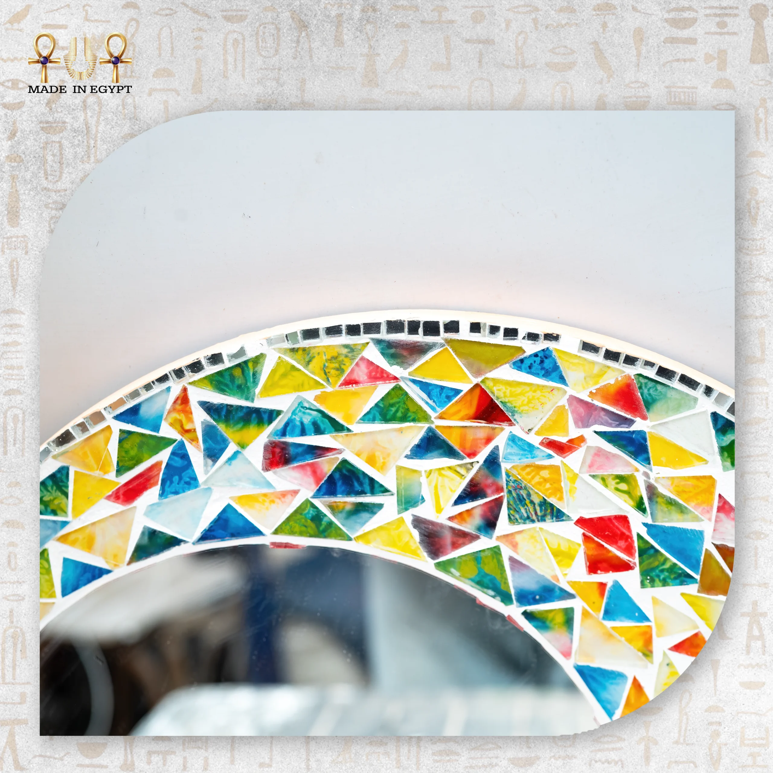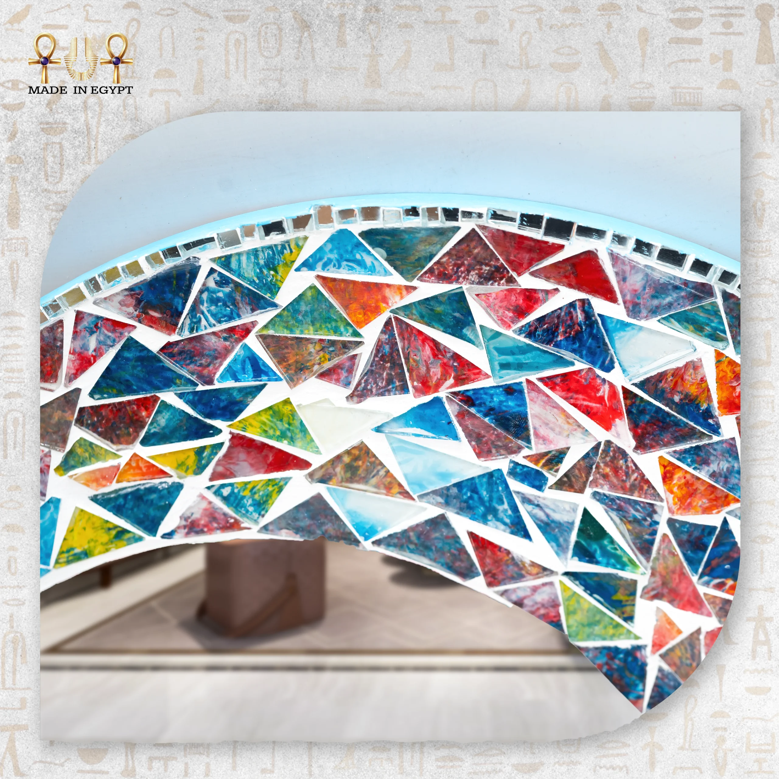 يحتوي الإطار على زخارف فسيفساء ملونة مصنوعة من الزجاج اليدوي. يوزع الحرفيون القطع بعناية لتكوين تصميم متناسق وجذاب. كما تتناغم الألوان بين الأزرق والأحمر والأصفر والأخضر في لوحة فنية مبهجة. لذلك، تعكس المرآة الضوء بشكل جميل، مما يمنح المكان إشراقة مميزة ويضيف طاقة إيجابية.