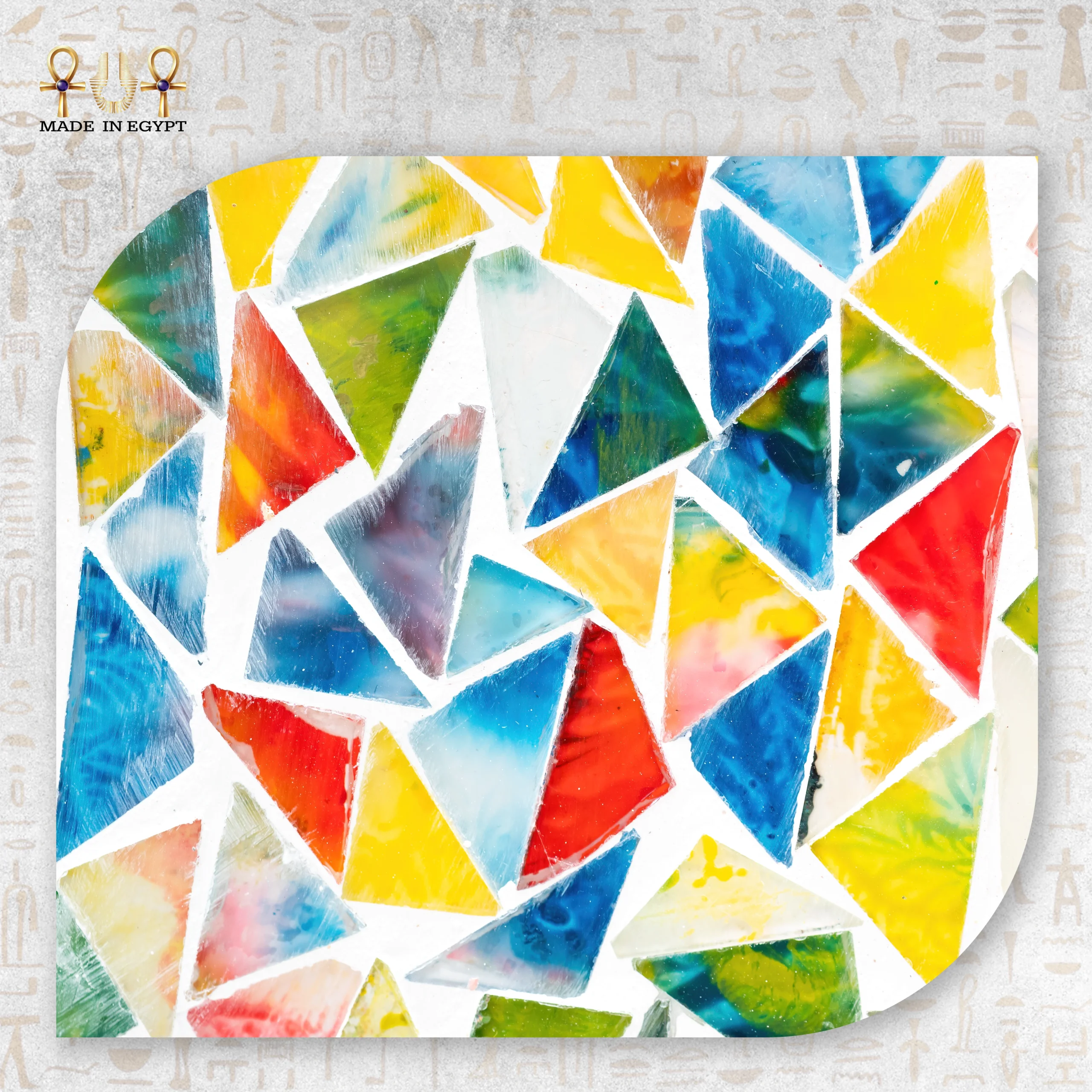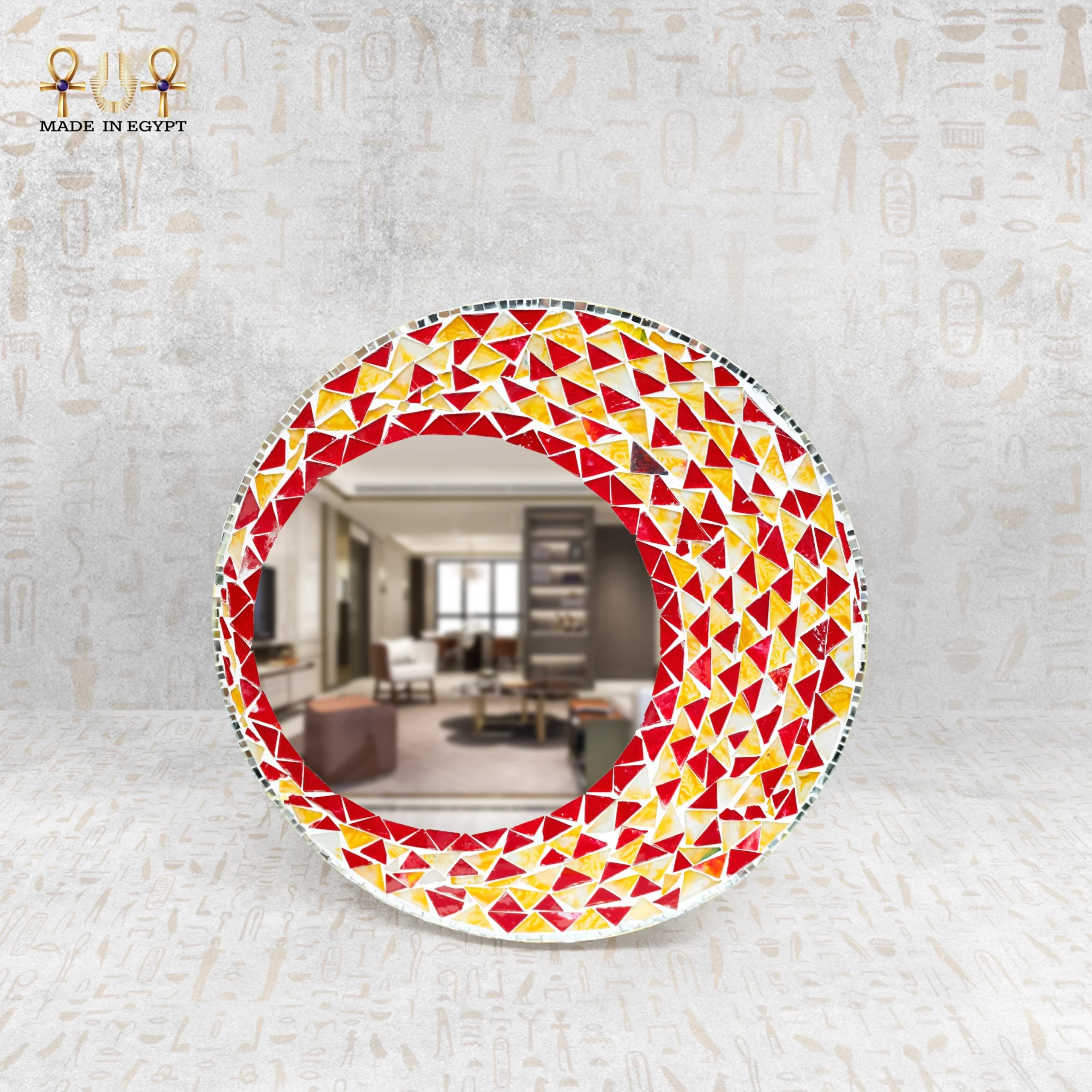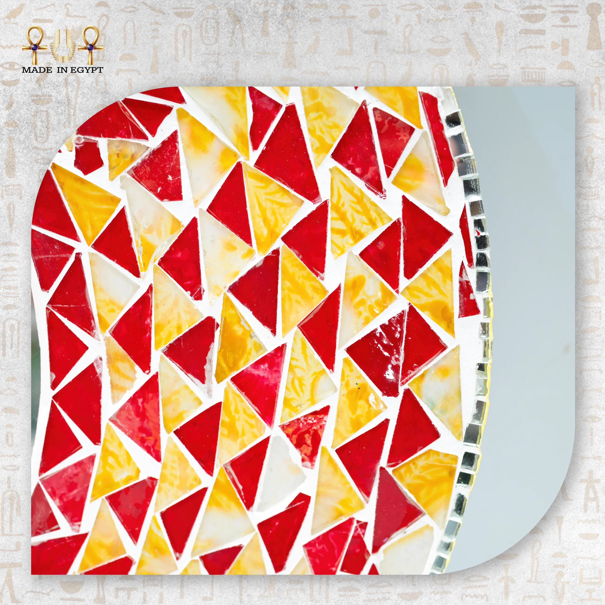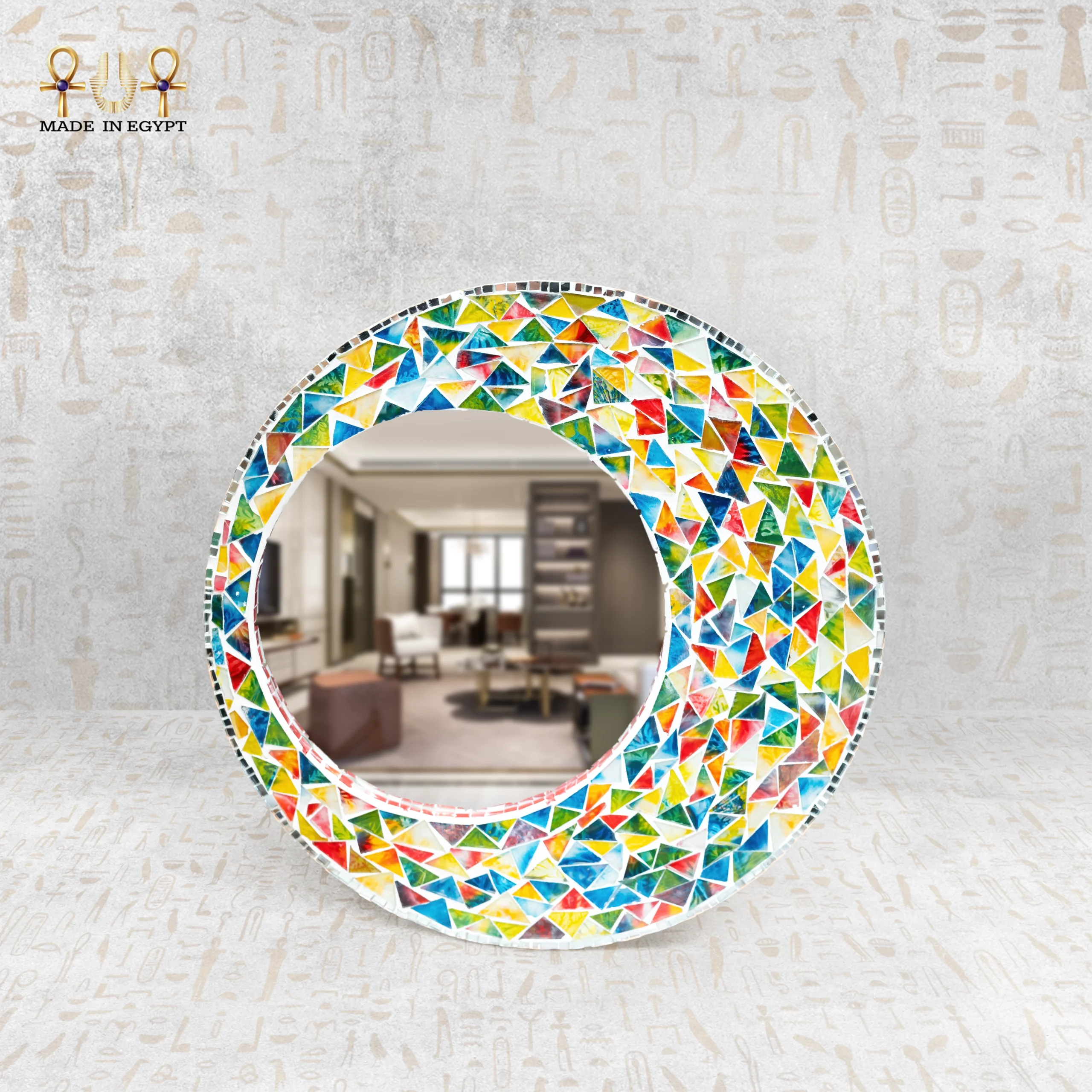 يحتوي الإطار على زخارف فسيفساء ملونة مصنوعة من الزجاج اليدوي. يوزع الحرفيون القطع بعناية لتكوين تصميم متناسق وجذاب. كما تتناغم الألوان بين الأزرق والأحمر والأصفر والأخضر في لوحة فنية مبهجة. لذلك، تعكس المرآة الضوء بشكل جميل، مما يمنح المكان إشراقة مميزة ويضيف طاقة إيجابية.