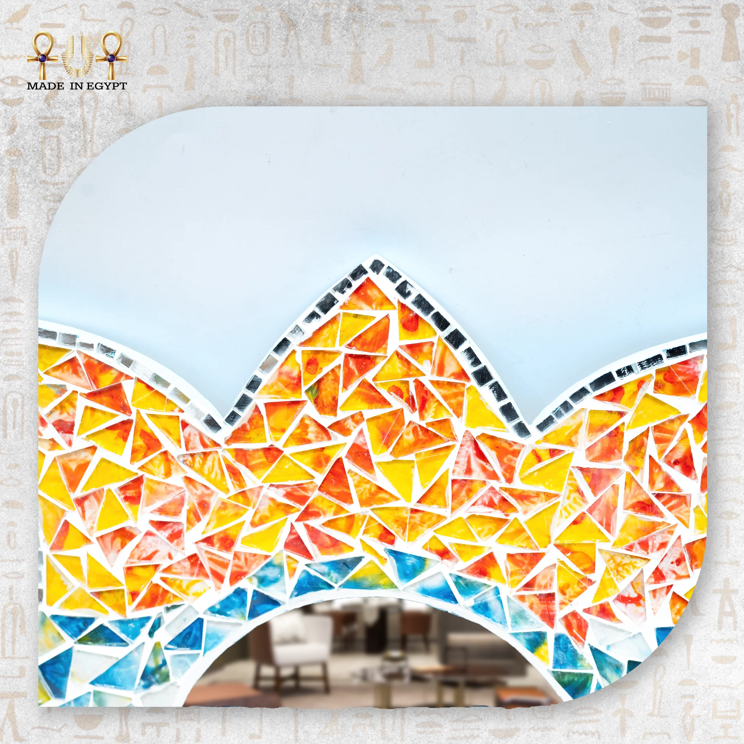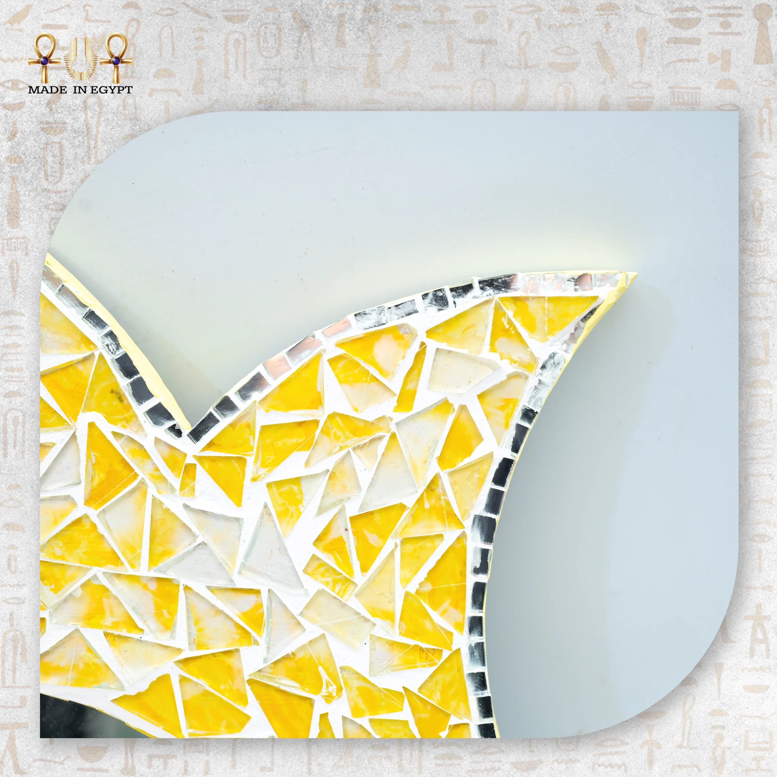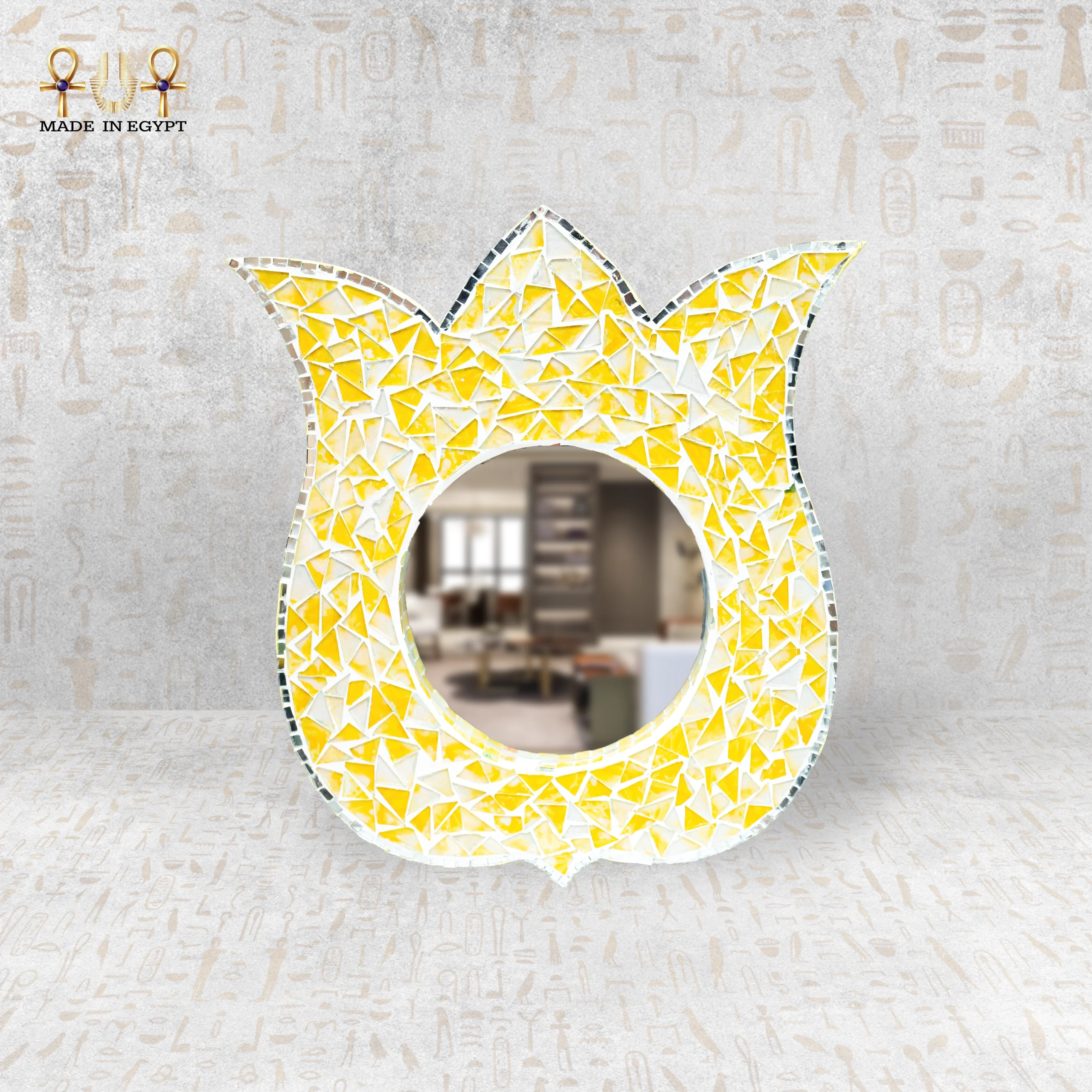 تحتوي المرآة على تفاصيل من الزجاج الملون المصنوع يدويًا. يوزع الحرفيون القطع بعناية لإبراز شكل الزهرة بأسلوب فني جذاب. كما تتدرج الألوان بين الأصفر والأبيض مع لمسات دافئة تضيف إشراقًا طبيعيًا. لذلك، تعكس مرآة الزهرة الضوء بطريقة ناعمة، مما يعزز من جمال المكان ويخلق أجواء مريحة ومشرقة.