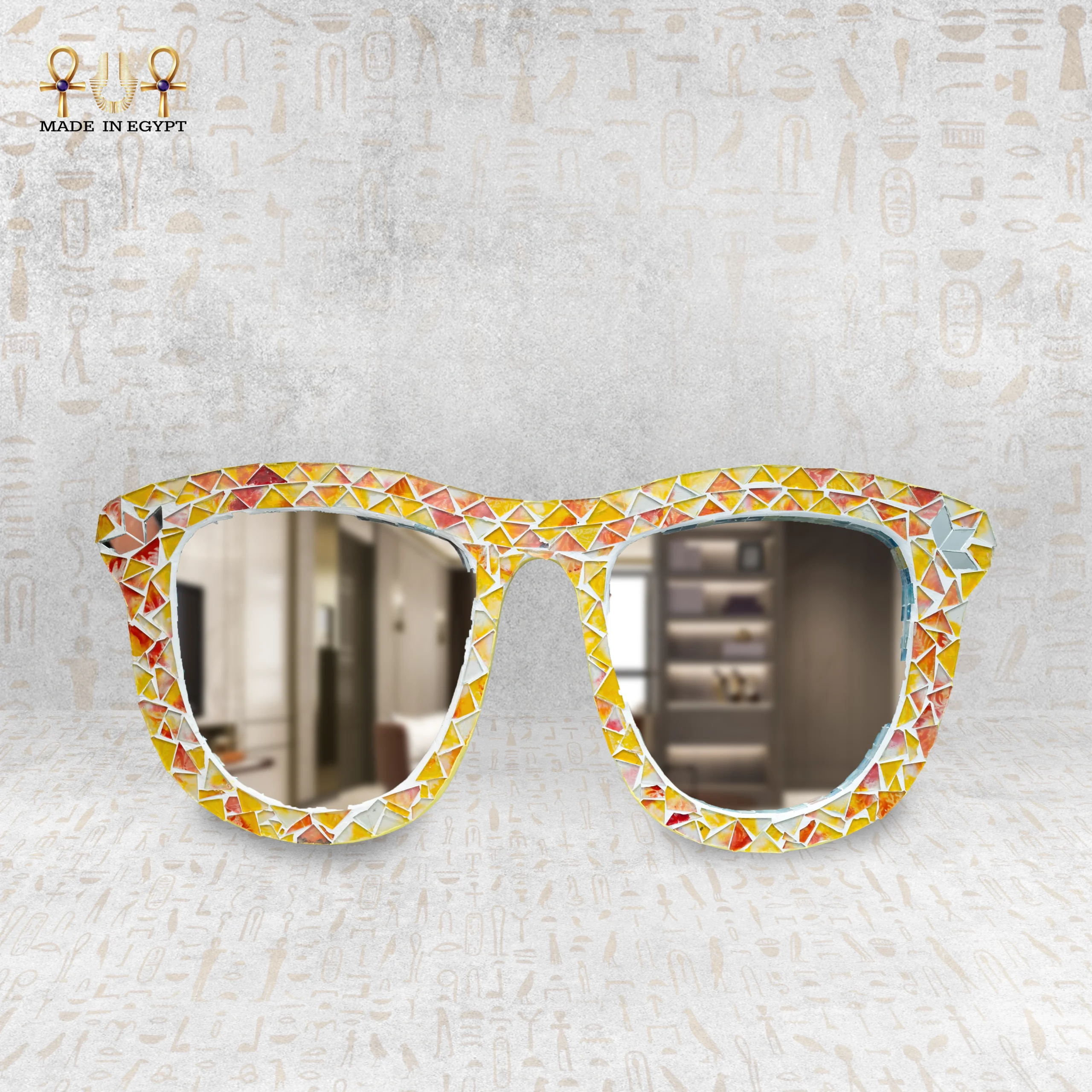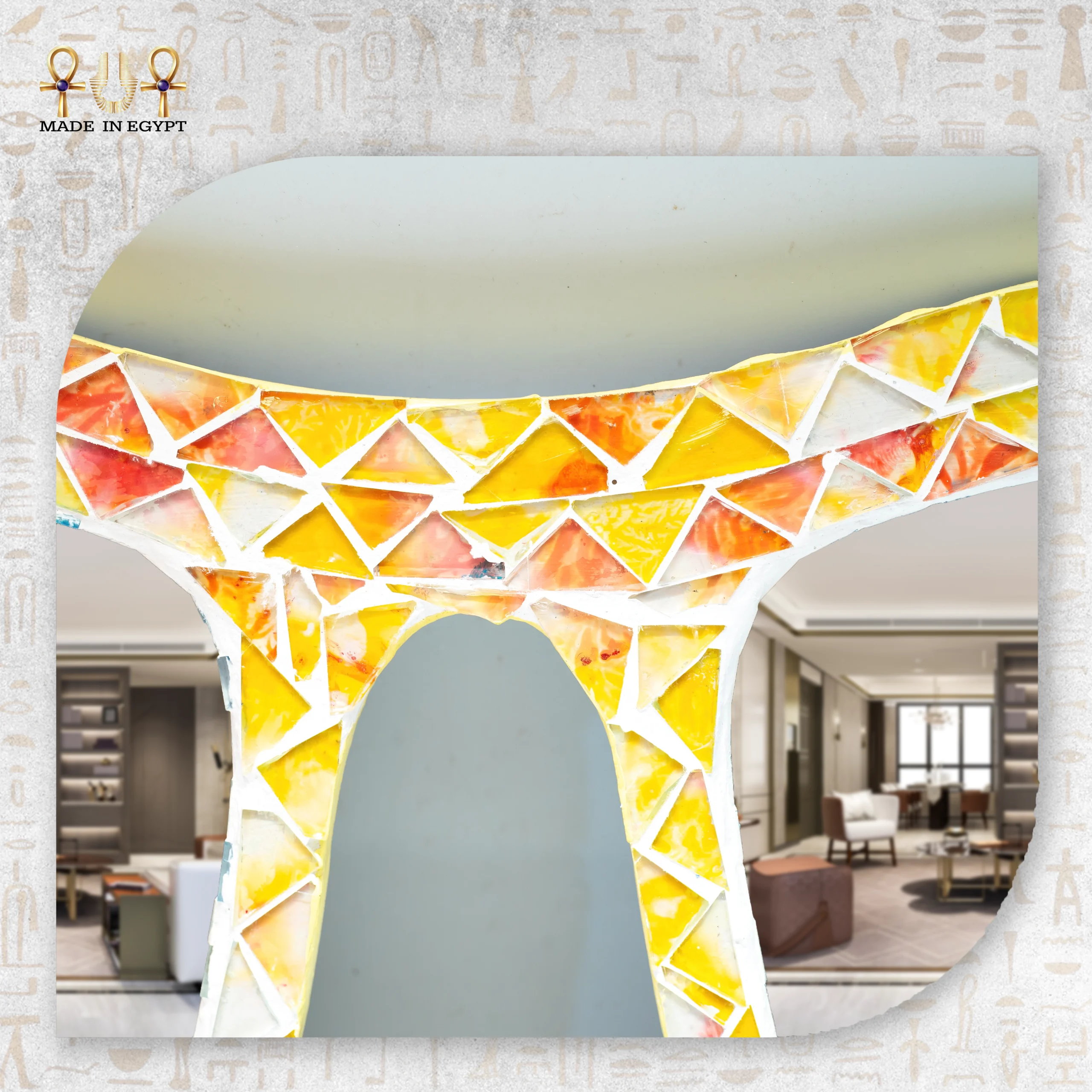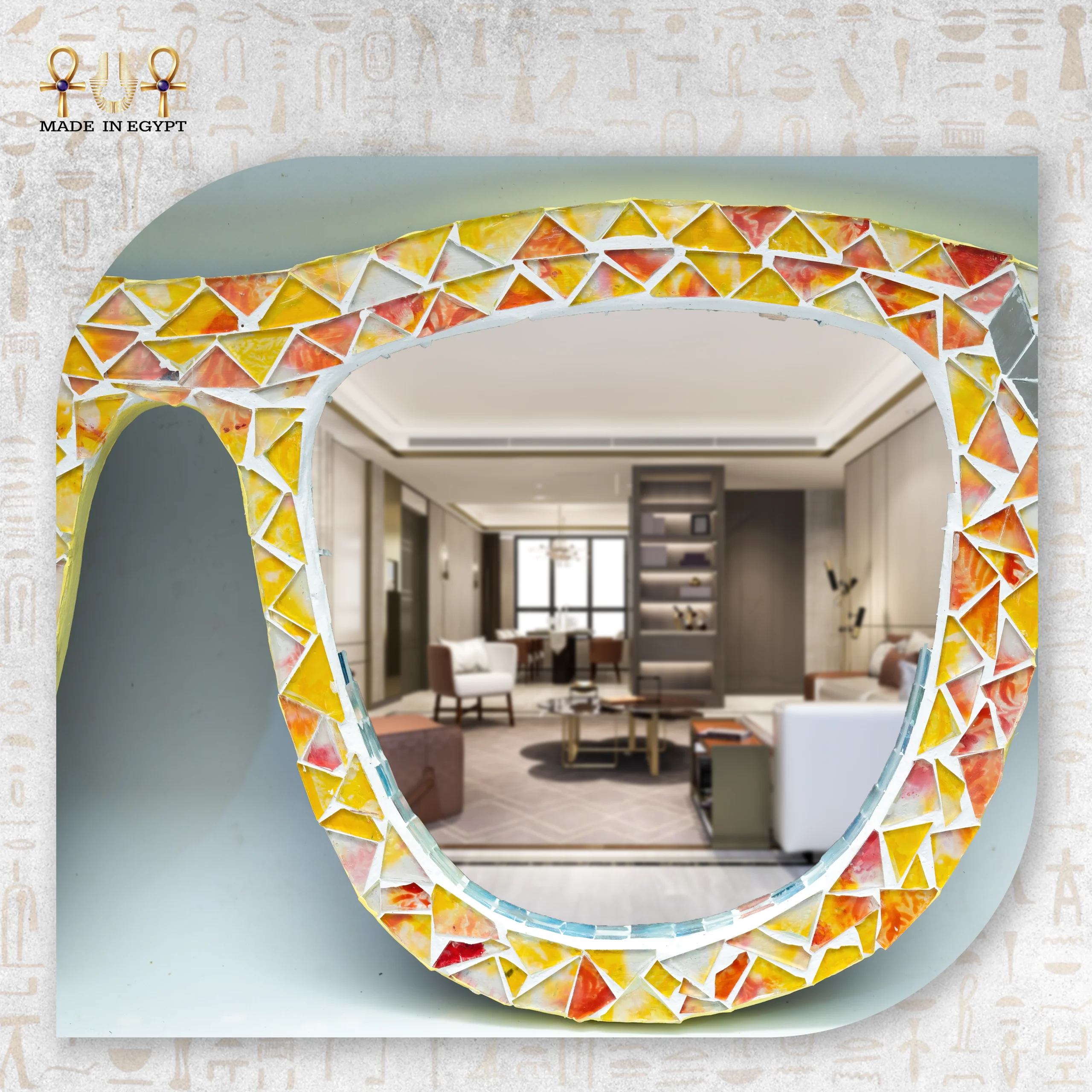 يتميز الإطار بزخارف فسيفساء دقيقة مصنوعة من زجاج ملون يدويًا، حيث تتدرج الألوان بين الأصفر والبرتقالي مع لمسات فاتحة تضيف إشراقة وحيوية للقطعة. يعكس هذا التناغم اللوني الضوء بشكل جميل، مما يمنح المكان إحساسًا بالدفء والطاقة الإيجابية.