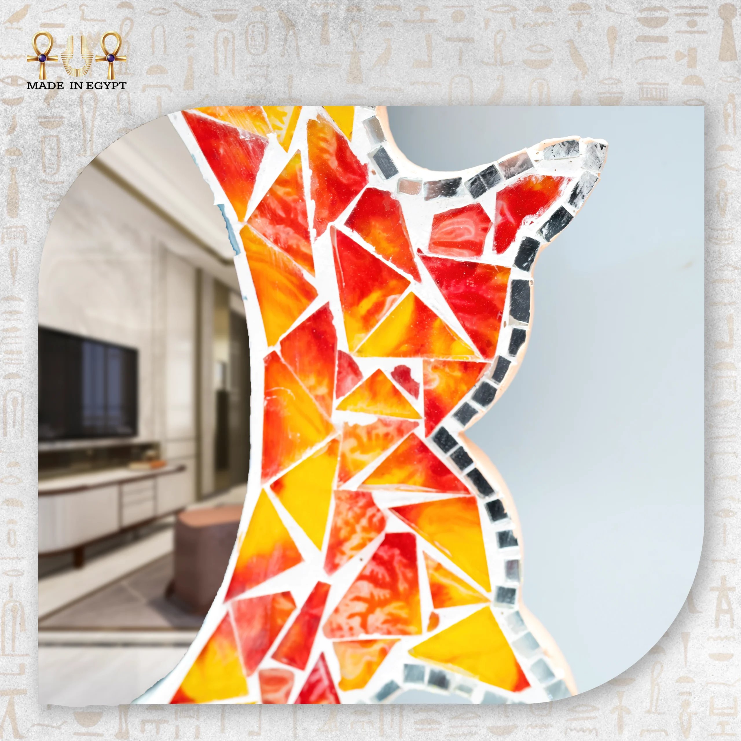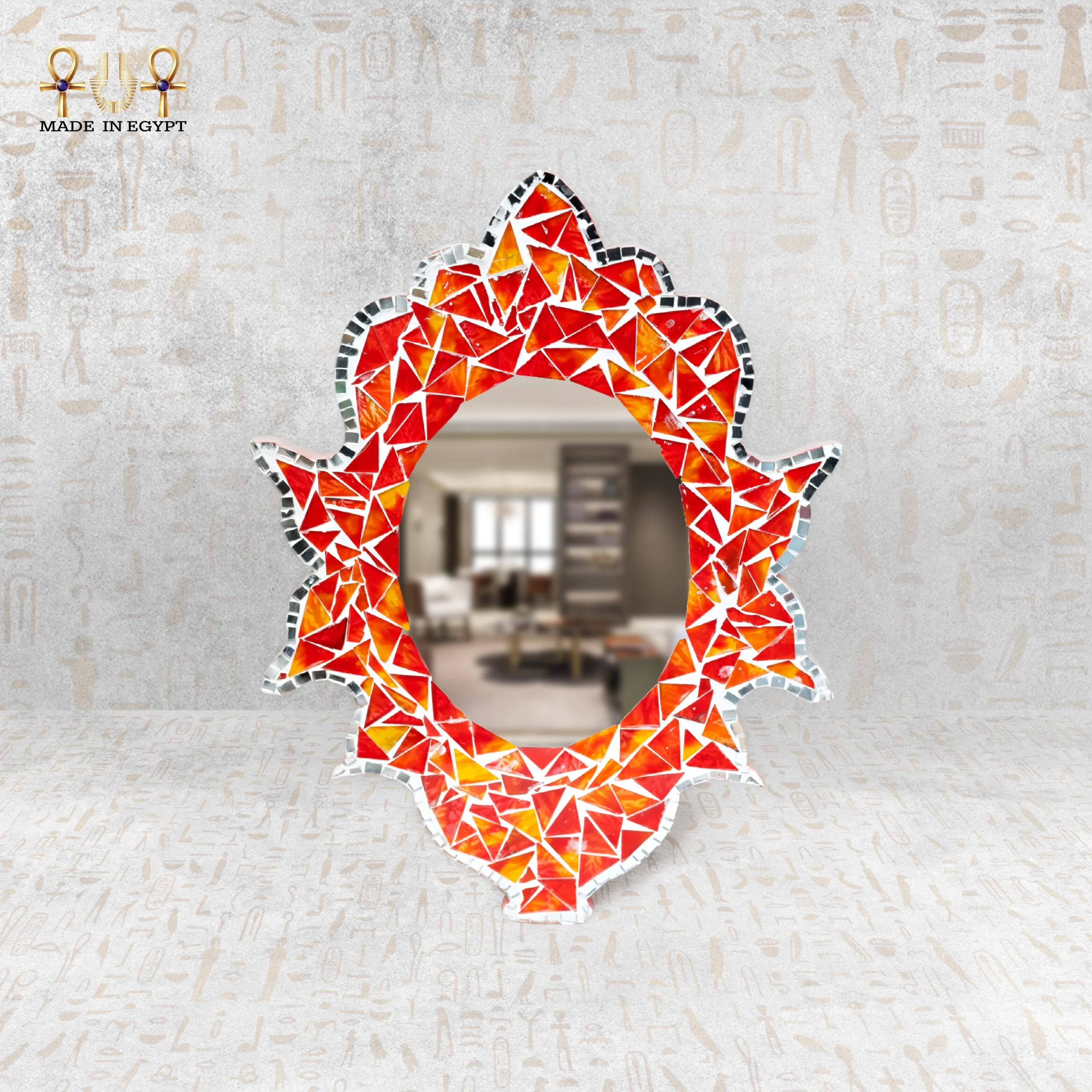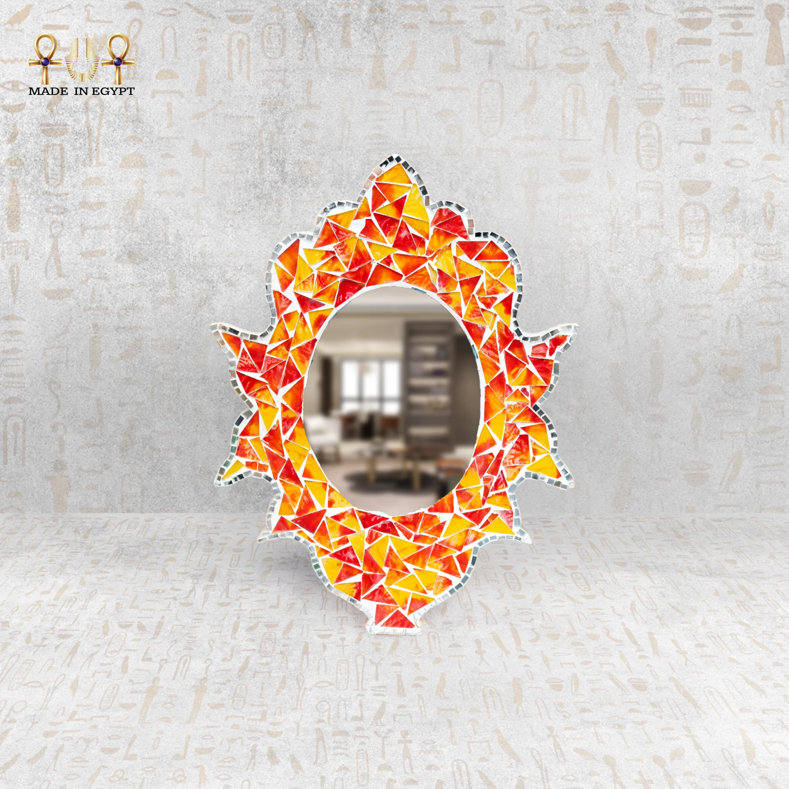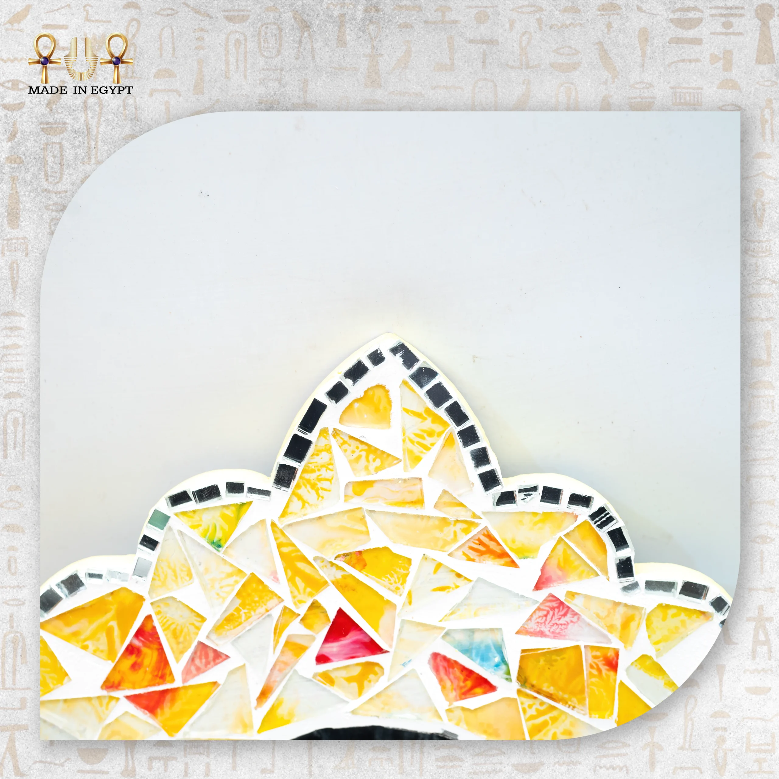 يحتوي الإطار على تفاصيل من الزجاج الملون المصنوع يدويًا. يوزع الحرفيون القطع بعناية لإبراز شكل أشعة الشمس بأسلوب فني جذاب. كما تتداخل درجات الأصفر والبرتقالي لتمنح التصميم مظهرًا مشرقًا. لذلك، تعكس مرآة شمس الفسيفساء الضوء بشكل جميل، مما يعزز إشراق المكان ويضيف طاقة إيجابية.