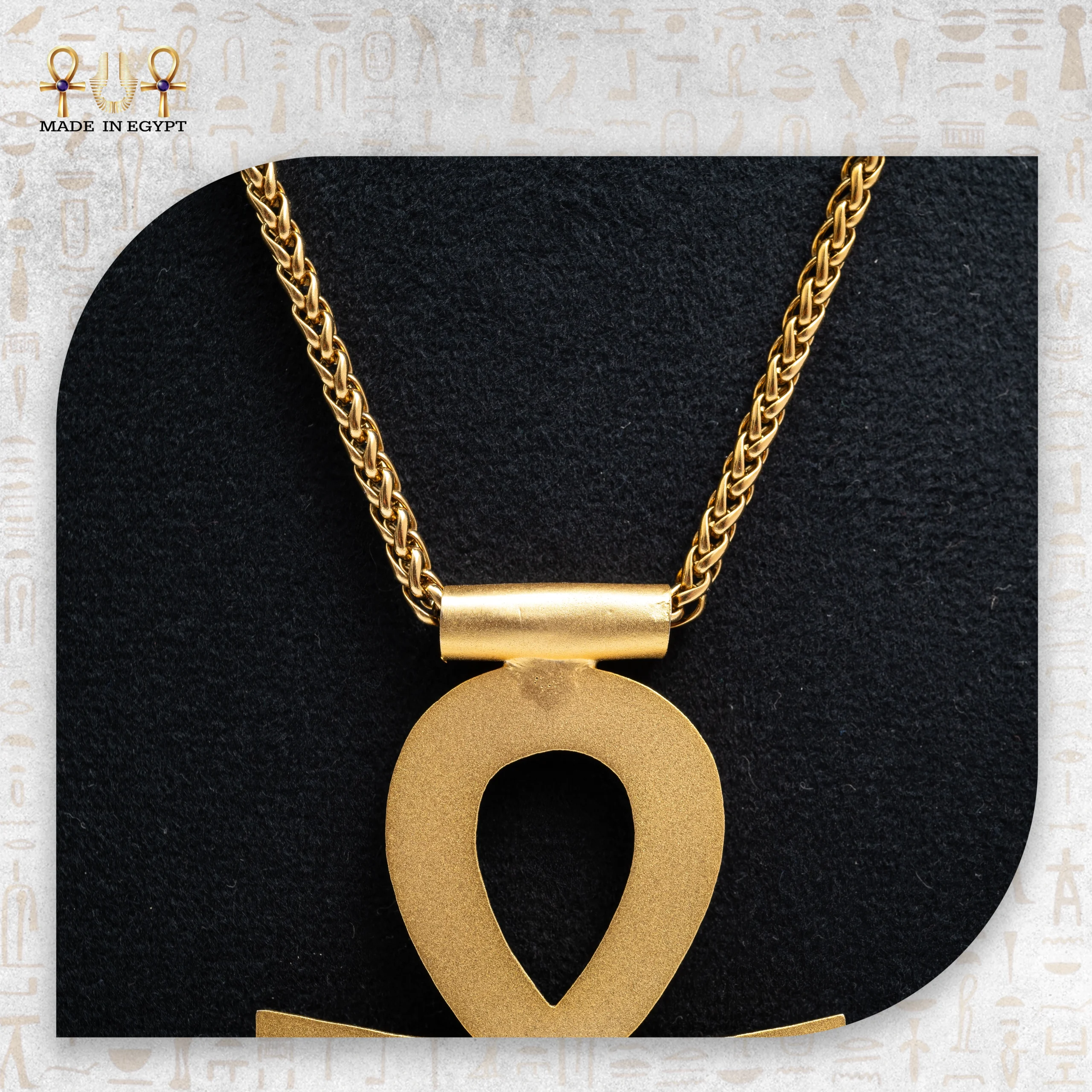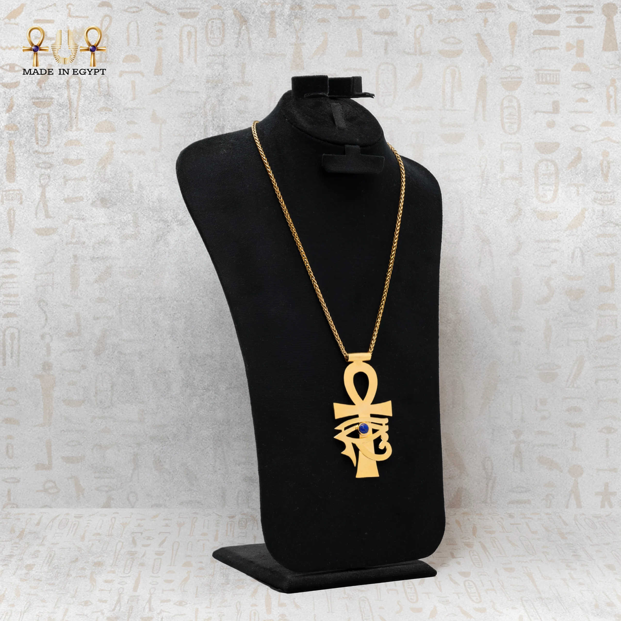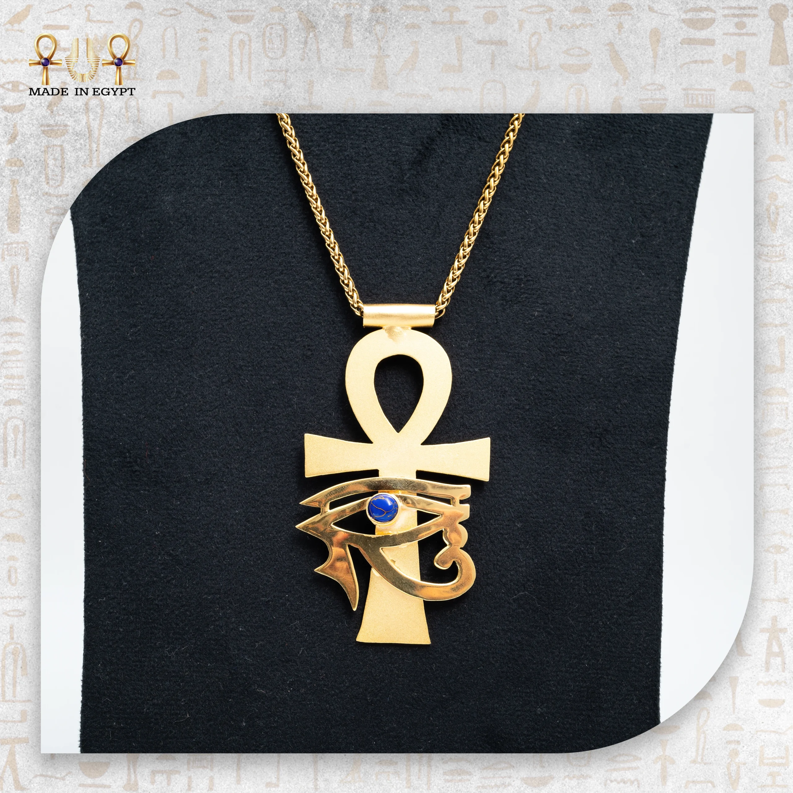 تم تصميم القلادة بدقة عالية لتدمج بين رمز العنخ – مفتاح الحياة – وعين حورس، رمز الحماية والبصيرة. هذا الدمج يعكس القوة الإلهية التي كان المصريون القدماء يقدسونها، ويمنح القلادة حضورًا ملكيًا استثنائيًا. كل تفصيلة محفورة بعناية لتبقى القلادة قطعة فنية متكاملة لا مثيل لها.