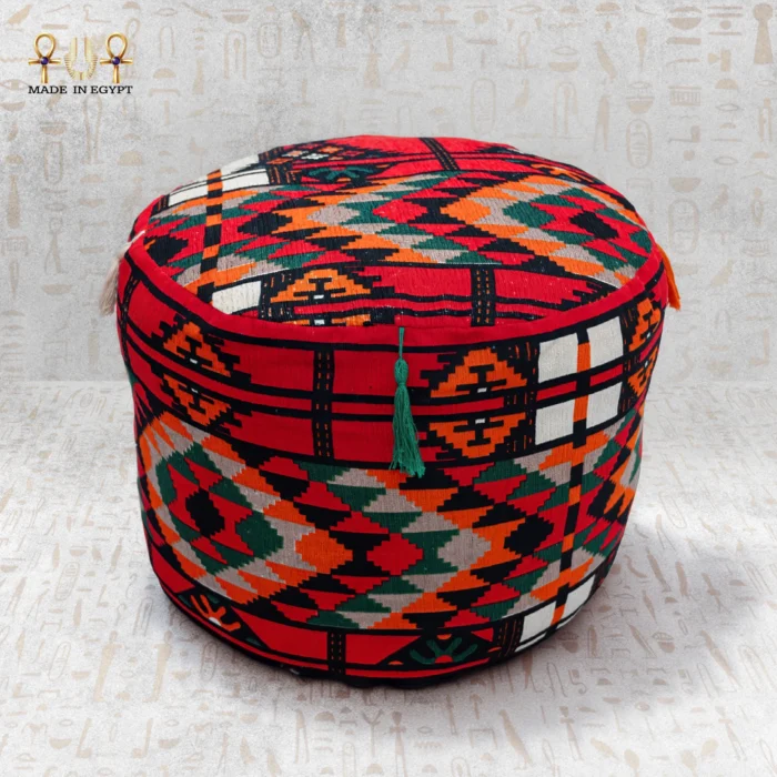 يتميّز المقعد بلونه الأحمر العميق الذي يرمز إلى القوة والطاقة في الثقافة المصرية القديمة. تتناغم معه نقوش هندسية نُسجت بخيوط كليم تراثية، لتمنح التصميم لمسة من الفن الشعبي المصري. تتوزع الألوان على السطح بانسجام لافت، حيث يظهر: