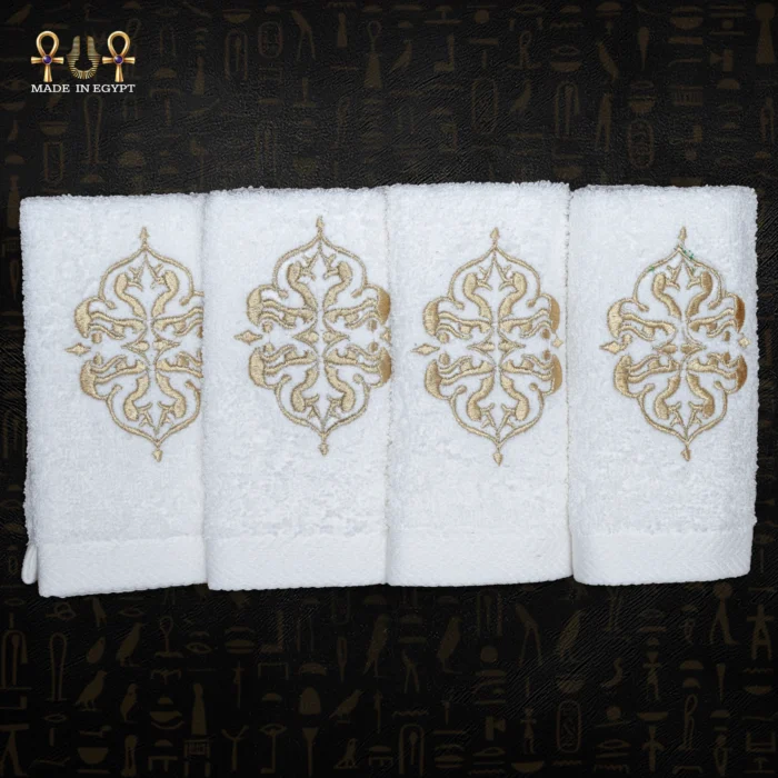 منشفة ضيوف فاخرة بتصميم فنتج راقٍ تجمع بين القطن المصري الفاخر والتطريز الذهبي المستوحى من الزخارف العربية الكلاسيكية. ناعمة الملمس، عالية الامتصاص، تضيف لمسة من الفخامة والأناقة لأي ركن في منزلك، ومثالية للاستخدام اليومي أو كهديّة أنيقة تعبّر عن الذوق الرفيع.