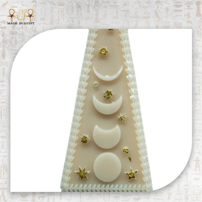 شمعة مون فيزز بيراميد كاندل تجمع بين الجمال السماوي والفن الديكوري في قطعة واحدة تجذب الأنظار منذ الوهلة الأولى. يأتي تصميمها مستوحى من الأهرامات المصرية العريقة، إضافة إلى لمسات تعكس روح القمر بكل مراحله. لذلك، تمنح الشمعة مظهرًا فريدًا يمزج بين الطاقة الدافئة للقمر والقوة الرمزية للشكل الهرمي.