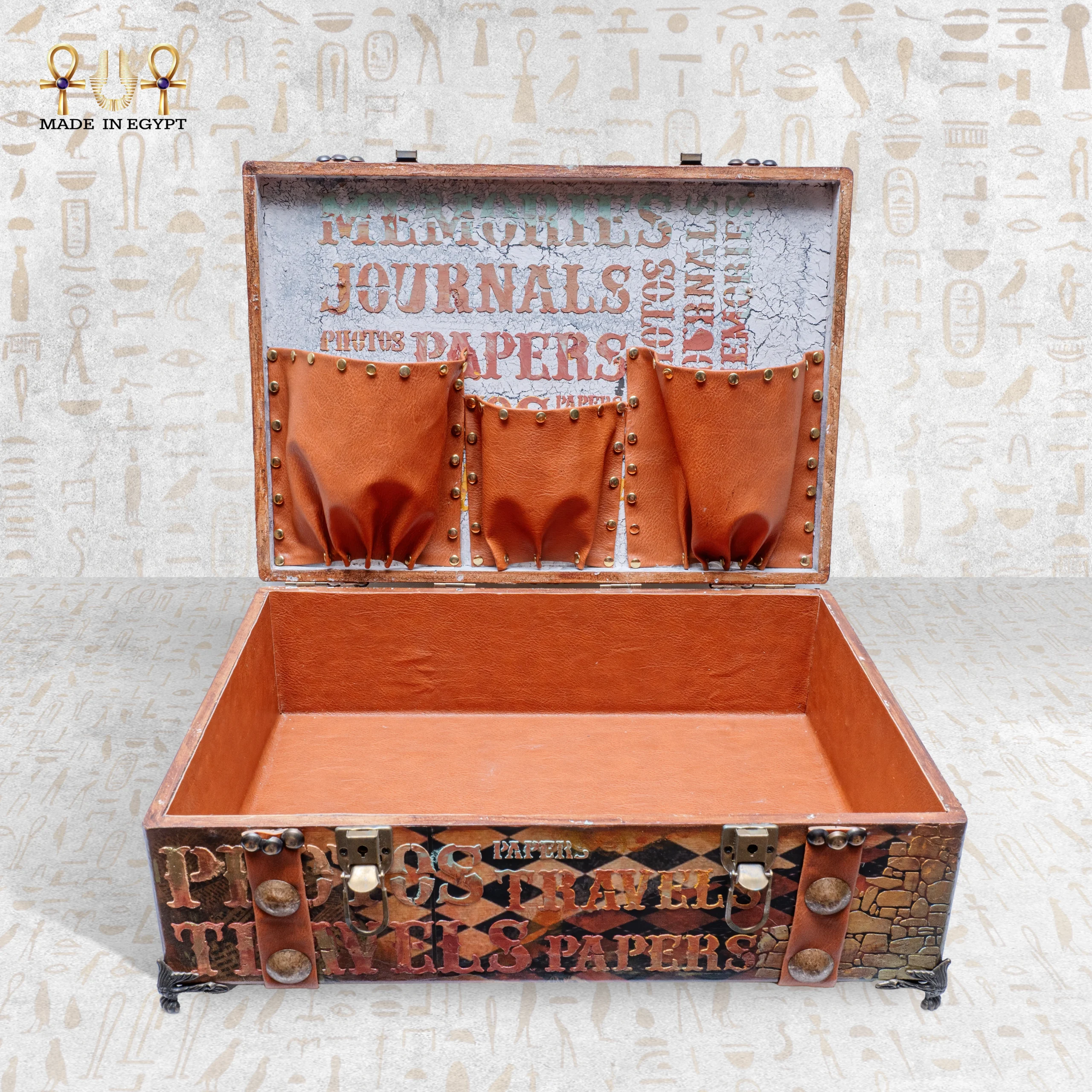 يُبطن الجزء الداخلي من الصندوق بجلد صناعي فاخر يضفي عليه لمسة من الفخامة ويضمن حماية محتوياته. كما يحتوي على جيوب جلدية داخلية مصممة لحفظ الوثائق المهمة مثل الرسائل الشخصية والعقود القديمة والصور التي لا تُنسى.