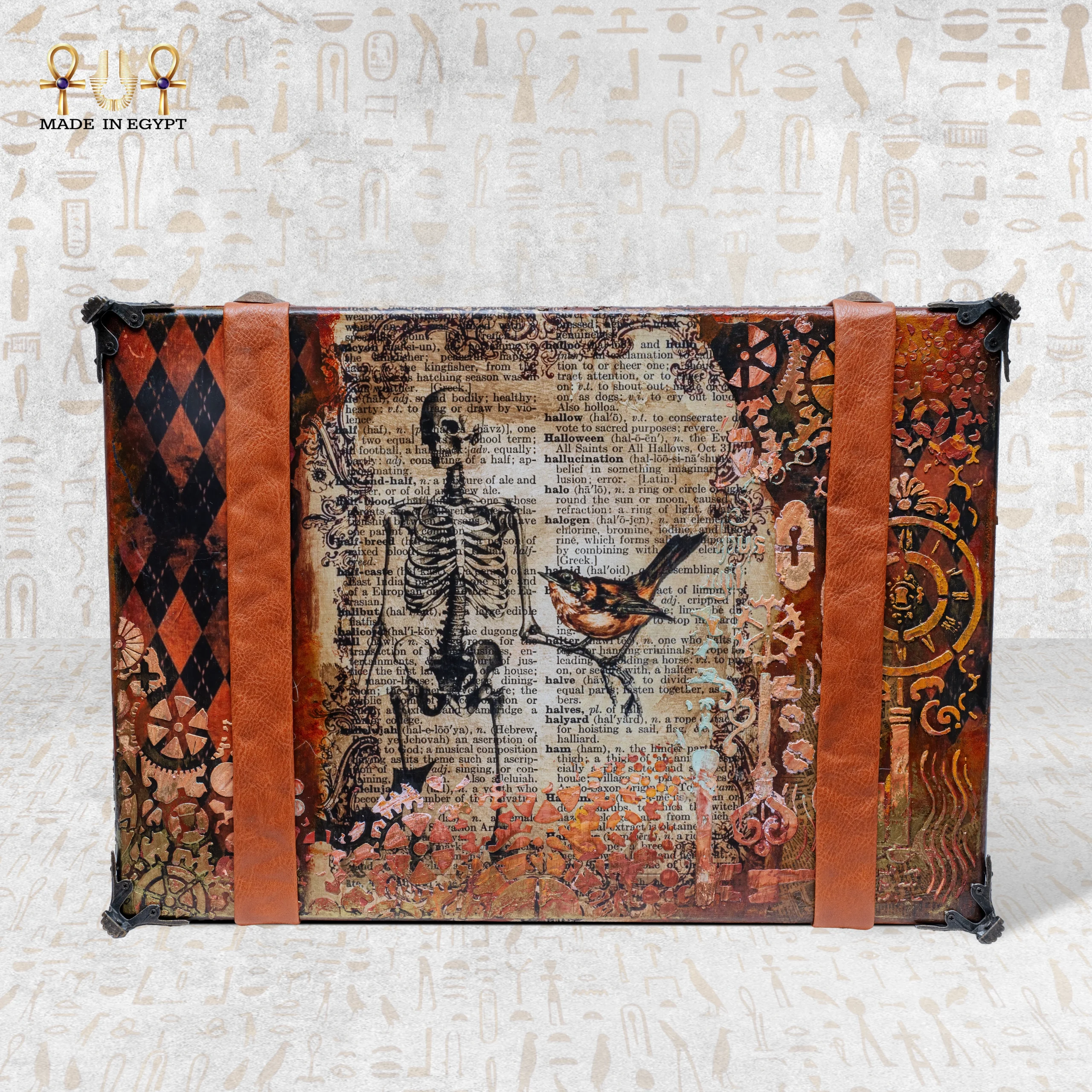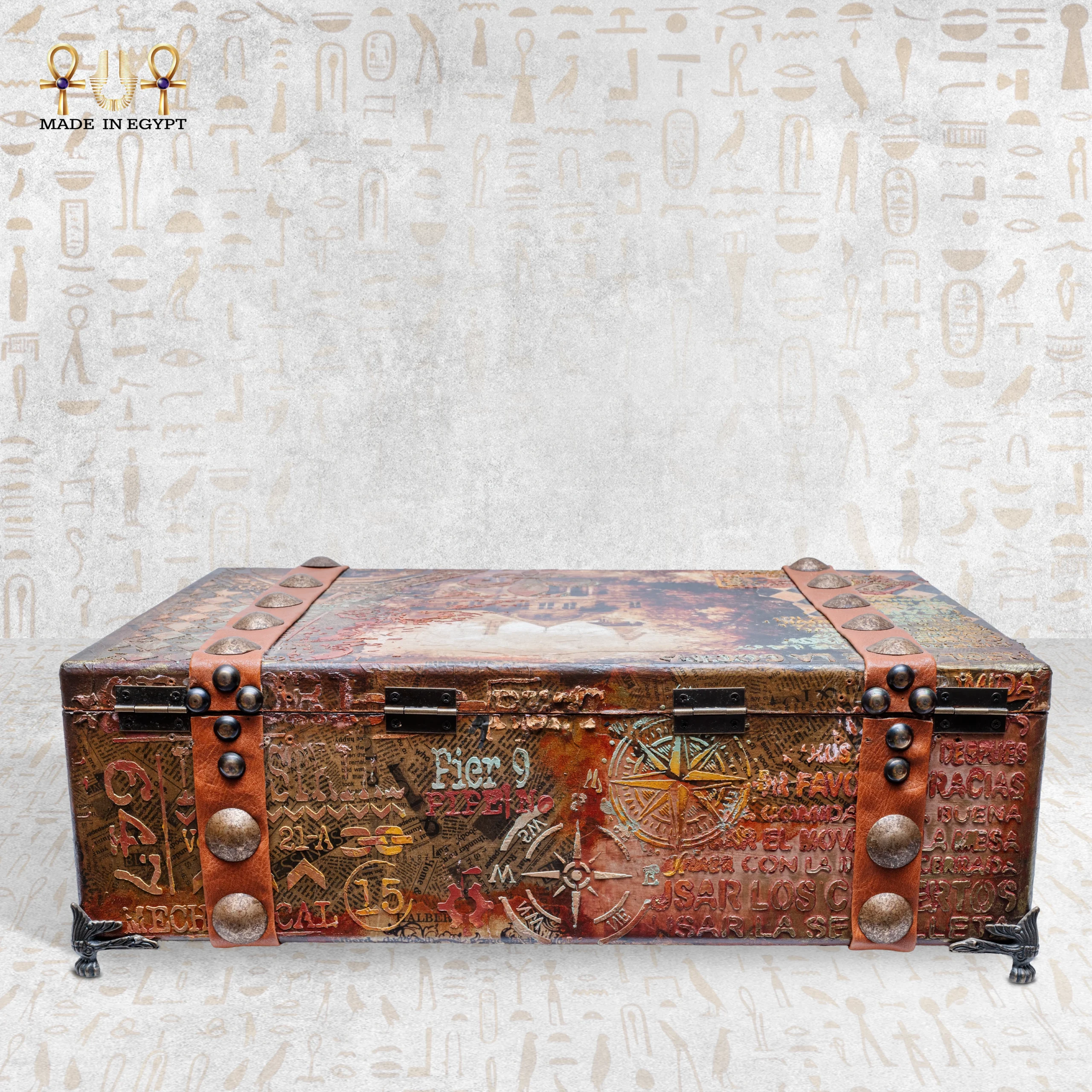 كما تضيف الأحزمة الجلدية الجانبية لمسة من الفخامة وتُحيط بالصندوق كأنها تحمي أسراره، بينما تمنحه المسامير والرِجل النحاسية مظهرًا كلاسيكيًا يجمع بين القوة والرقي.