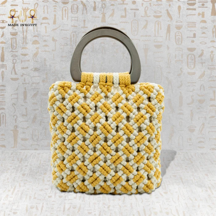 تتميز الشنطة بتصميم هندسي أنيق يجمع اللونين الأوف وايت والمستردة. كل خيط تم نسجه بعناية ليكوّن شكلًا ثلاثي الأبعاد متداخل، ما يجعل الشنطة ملفتة للنظر. كما أنها مثالية للاستخدام اليومي والمناسبات الخاصة.