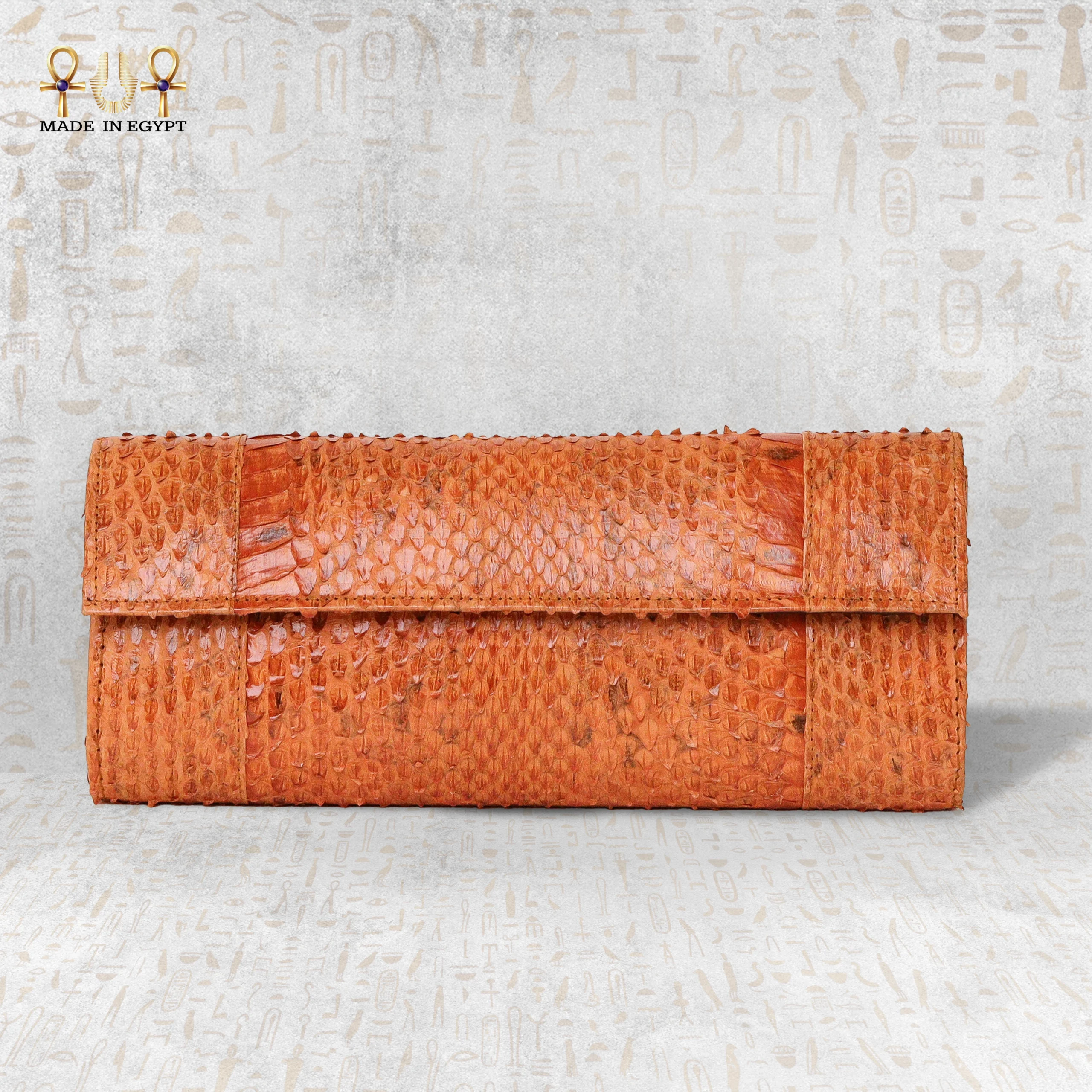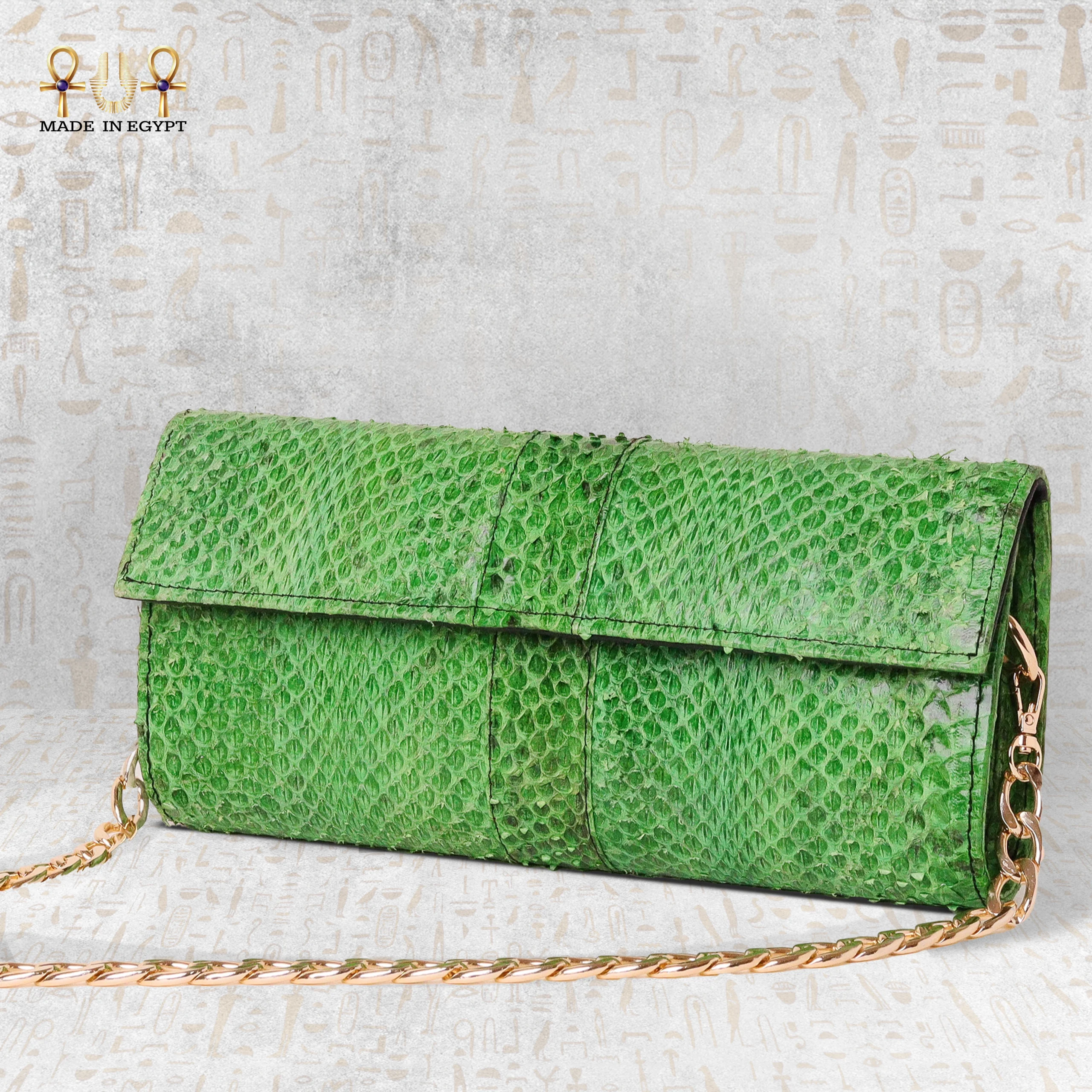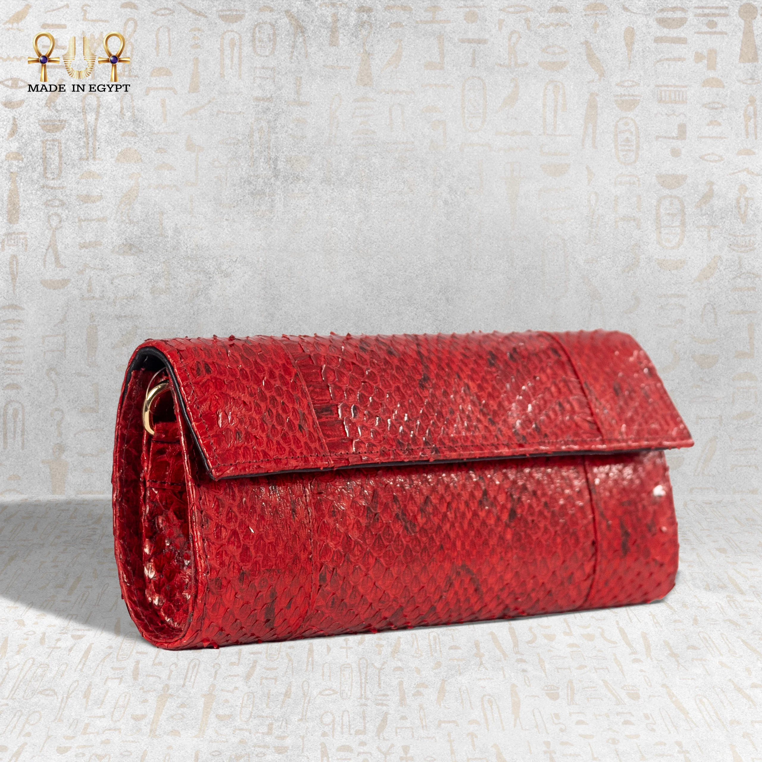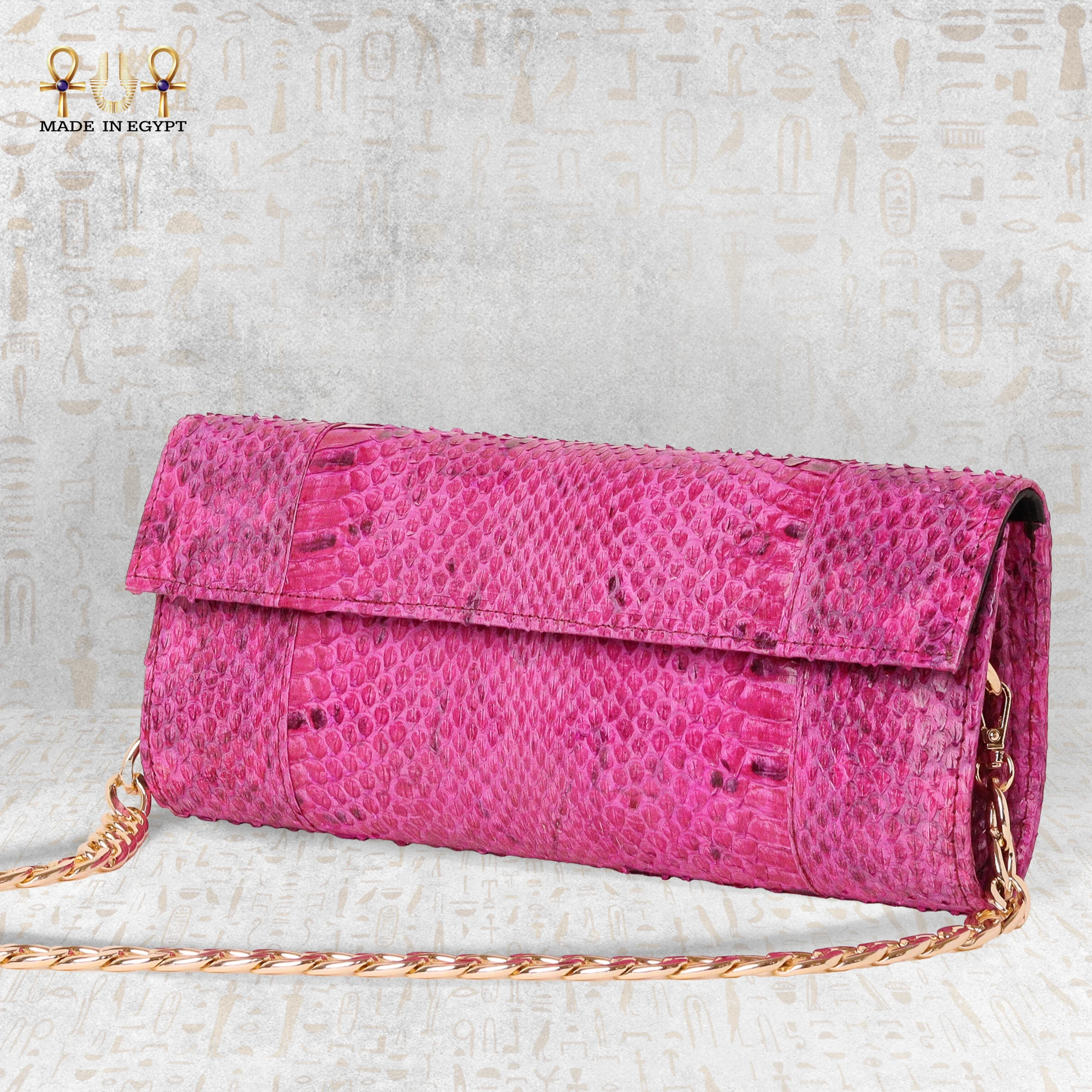 تُعد **حقيبة نورة** من أفخم التصميمات التي تجمع بين القوة والجمال في مزيج فريد من الأناقة المصرية المعاصرة. صُنعت الحقيبة من **جلد الكوبرا الطبيعي الخشن**، مما يمنحها ملمسًا فاخرًا ولمعانًا فريدًا يعكس فخامة المادة الأصلية. تصميمها المستطيل البسيط يوحي بالثقة والرقي، بينما تضيف التفاصيل الدقيقة مثل السلسلة الذهبية المقاومة للصدأ لمسة فنية راقية تجمع بين الفخامة والعملية في الوقت نفسه.