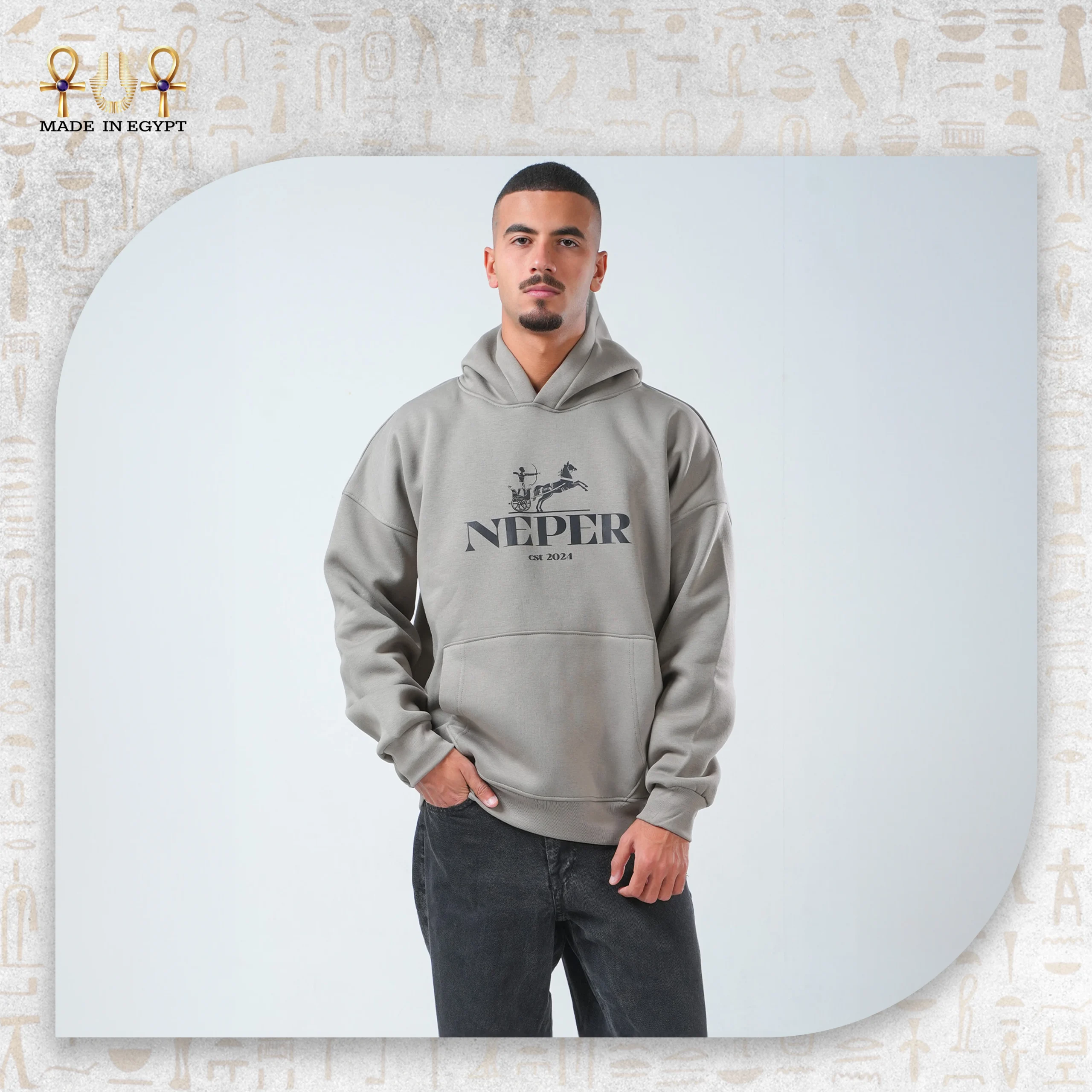 هودي واسع مصنوع من قطن ثقيل 100%، بتصميم رمادي أنيق يحمل شعار نيبر مع عربة فرعونية تعبّر عن القوة والتراث. مثالي لإطلالة عصرية مريحة للجنسين.