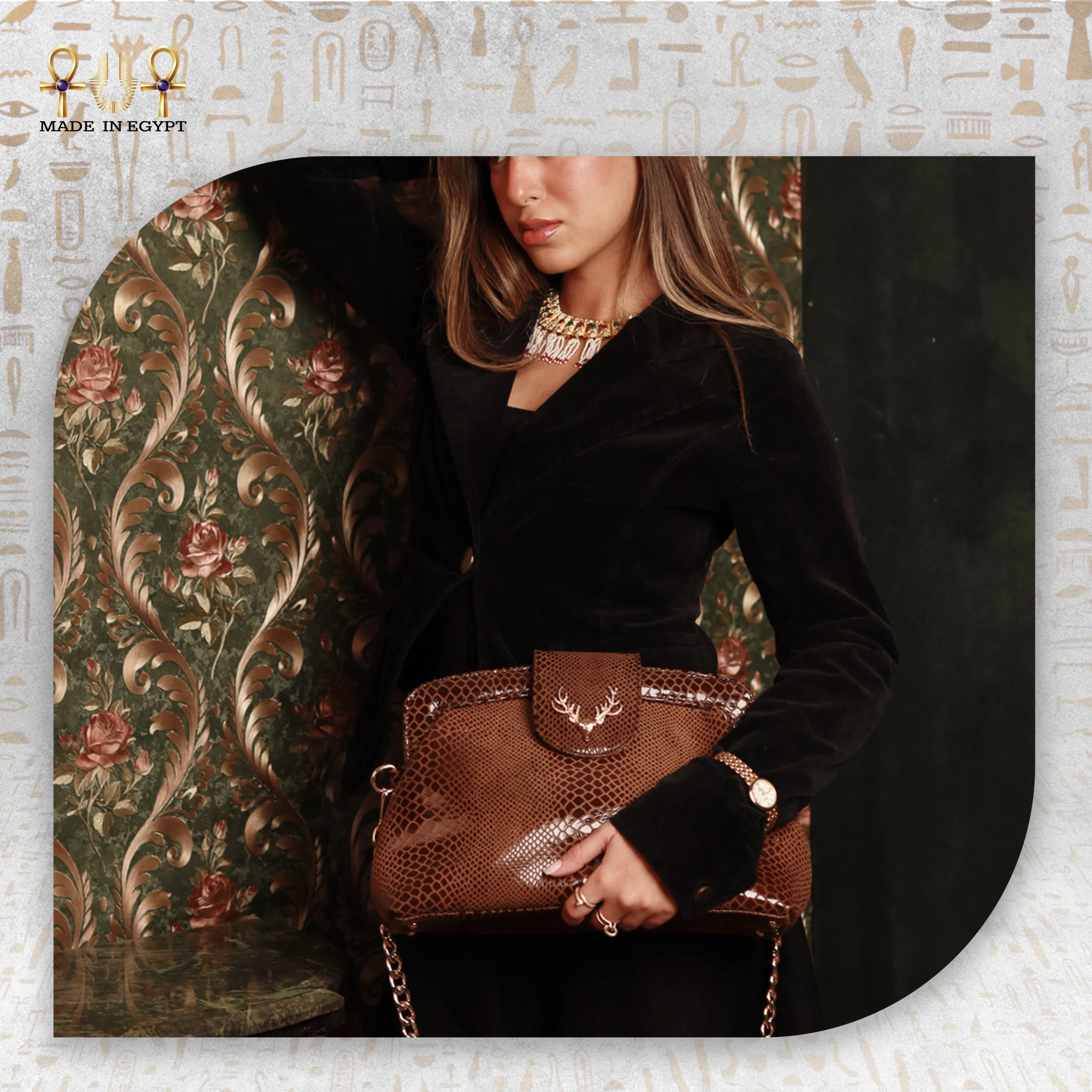 حقيبة فاخرة من جلد البقر الطبيعي بنقشة جلد الثعبان بلون بني شوكولاتي أنيق، مزودة بمشبك ذهبي على شكل قرون غزال وسلسلة كتف معدنية تضيف لمسة من الرقي والفخامة.