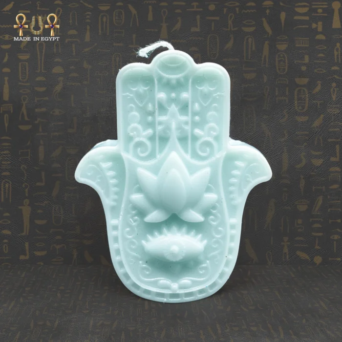 شمعة هامسا هاند بتصميم مستوحى من الرمز الشرقي للحماية والطاقة الإيجابية، مصنوعة من شمع الصويا الطبيعي برائحة فانيلا دافئة ولمسة فنية أنيقة.