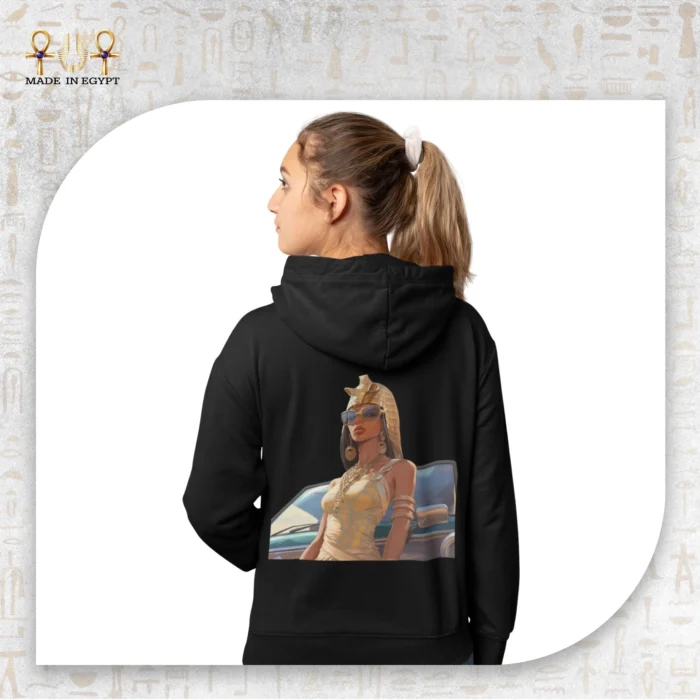 هودي الملكة العصرية من Made in Egypt هو تحفة فنية تجمع بين فخامة الملكات واللمسة العصرية الجريئة للمرأة القوية في وقتنا الحالي. يقدّم التصميم الخلفي لوحة فنية رائعة لملكة فرعونية بإطلالة متجددة، مرتدية تاجًا ذهبيًا فاخرًا وزينة ملكية، ولكن بلمسة حديثة تبرز من خلال النظارات الشمسية والسيارة الفاخرة في الخلفية، في دمج مدهش بين حضارة الأمس وأسلوب اليوم.