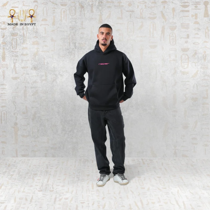 هودي أسود من قطن ثقيل بطبعة أبي الهول النيون الوردي على الظهر وشعار نيبر المطرّز في الأمام، يجمع بين التراث والعصرية.