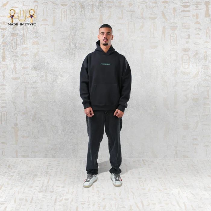 يأتي الهودي باللون الأسود الأنيق الذي يرمز إلى القوة والرقي. كما يتميز بتصميم خلفي مستوحى من طابع البريد المصري القديم، يظهر الأهرامات الشهيرة بخطوط فنية راقية باللون الأخضر الهادئ. هذا التصميم يحوّل الهودي إلى تحفة فنية تحكي قصة مصر القديمة بلغة عصرية، ويعكس التواصل بين الماضي والحاضر.