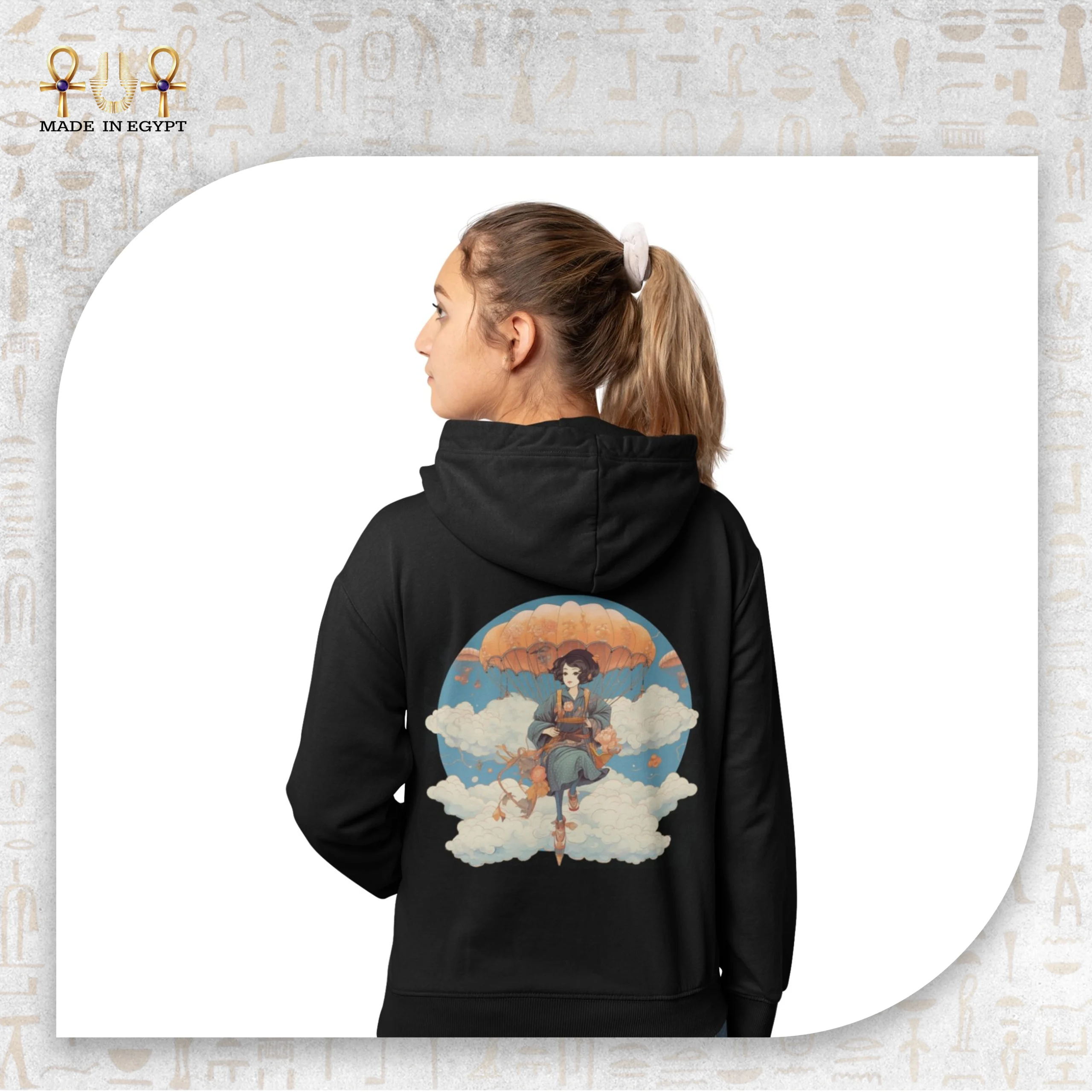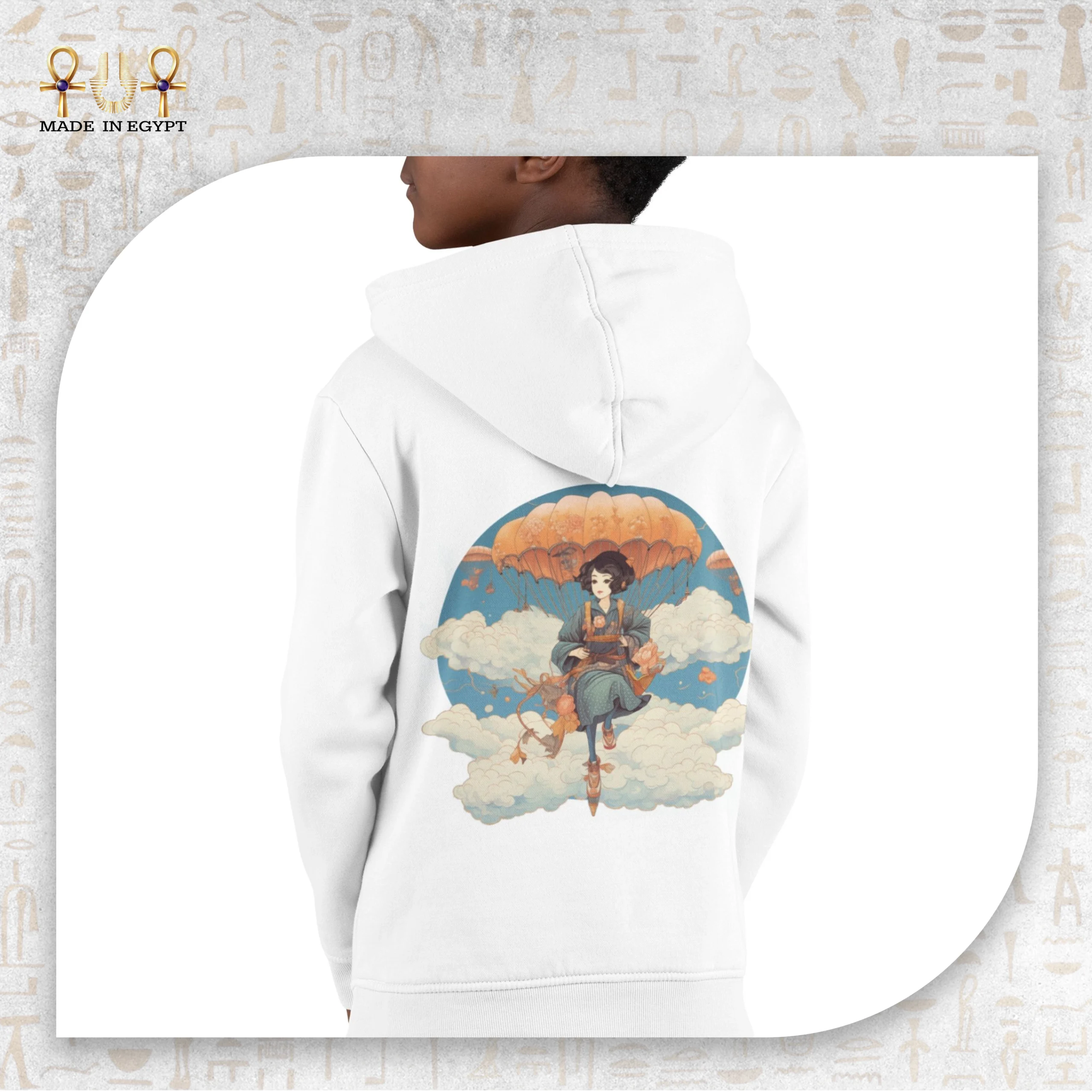 هودي حكاية في السحاب من Made in Egypt يأخذك إلى عالم من الهدوء والخيال، حيث يلتقي الفن بالحلم في تصميم استثنائي. يتصدر التصميم الخلفي مشهدًا لفتاة تطفو في السماء وسط الغيوم، ممسكة بمظلّة دافئة اللون، في مشهد يحكي عن الطمأنينة، الحرية، وتوازن الروح.