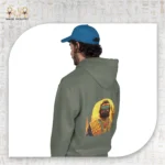هودي دزرت فايب هو تحية صادقة لكل من يرى في الصحراء مساحة للتأمل والإلهام، ولكل من يحيا بتوازن بين الجذور العميقة والروح المنطلقة. التصميم الخلفي يعرض شخصية أنيقة بملابس تقليدية ملونة، تقف بثقة بجانب كلب صحراوي وفي خلفية تغمرها ضوء الشمس الذهبي – مزيج بصري يحمل معاني القوة، الهدوء، والارتباط بالأرض.