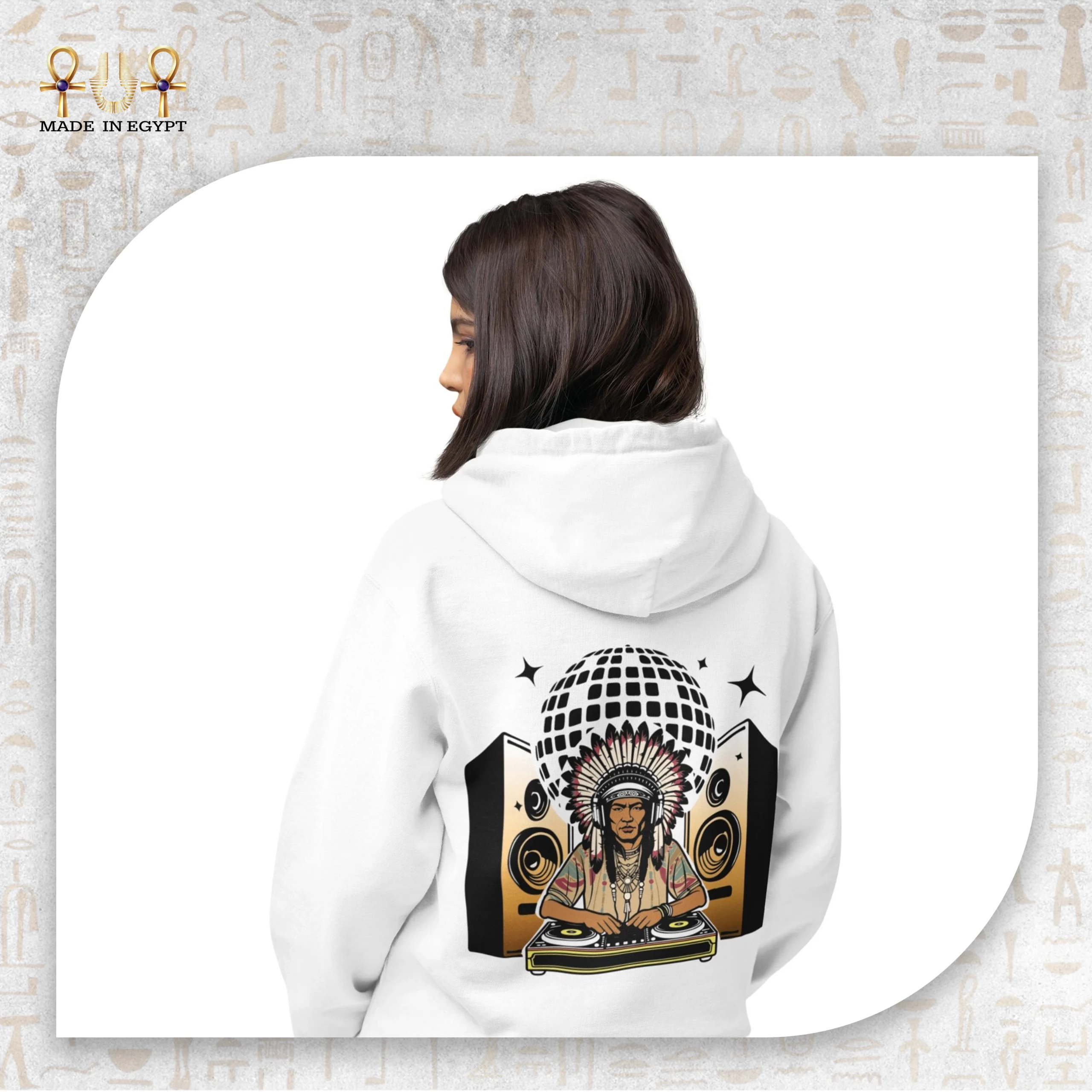 هودي ريدم سبيريت هو تعريف بصري للإبداع اللامحدود، حيث تتلاقى الموسيقى الحرة بجمال التراث الأصيل. التصميم الخلفي لهذا الهودي الفريد يعرض شخصية قوية تقف بثقة خلف منصة دي جي، ترتدي زينة تقليدية غنية بالألوان والتفاصيل، وتحاط بسماعات ضخمة وكرة ديسكو مضيئة — في لوحة فنية تجسّد تناغم الماضي مع الحاضر.