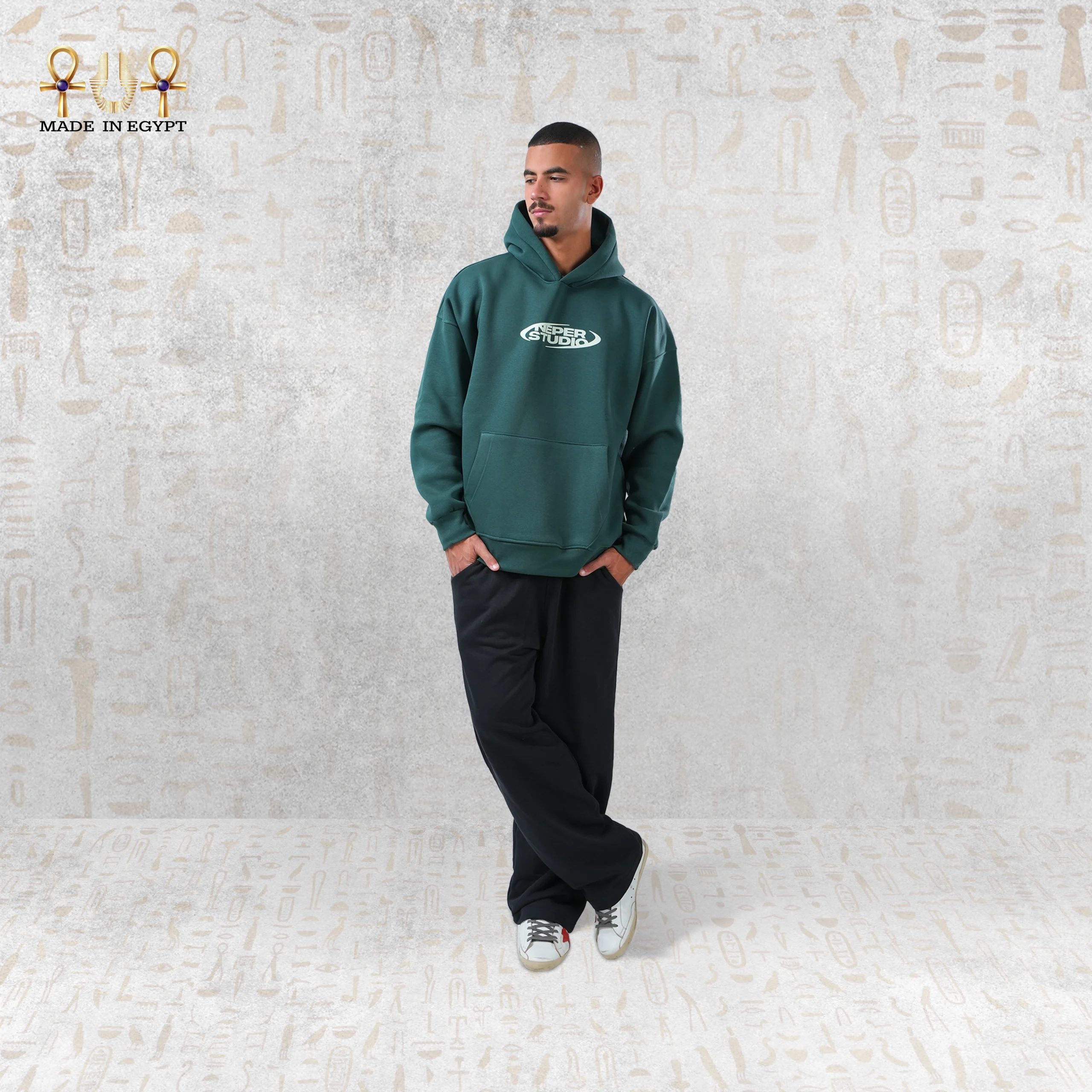 تم تصنيع الهودي من قطن فاخر ثقيل بنسبة 100% ليمنحك ملمسًا ناعمًا ودفء يدوم طوال اليوم. اللون الأخضر الزمردي المميّز يعكس مزيجًا من الهدوء والقوة. بالإضافة إلى ذلك، يزيّنه من الأمام طبعة Neper Studio التي تعبّر عن الحرفية والإبداع. أما الجزء الخلفي، فيبرز شعارًا جريئًا يحمل عبارة “Reviving Pharaoh Chic for Streets”، مما يوضّح التوازن بين الفخامة الفرعونية والثقافة العصرية.