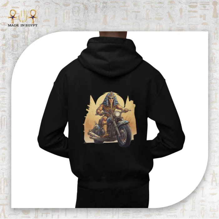 هودي مميز بتصميم فرعون عصري يقود دراجة نارية، يجمع بين الأصالة والقوة بروح مليئة بالثقة والجرأة.