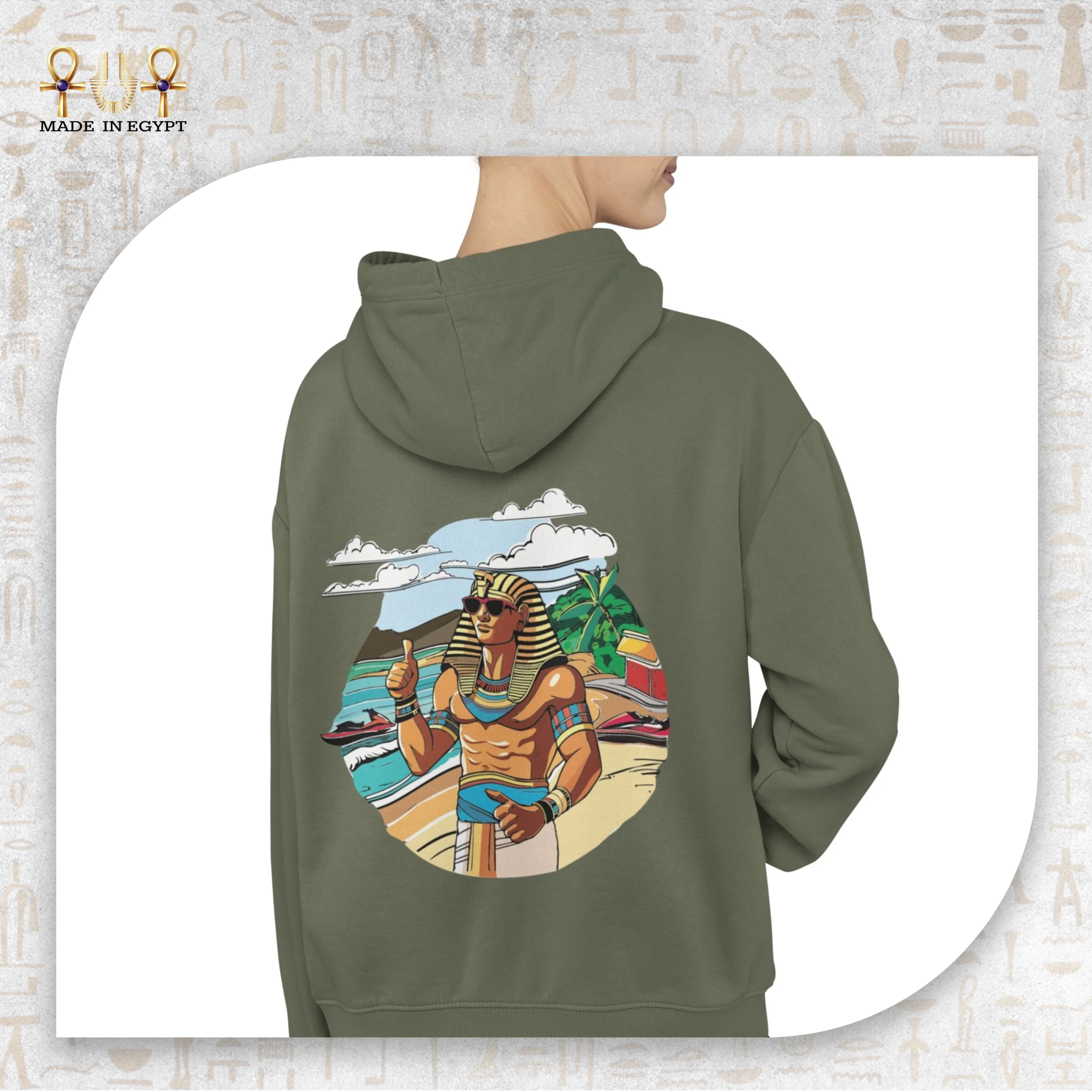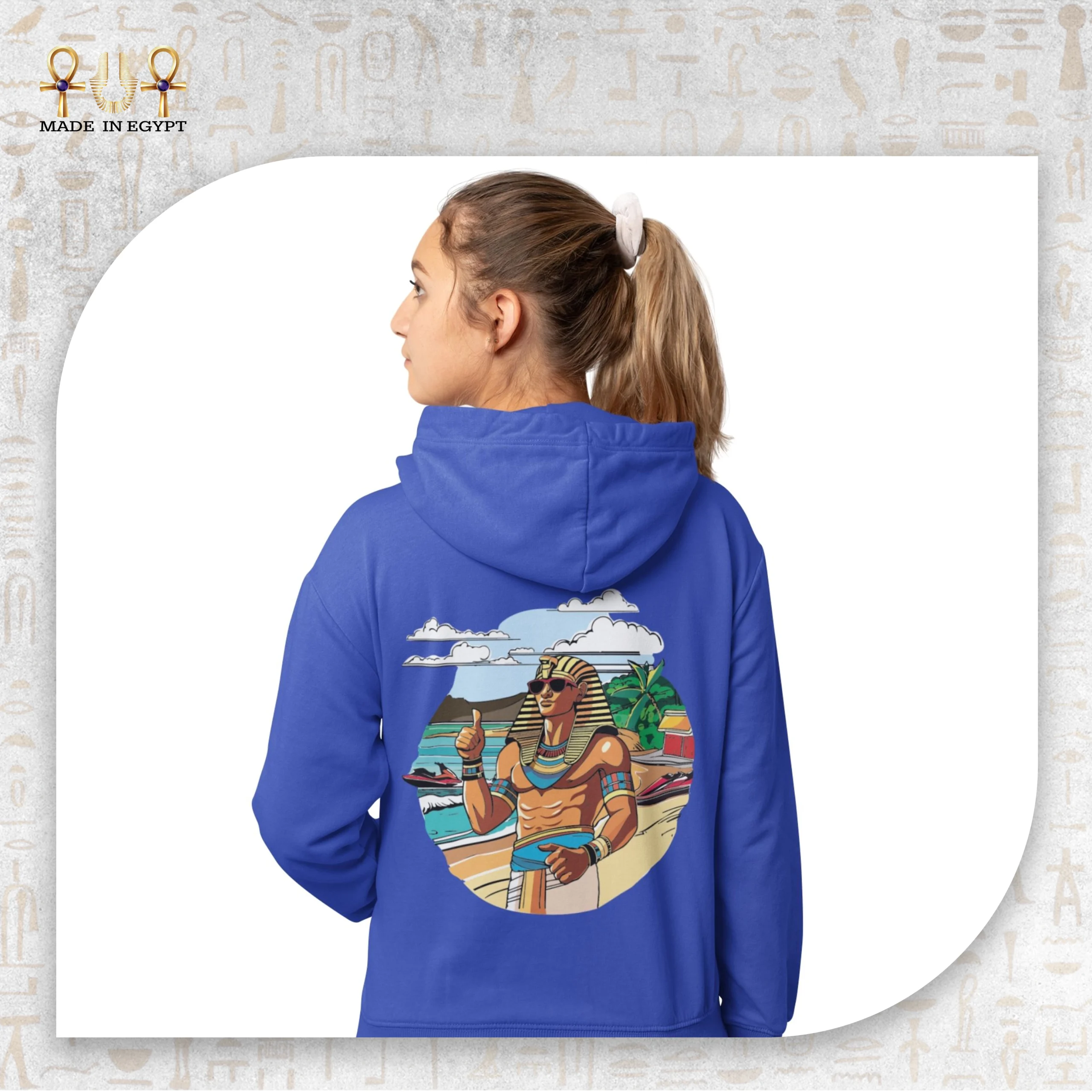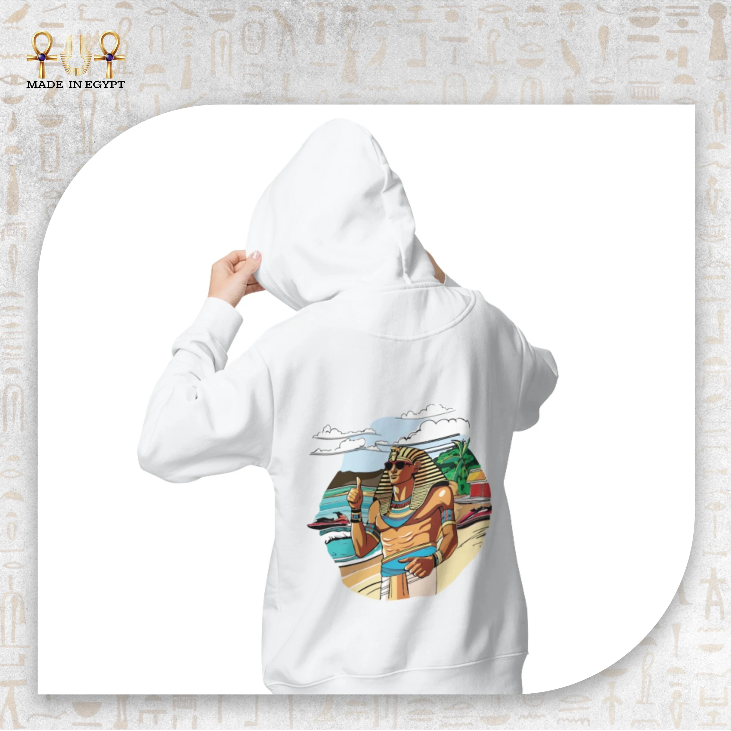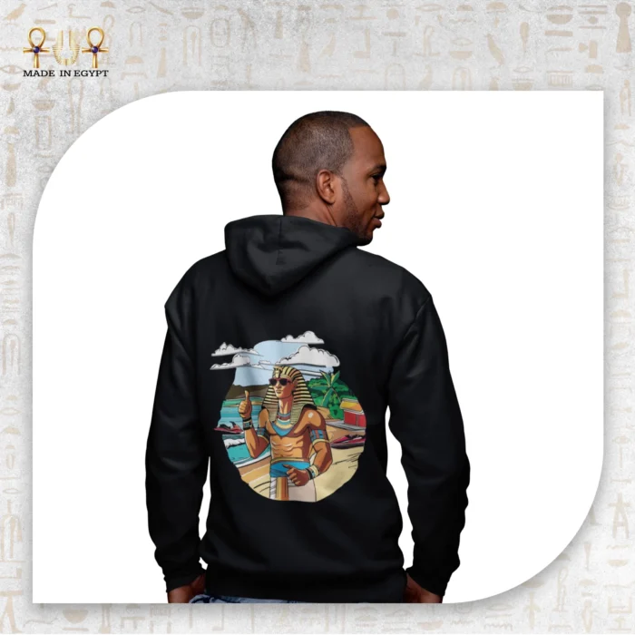 هودي فرعون بيتش هو ترجمة عصرية ممتعة لفكرة الأصالة بطابع شبابي مرِح، يجمع بين سحر الحضارة المصرية وروح العطلة الصيفية في قطعة واحدة. التصميم الخلفي يصوّر فرعون مصر القديمة وهو يسترخي على الشاطئ بنظارة شمسية وابتسامة واثقة، محاط برمال ذهبية ومياه فيروزية هادئة. إنه مشهد بيلخّص فكرة أن العظمة مستمرة، حتى لو غيرنا الأزياء والمكان.