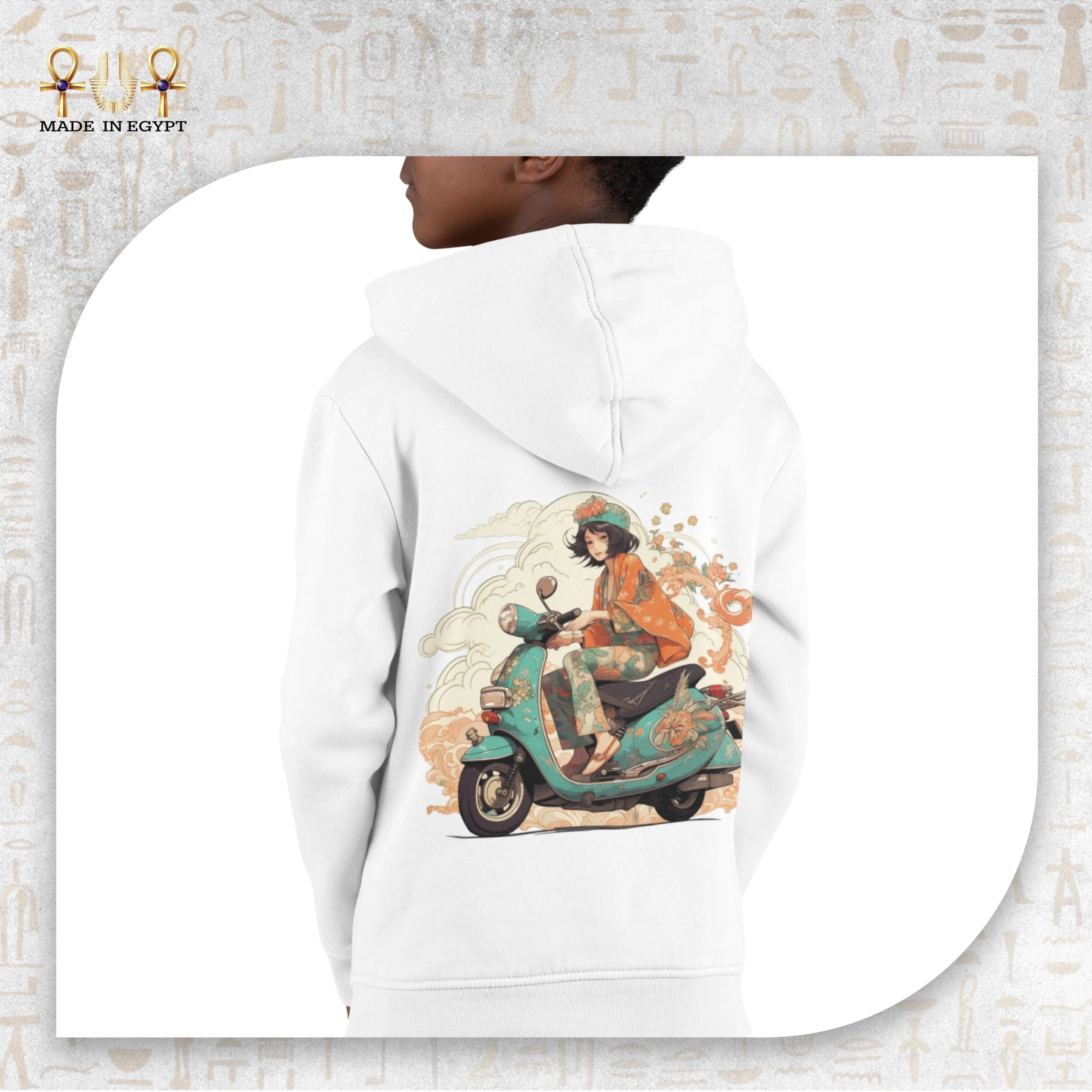 هودي فري رايد هو تجسيد بصري لفكرة الانطلاق دون قيود — قطعة فنية تحتفي بروح المرأة الحرة التي تختار خطواتها بثقة وأناقة. يُظهر التصميم الخلفي فتاة تضج بالأناقة والذكاء، تمتطي دراجة فيسبا كلاسيكية، مرتدية زيًّا مستوحى من الكيمونو الياباني، في مشهد مليء بالتفاصيل اللونية المتناغمة والخطوط الانسيابية التي تُمثل الهواء والحركة.