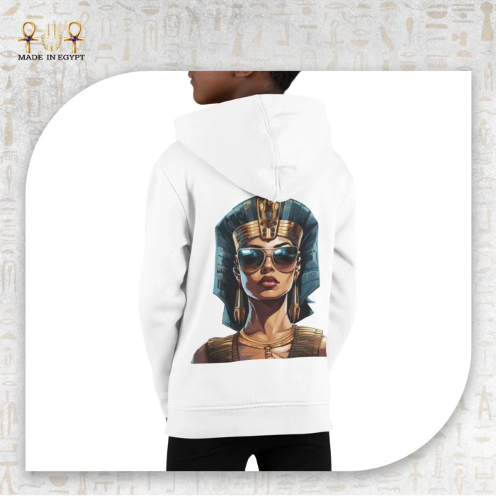 هودي كوين أوف ستايل هو ترجمة بصرية جريئة لدمج التاريخ بالموضة. هذا التصميم الفريد يعرض على ظهره ملكة فرعونية بإطلالة غير تقليدية — ترتدي تاجها الذهبي ونظارات شمسية حديثة، لتعبّر عن مزيج فريد بين المهابة القديمة والأسلوب العصري.