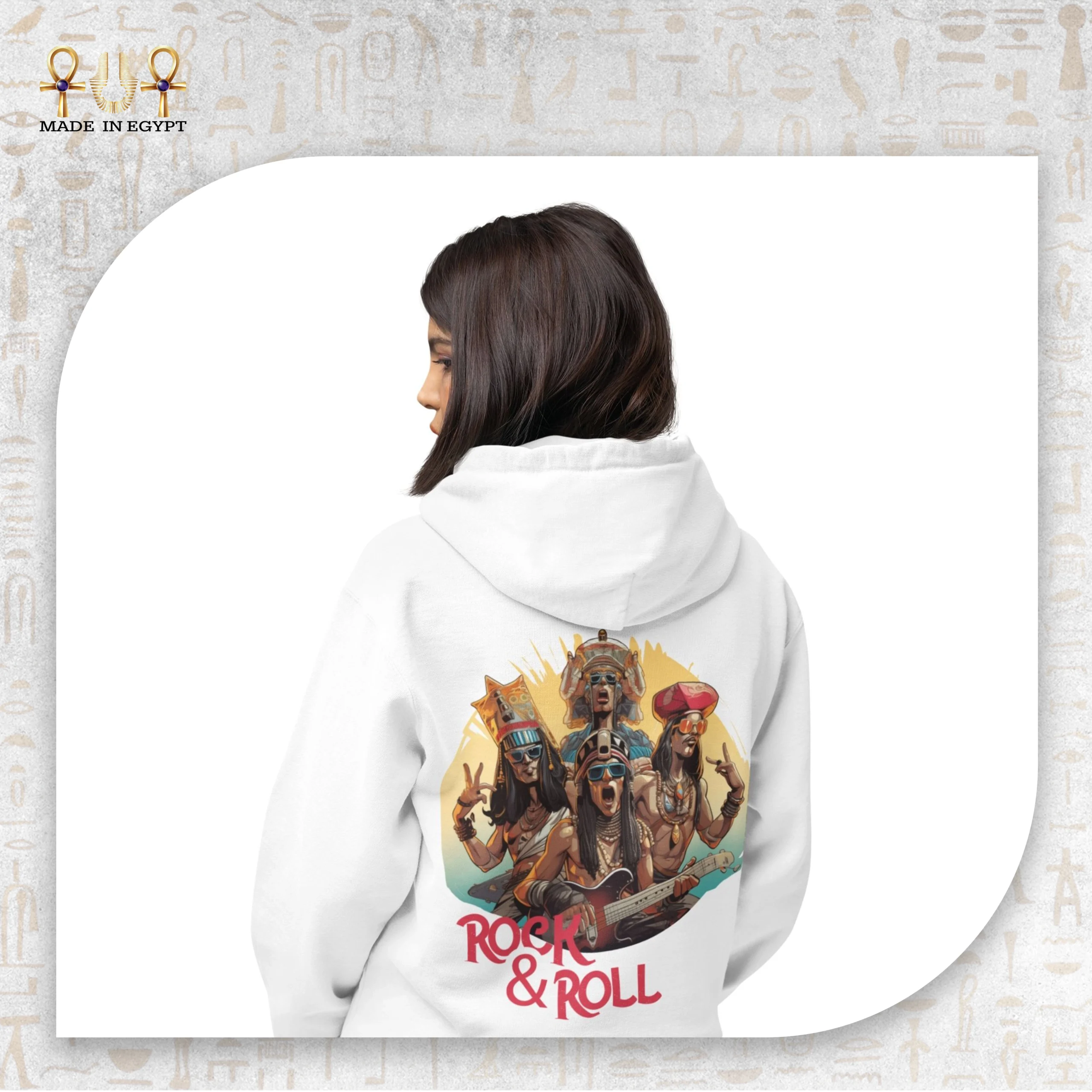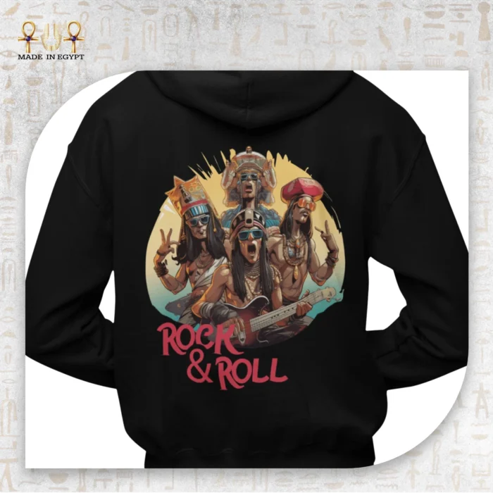 هودي ملوك الروك بتصميم يجمع بين الفراعنة وموسيقى الروك في لوحة فنية جريئة. خامة قطنية مريحة، وطباعة ثابتة. متوفر بالأسود والأبيض.