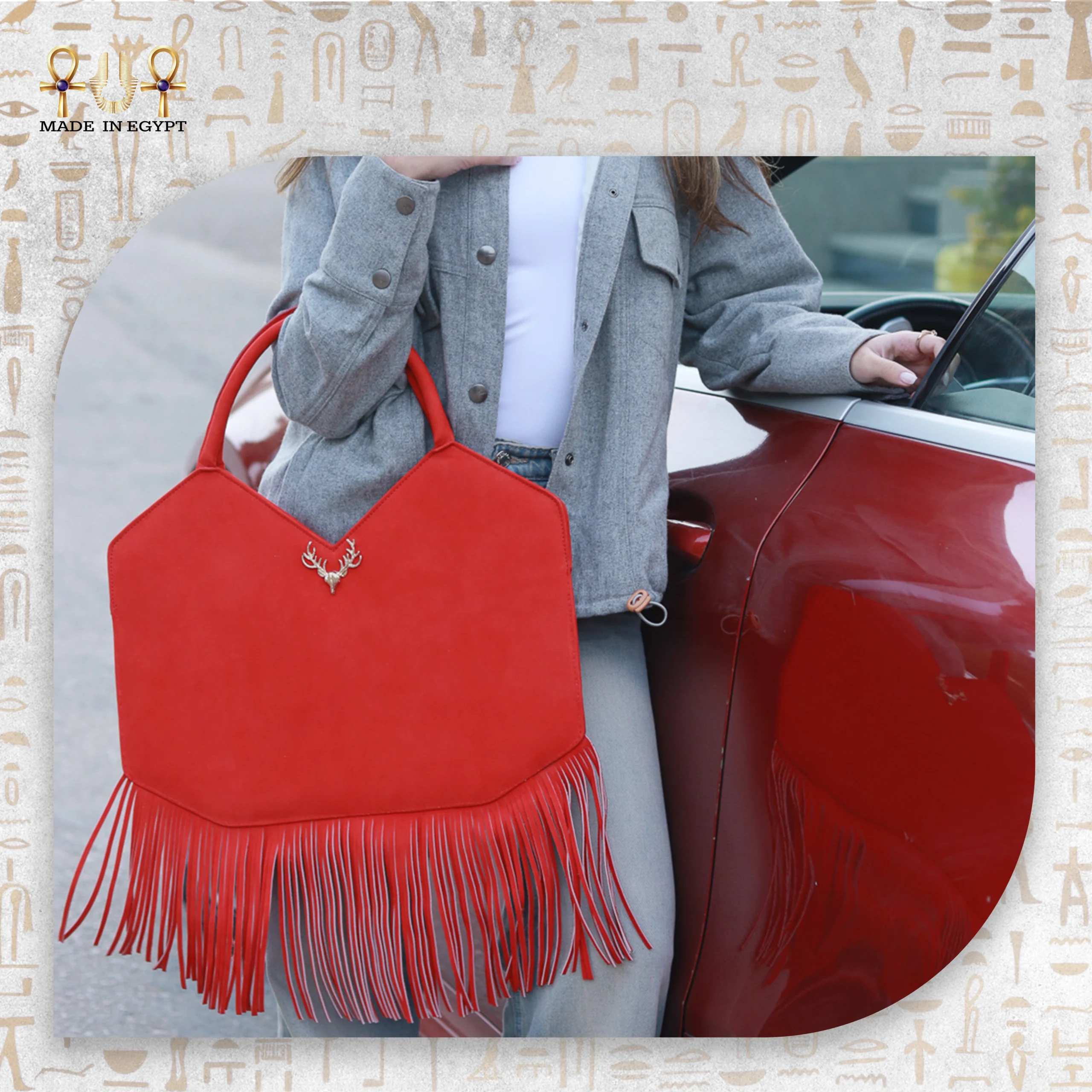 تجمع حقيبة وايلد جريس بين الحرية والجرأة بأسلوب عصري. الشرّابات الطويلة في الأسفل تضيف لمسة بوهيمية، بينما الخطوط الحادة في الأعلى تعكس القوة والثقة. التفاصيل المعدنية، مثل شعار قرون الغزال الذهبي، تمنح الحقيبة لمسة ملكية وفخامة خالدة، تجعلها قطعة مميزة يمكن ارتداؤها في أي مناسبة.