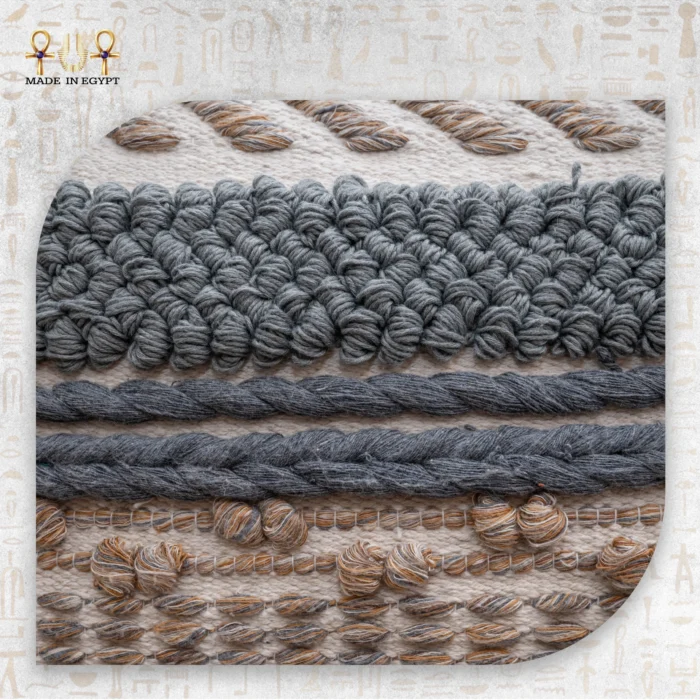 تمت حياكة الغلاف يدويًا باستخدام خيوط قطنية وسميكة منسوجة بدقة في طبقات متفاوتة الارتفاع لتمنح ملمسًا غنيًا ثلاثي الأبعاد يعكس مهارة الحرفيين المصريين. تجمع بين الغرز المتشابكة والتطريز اليدوي ليشكل لوحة فنية منسوجة تجمع الفن الخام بالبنية المتقنة.