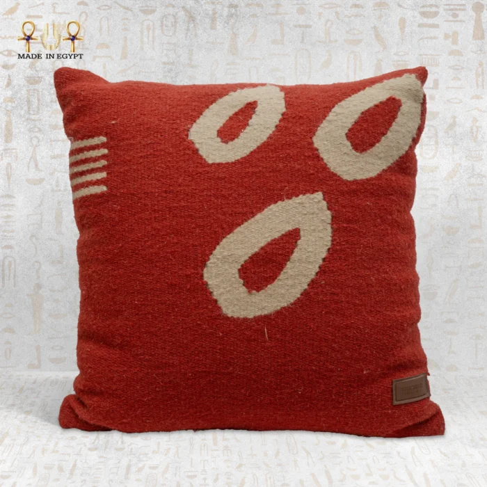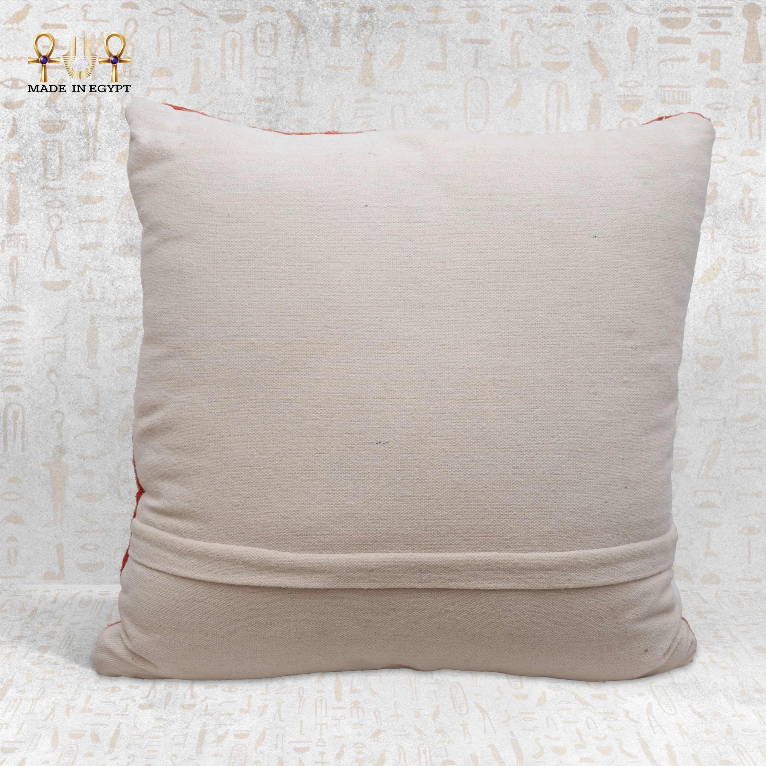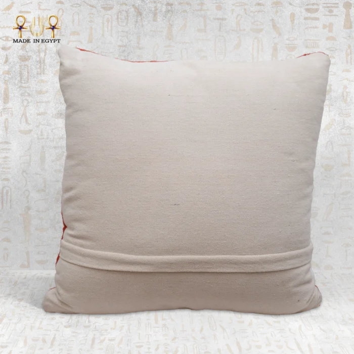 تم نسج الغلاف يدويًا على نول مصري تقليدي باستخدام خيوط قطنية طبيعية عالية الجودة. يجمع القماش بين المتانة والنعومة ليضمن راحة تدوم طويلًا. الجهة الخلفية مصنوعة من قماش قطني بلون بيج فاتح، مع فتحة مغلقة بعناية لتسهيل تبديل الحشوة أو تنظيف الغطاء بسهولة. كل وسادة تحمل بصمة الحرفي المصري الذي صنعها، مما يجعلها قطعة فريدة في الشكل والإحساس.