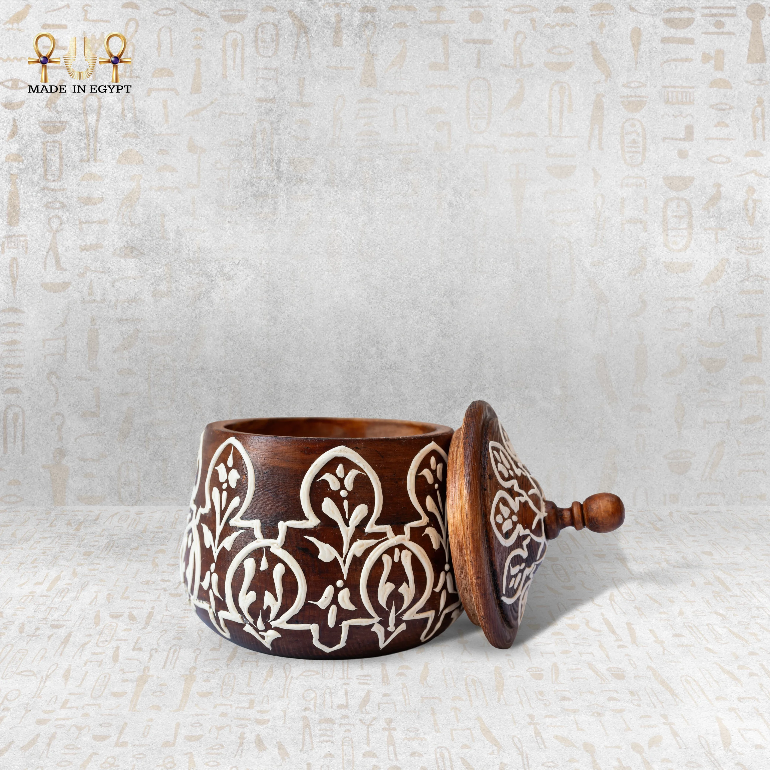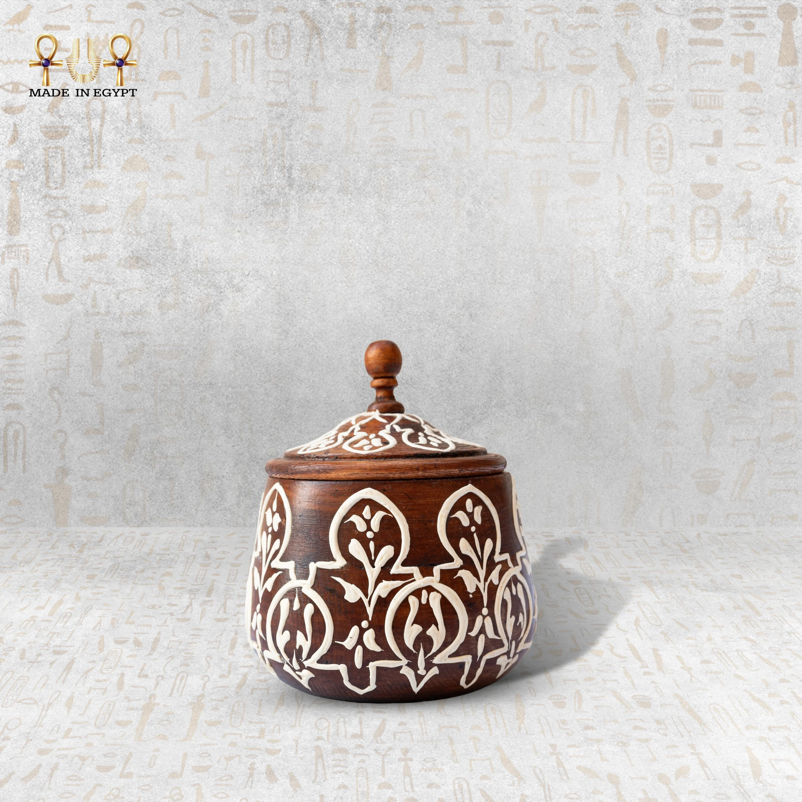 وعاء مصنوع يدويًا من الخشب الطبيعي بلون داكن أنيق، مزين بزخارف شرقية مرسومة يدويًا تعكس روح الأصالة والوقار. يأتي بغطاء عملي ومقبض علوي بسيط، ويمكن استخدامه كقطعة ديكور أو لحفظ الأغراض الصغيرة، ليضيف لمسة هادئة وأنيقة لأي مساحة.