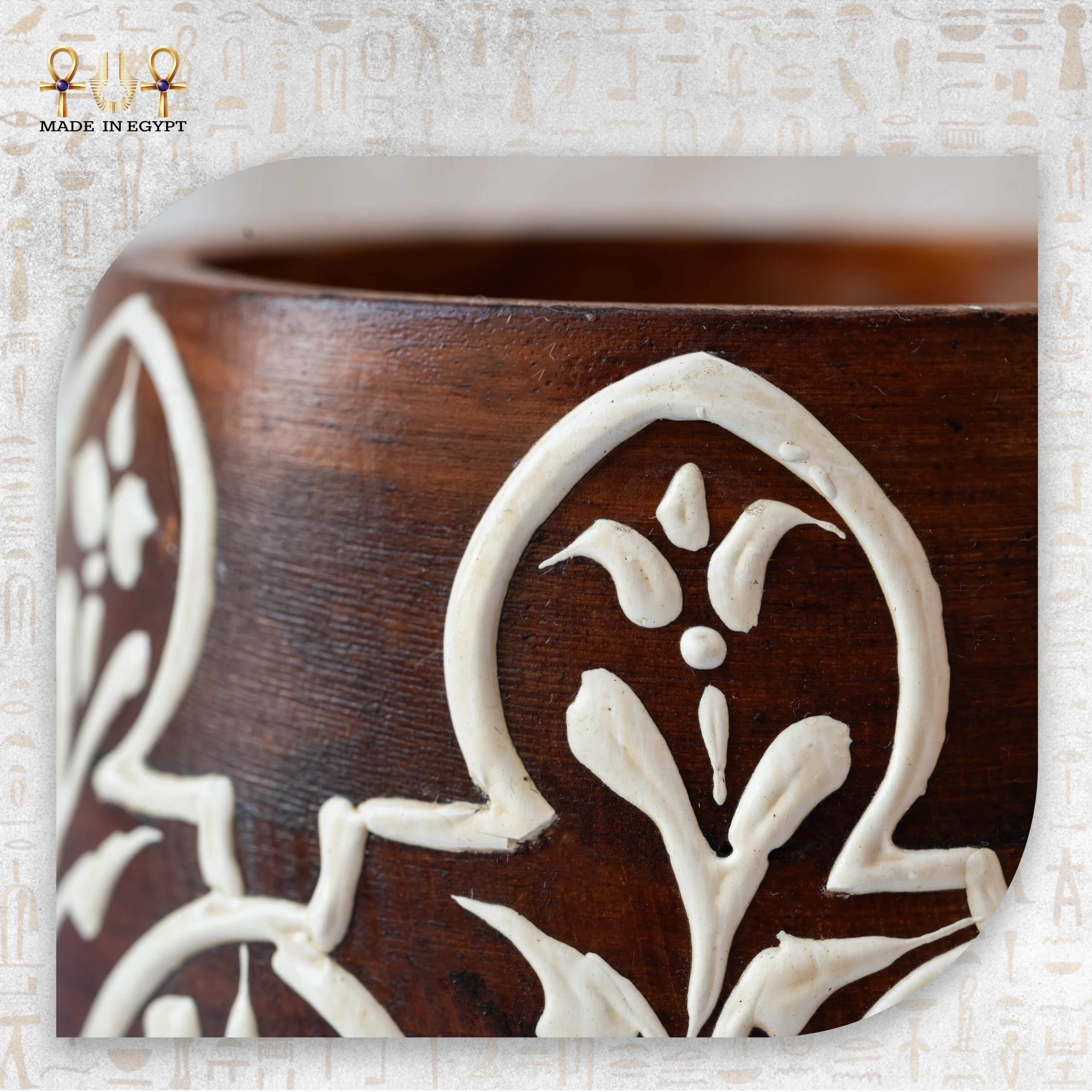 يعكس وقار الزخارف جوهر الحِرفة الشرقية الأصيلة في قطعة تجمع بين البساطة والهيبة. يلتقي الخشب الطبيعي الداكن مع الزخارف اليدوية المتقنة ليقدّم عملًا فنيًا هادئًا وعميقًا. كما يمنح التصميم المتوازن القطعة حضورًا أنيقًا دون مبالغة. لذلك لا يُعد الوعاء مجرد عنصر ديكوري، بل تعبيرًا عن ذوق يقدّر التراث ويقدّمه بروح معاصرة.