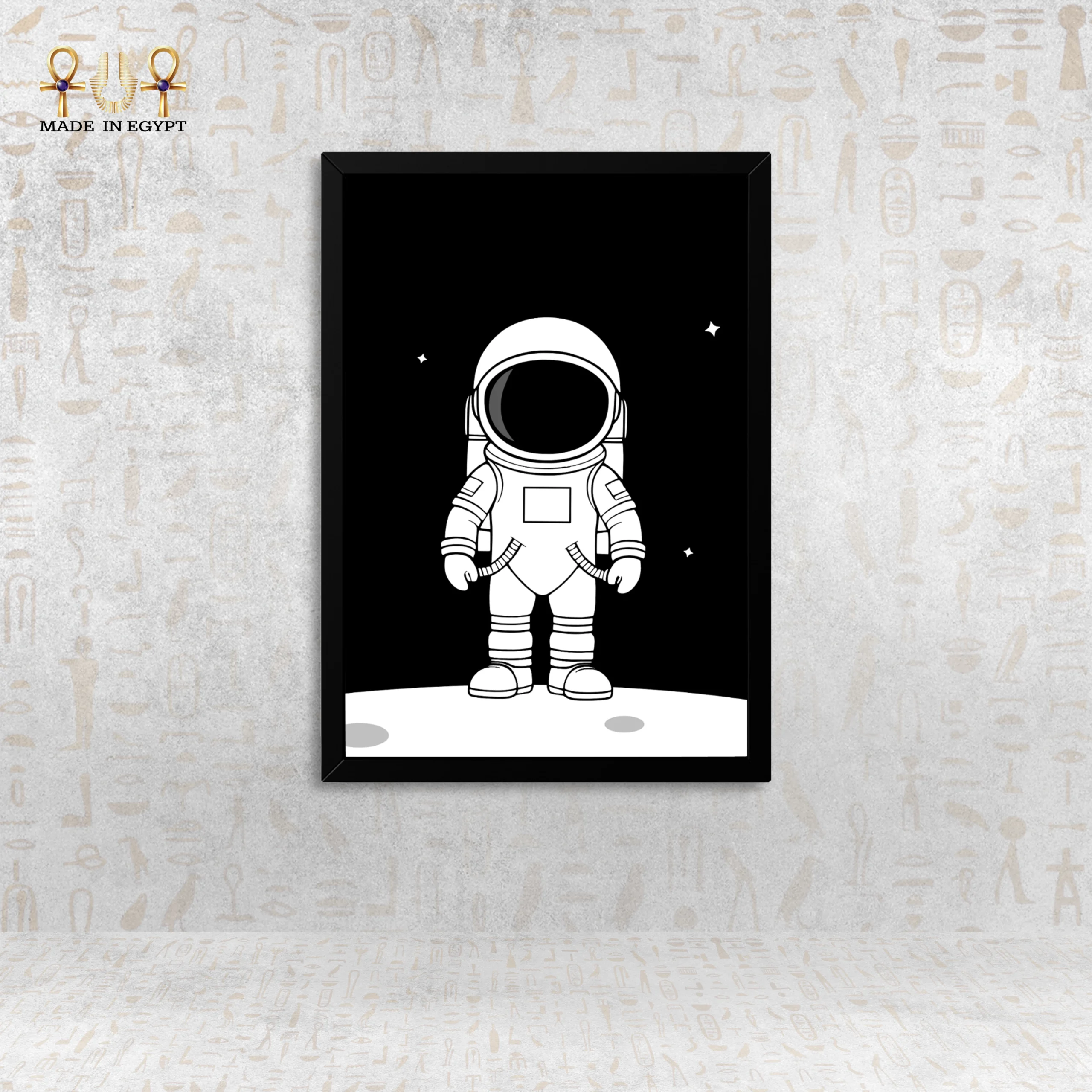 Designed in a clean black-and-white minimalist style, the artwork blends effortlessly with contemporary interiors. The absence of facial details behind the helmet allows viewers to project themselves onto the figure, transforming the astronaut into a universal symbol of dreams, courage, and limitless possibilities.