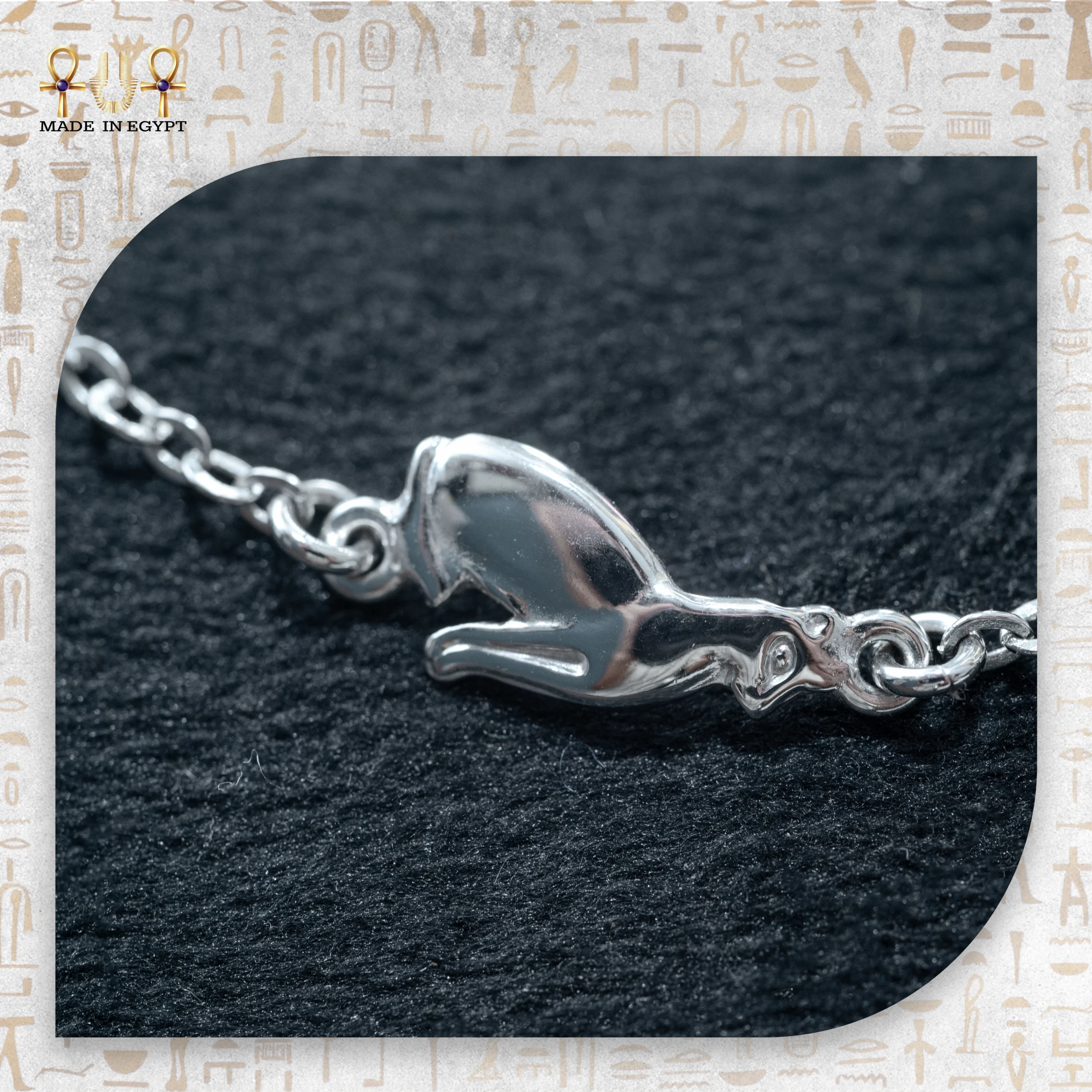 بالإضافة إلى ذلك، تعكس القطة المحفورة على السوار طاقة الحماية التي آمن بها المصريون القدماء. فهي ليست مجرد حيوان أليف مرتبط بالهدوء والجاذبية، بل تعطي شعورًا بالأمان والثقة. لذلك، عندما ترتدي هذا السوار، كأنك تحمل درعًا صغيرًا يبعد الطاقات السلبية عنك.