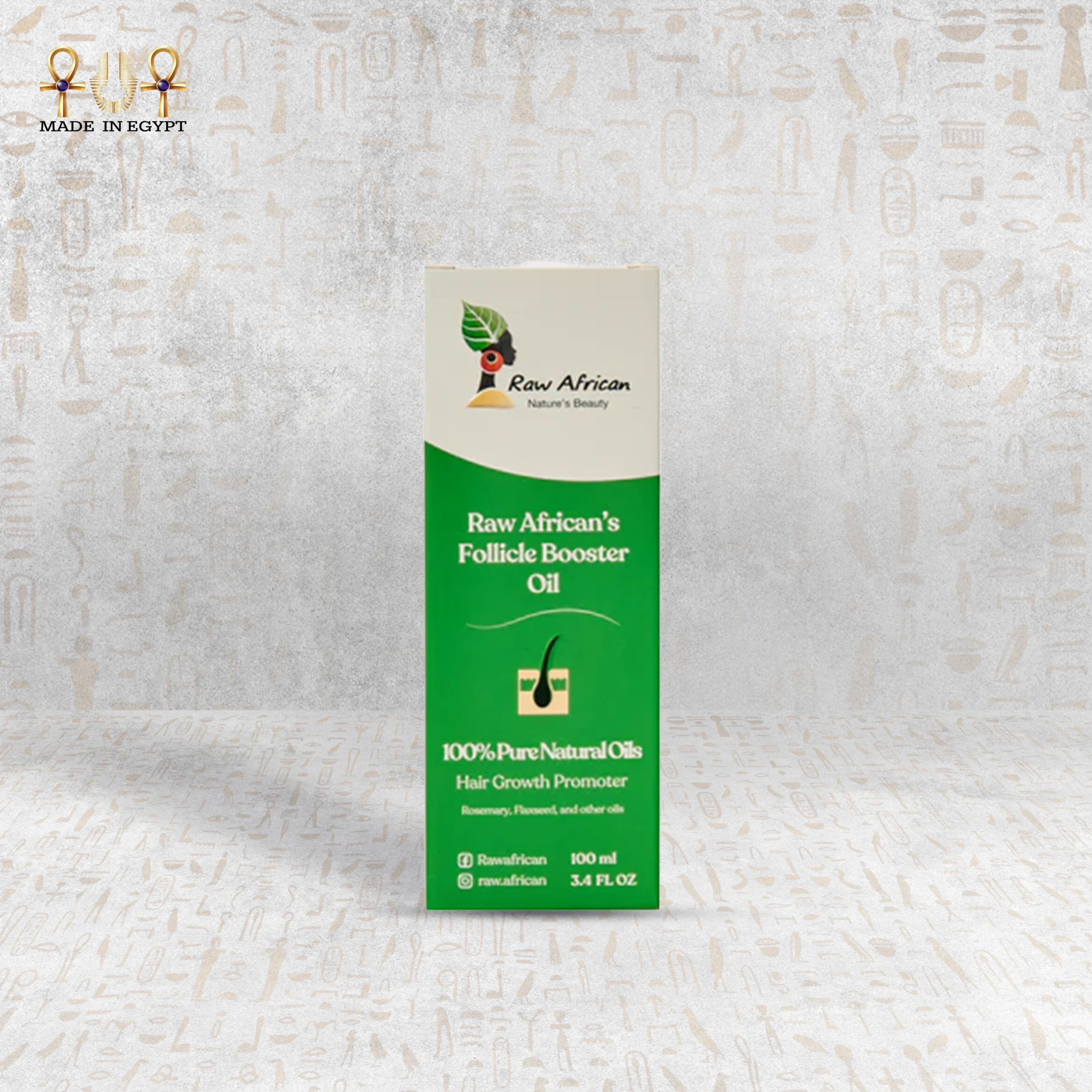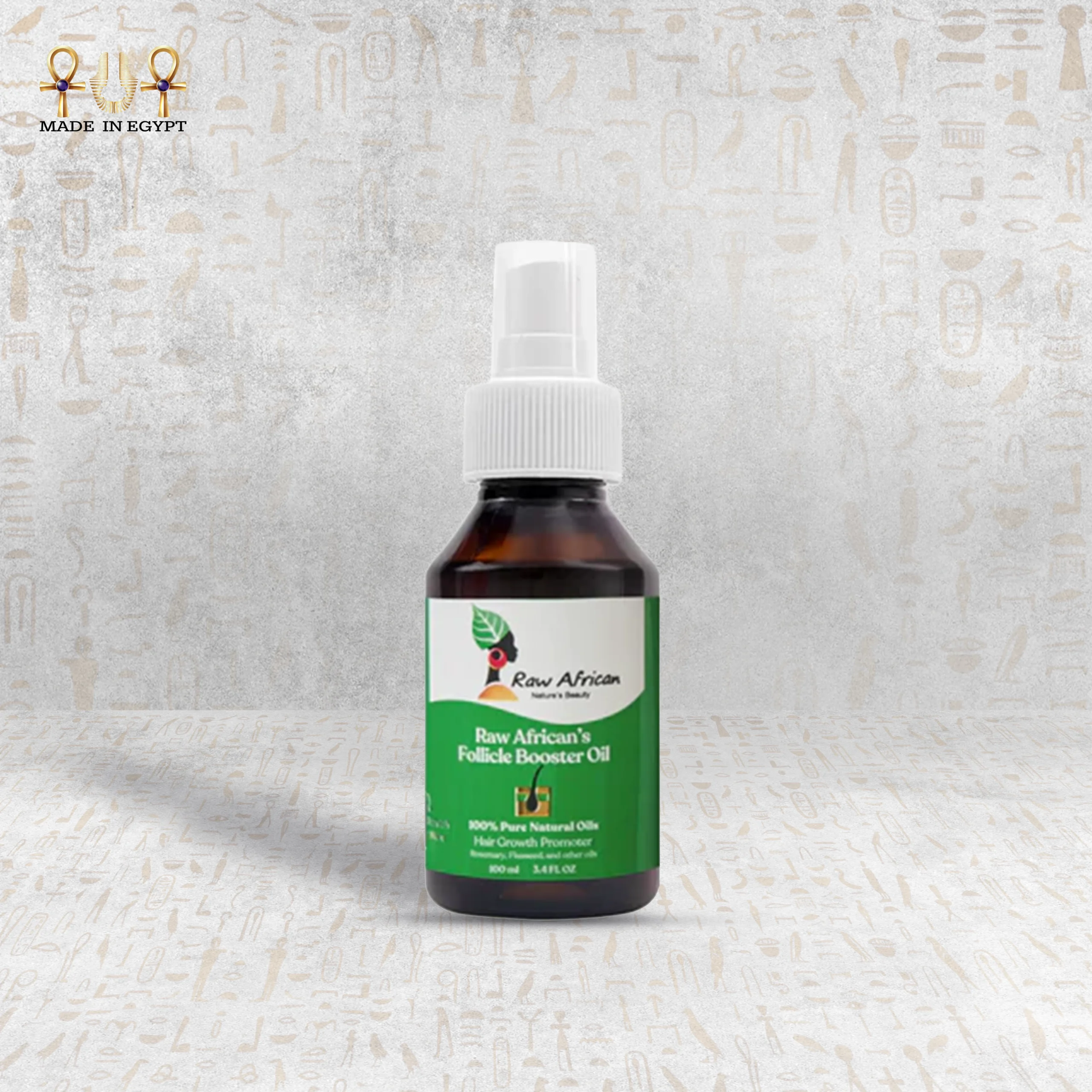 Raw African Hair Follicle Booster Oil is a natural blend enriched with oils like rosemary, almond, and castor that help strengthen hair roots and promote growth. It reduces hair fall, deeply moisturizes the scalp, and improves overall hair health, leaving your hair stronger, thicker, and shinier.
