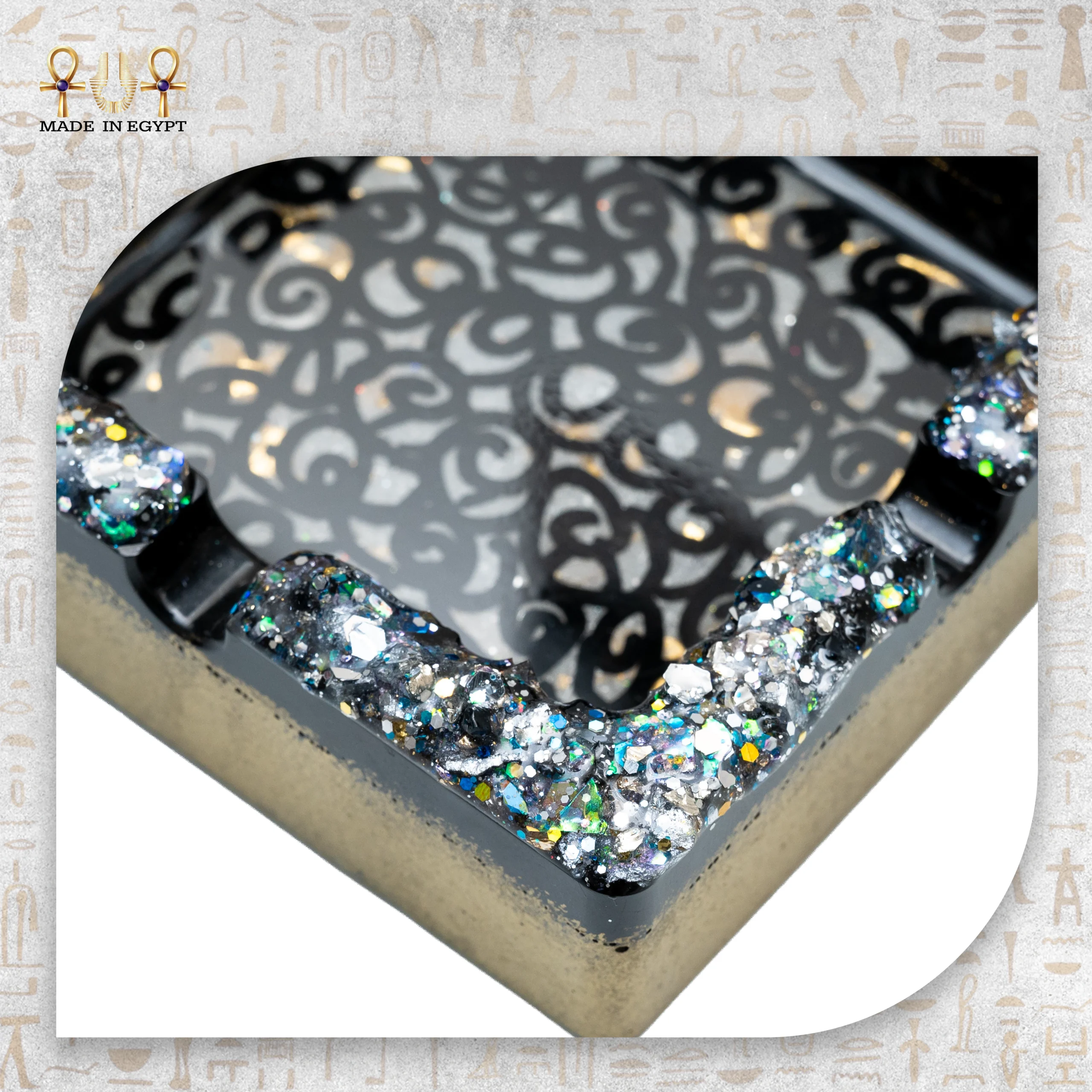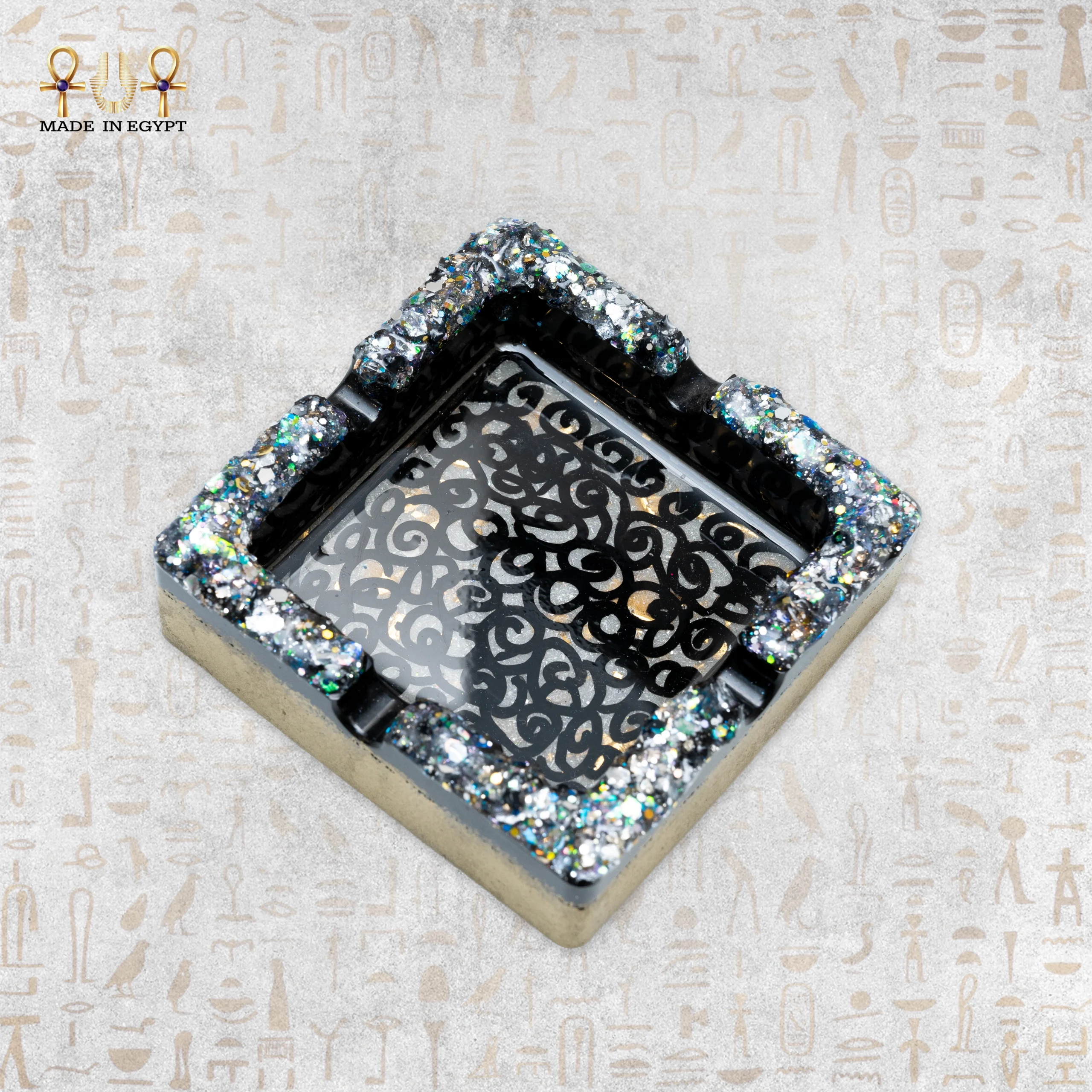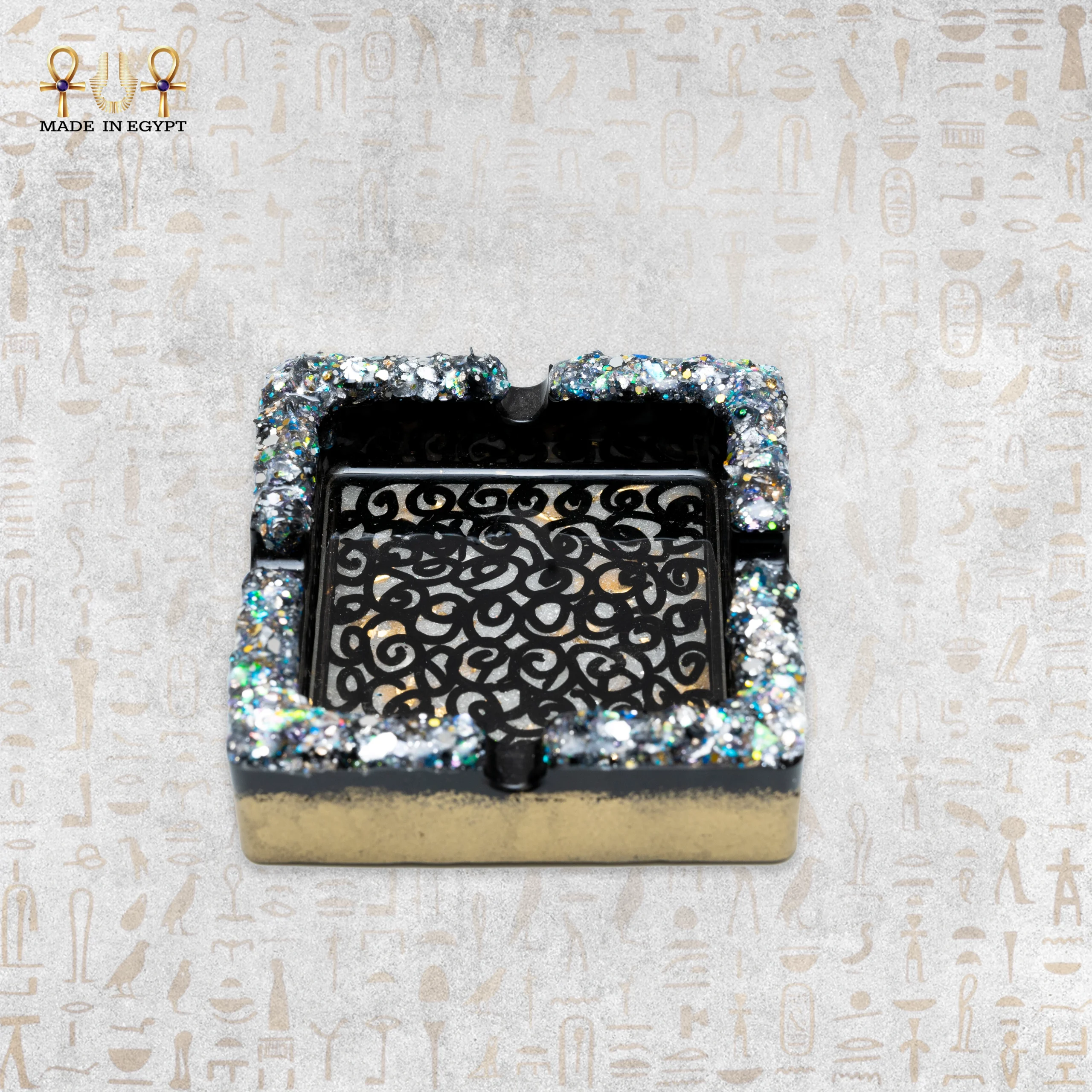 Handmade luxury resin ashtray with black crystal sparkle design and gold base. Elegant décor piece for modern interiors.
