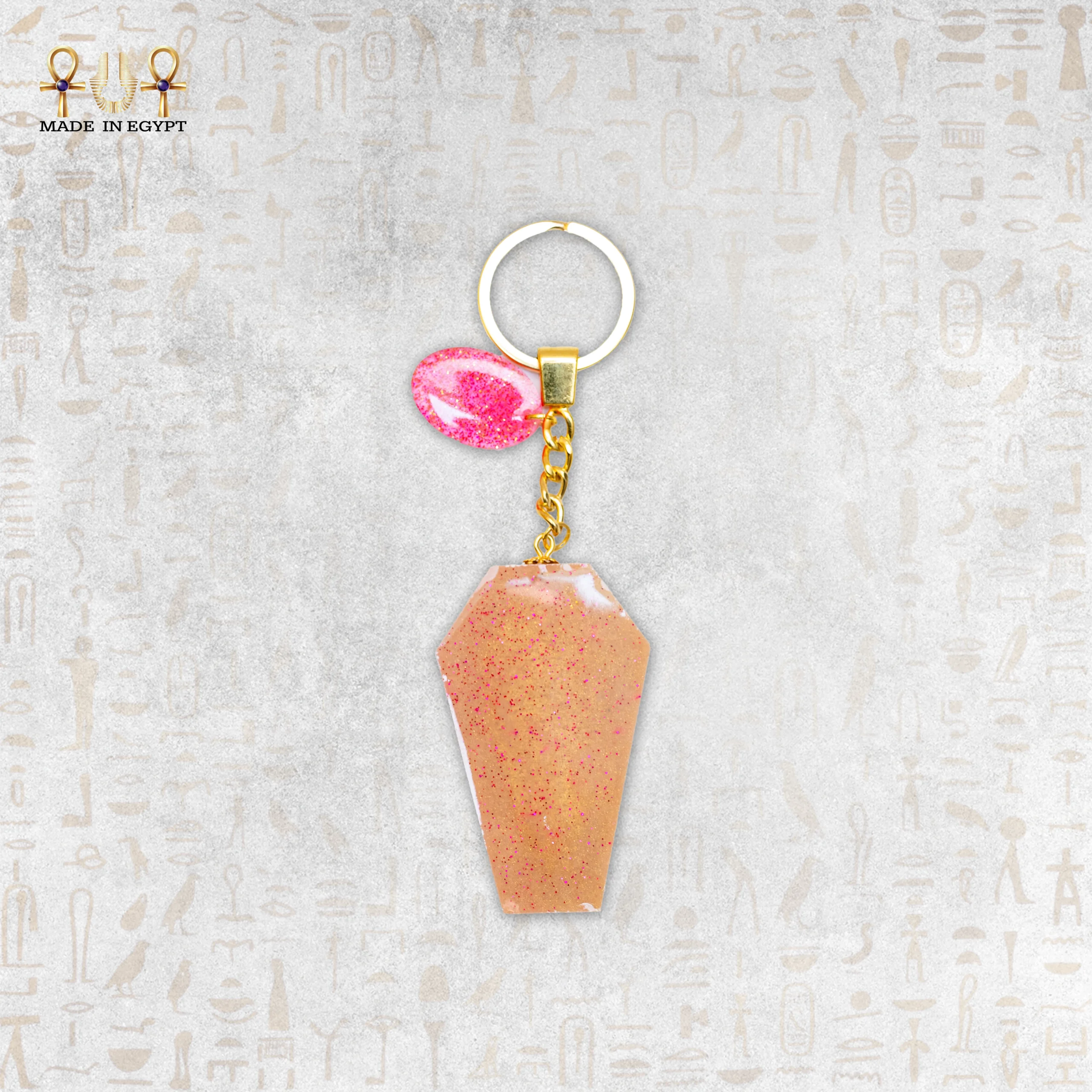 Rose Coffin Keychain is an elegant and distinctive piece inspired by ancient Egyptian heritage, featuring a pharaonic coffin design with a soft modern touch. It is handcrafted from high-quality resin in a sandy tone with subtle pink shimmer, finished with a transparent pink charm and a gold-toned metal chain. Perfect for everyday use as a keychain or as a stylish accessory for bags, and a lovely gift with a unique artistic character.