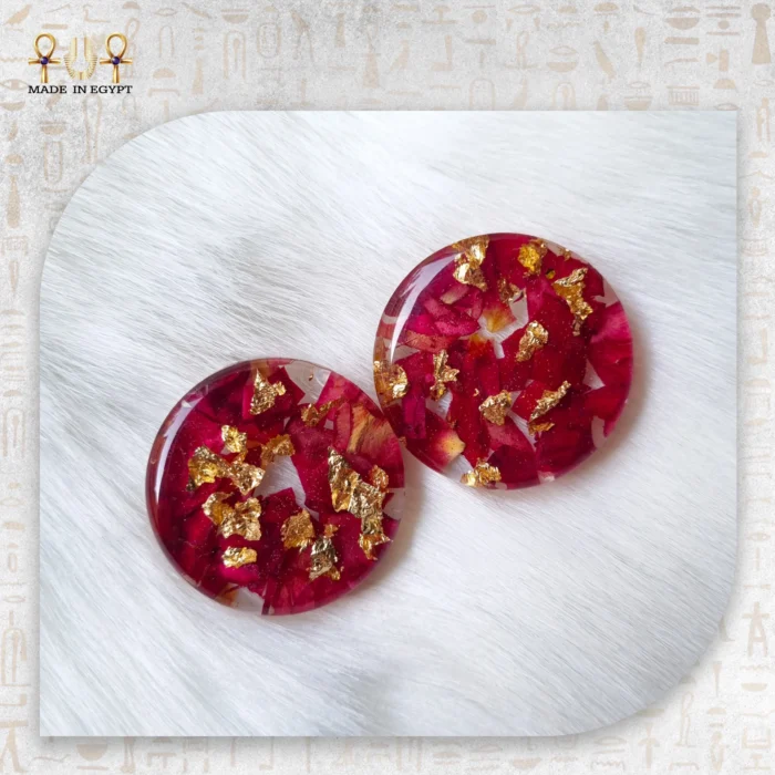يتميز الحلق بتصميمه الدائري البسيط الذي يعكس الضوء بطريقة ناعمة، مما يجعل كل قطعة تشبه عملًا فنيًا صغيرًا. خامة الريزن تمنحه لمعانًا شفافًا يدوم طويلًا، بينما تضيف رقائق الذهب بريقًا راقيًا دون مبالغة. كل قطعة تُصنع يدويًا بحرفية عالية، مما يجعل كل زوج من الأقراط فريدًا بتوزيع مختلف للورود وورق الذهب، ليكون مميزًا وغير مكرر.