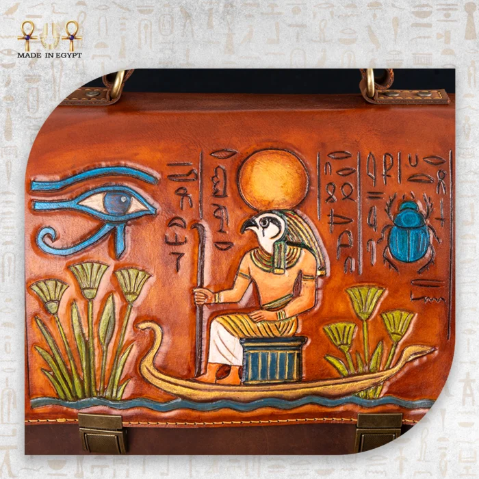 شنطة لابتوب فاخرة من جلد طبيعي مشغولة يدويًا بنقوش رع الفرعونية.